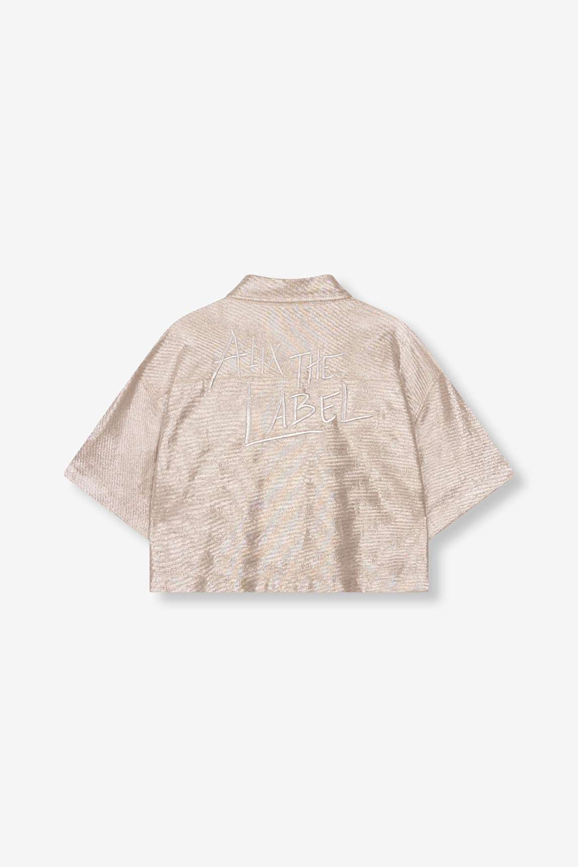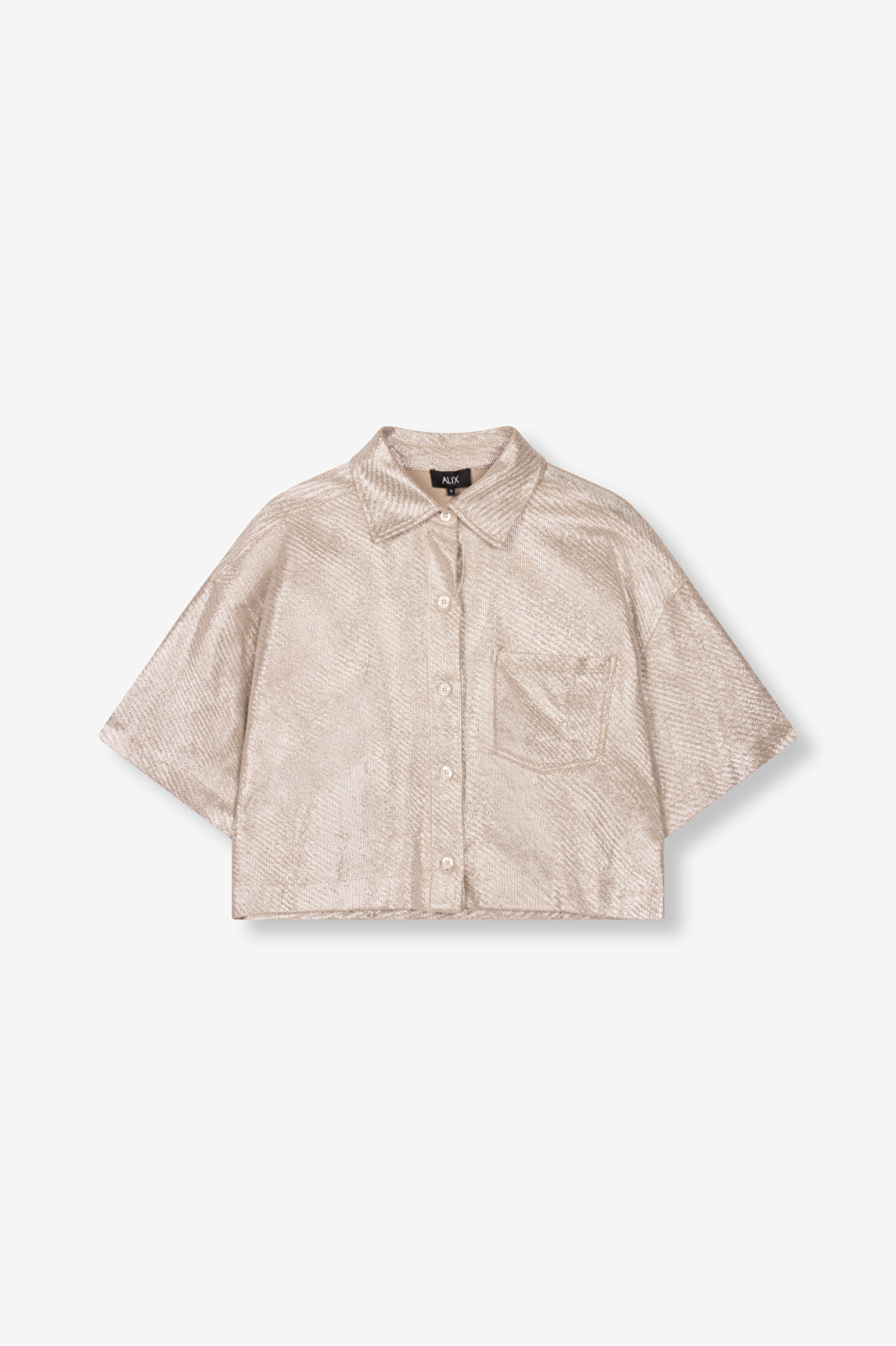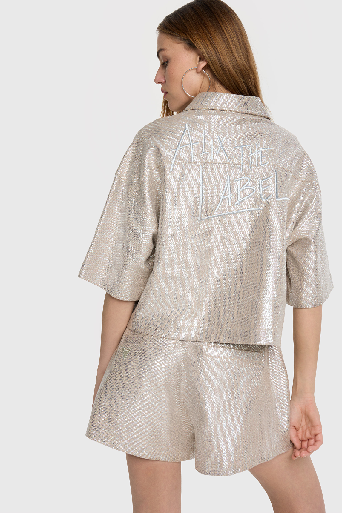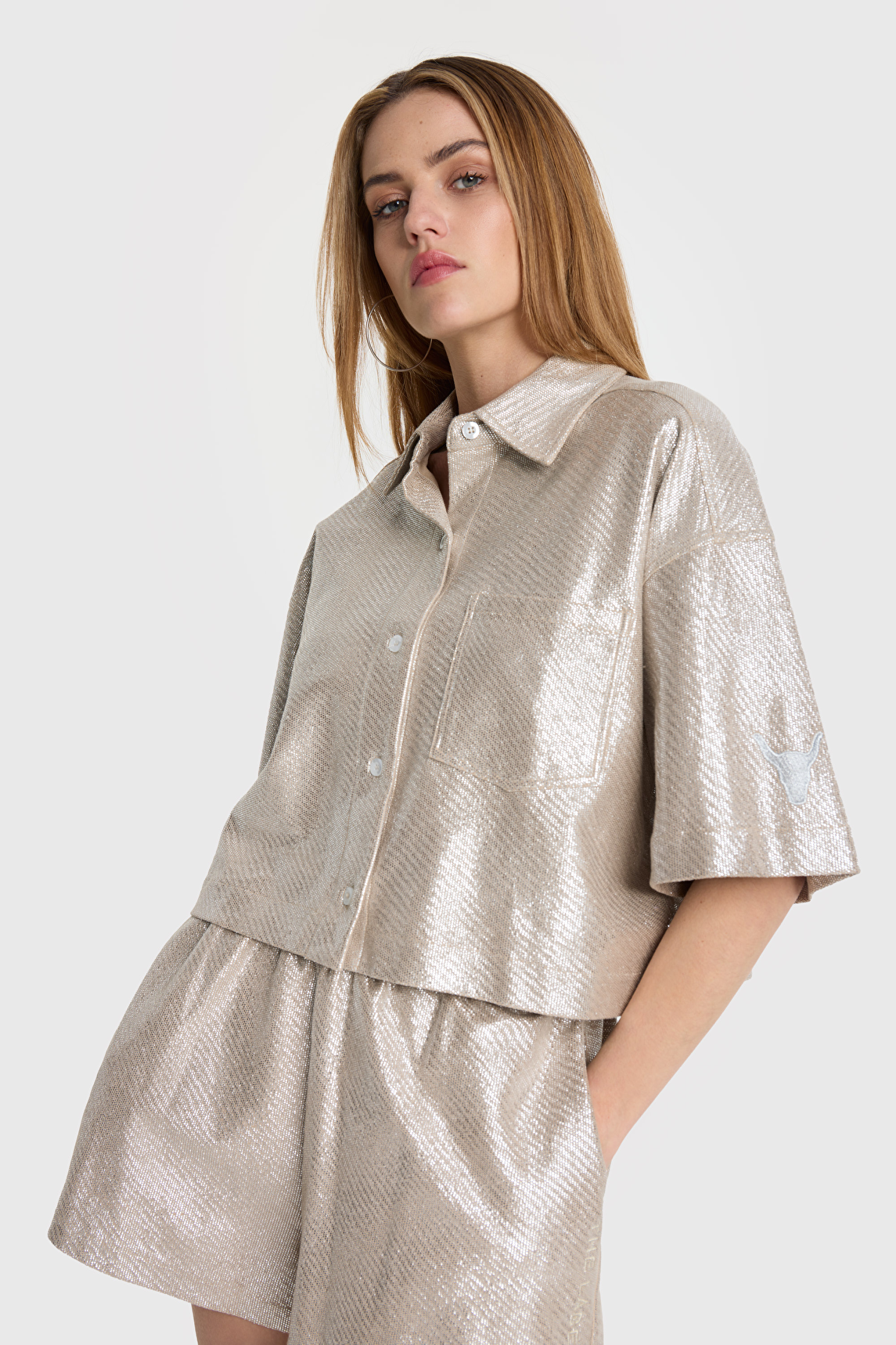 Super mooie cropped blouse van glanzende folie boucle stof. De blouse heeft korte mouwen en een knoopsluiting, ook heeft de blouse een borstzakje. De glanslaag van de blouse geeft het al een hele rijke uitstraling maar op de rug van de blouse staat een prachtig borduurwerk met de merknaam, dit geeft de blouse een ultieme rijke look. Combineer de blouse met de bijpassende short.