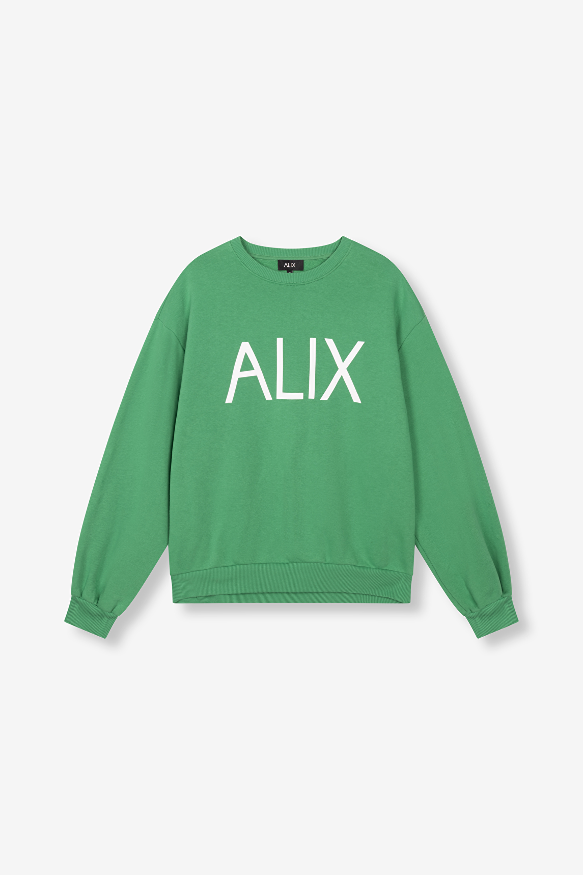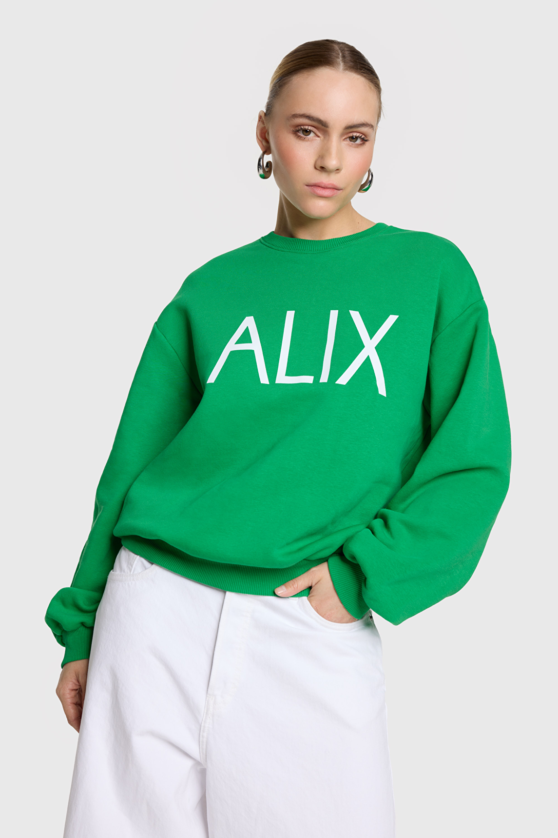 Deze te gekke trui van alix is een perfecte basic voor in de kast, de trui heeft namelijk een goeie oversized fit met ribstof boorden rond de ronde hals, mouwen en onderzijde. De trui is knal groen (bright green) van kleur met op de voorzijde in het groot het naam logo van ALIX THE LABEL.