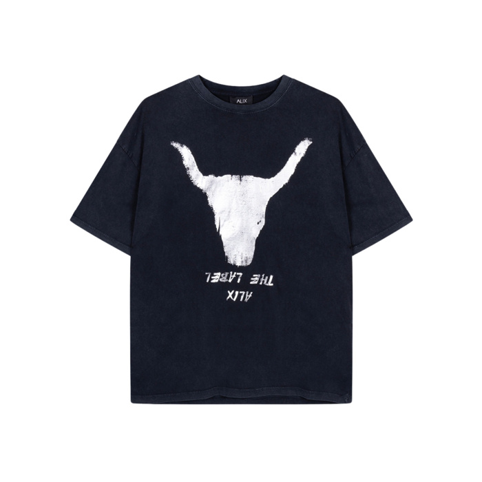 Dit mega stoere t-shirt van ALIX THE LABEL heeft een zwarte wassing wat het shirt een hele donker grijze kleur geeft, op de voorzijde van het t-shirt staat een grote zilveren metallic folie opdruk met de bekende bull waar het merk bekend om staat, onder deze opdruk staat de tekst ALIX THE LABEL in spiegelbeeld. Het t-shirt heeft korte mouwen en een ronde hals.