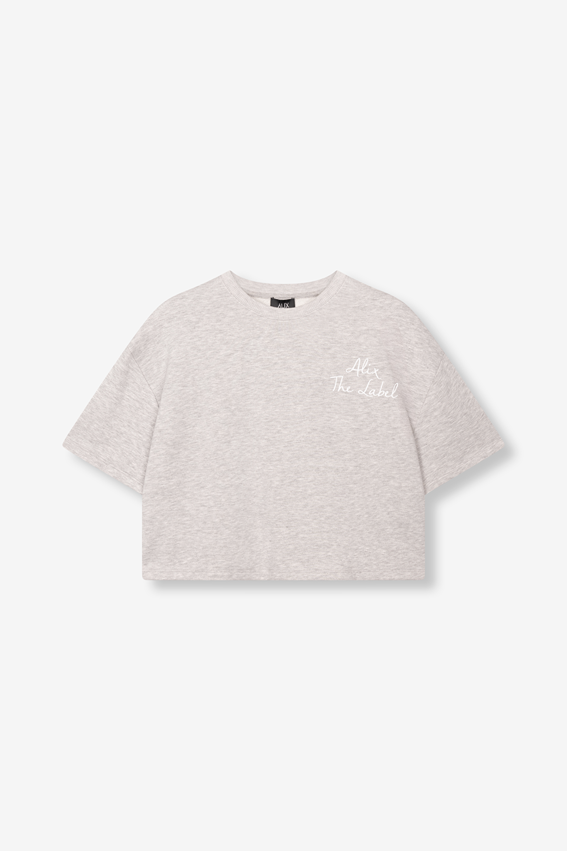 Dit heerlijke shirt is grijs gemeleerd van kleur, heeft korte mouwen en een ronde boord bij de hals. Het shirt heeft op de borst een witte opdruk met de merknaam alix the label erop in sierletters. Het shirt heeft een relaxed fit, combineer deze samen met de bijpassende short voor een heerlijke comfy look.