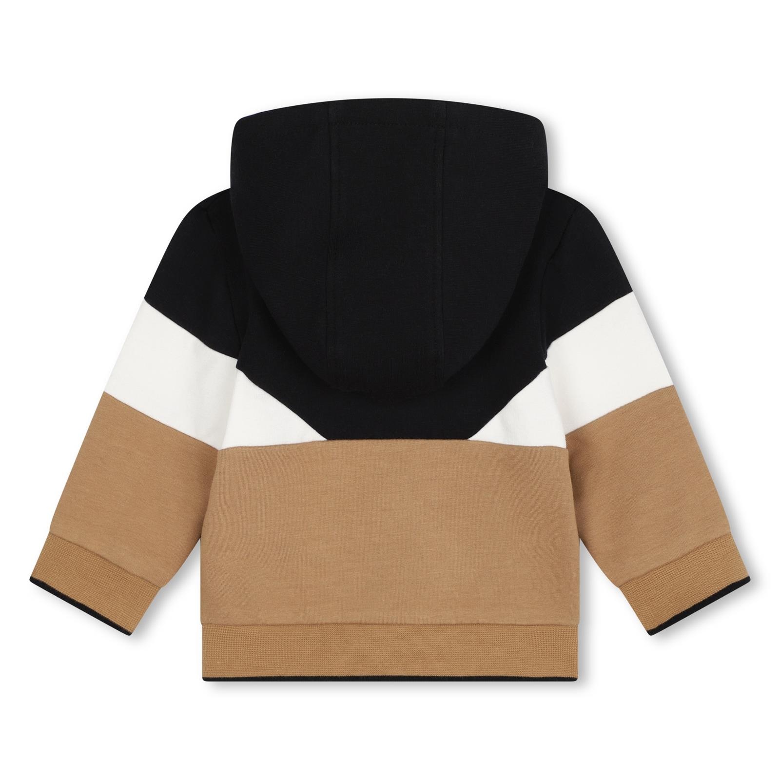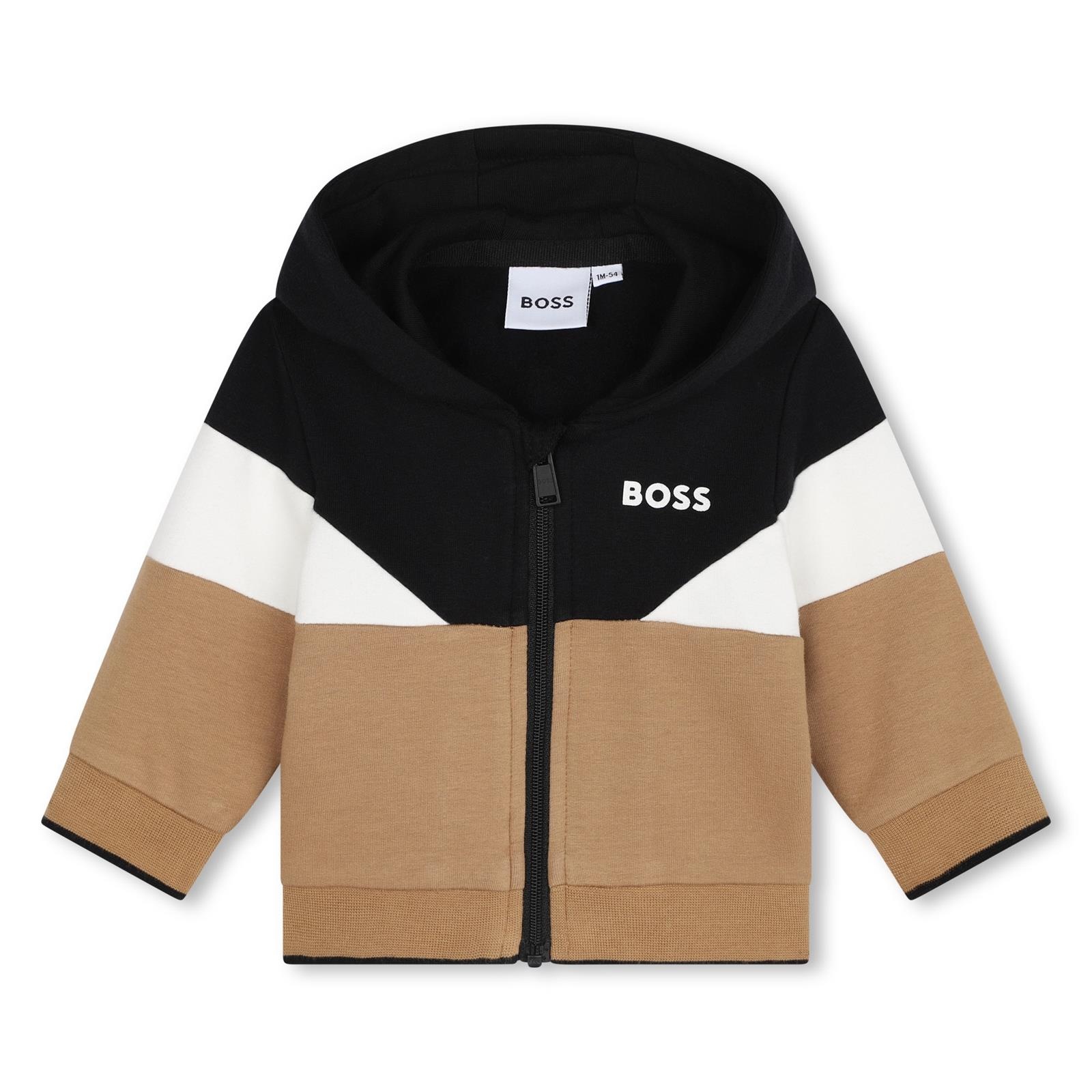 deze heerlijke set van het klassieke merk BOSS bestaat uit een capuchon vest, joggingbroek en long sleeve t-shirt. Het capuchon vest is bestaat uit de bekende drie kleuren camel, zwart en wit en heeft op de borst in witte letters BOSS gedrukt staan, ook heeft het vest een ritssluiting en elastische boorden aan de mouwen en onderzijde van het vest. De broek is camel van kleur met een zwarte streep aan de pijpen en elastische tailleband. Aan de pijpen zitten ook boorden en staat in witte letters BOSS gedrukt. Het t-shirt met lange mouwen is wit van kleur en heeft als opdruk het bekende B logo in beige en ecru gedrukt staan op de voorzijde, ook heeft het shirt drukknoopjes op de schouder staan. De set wordt met een BOSS cadeau dood geleverd.