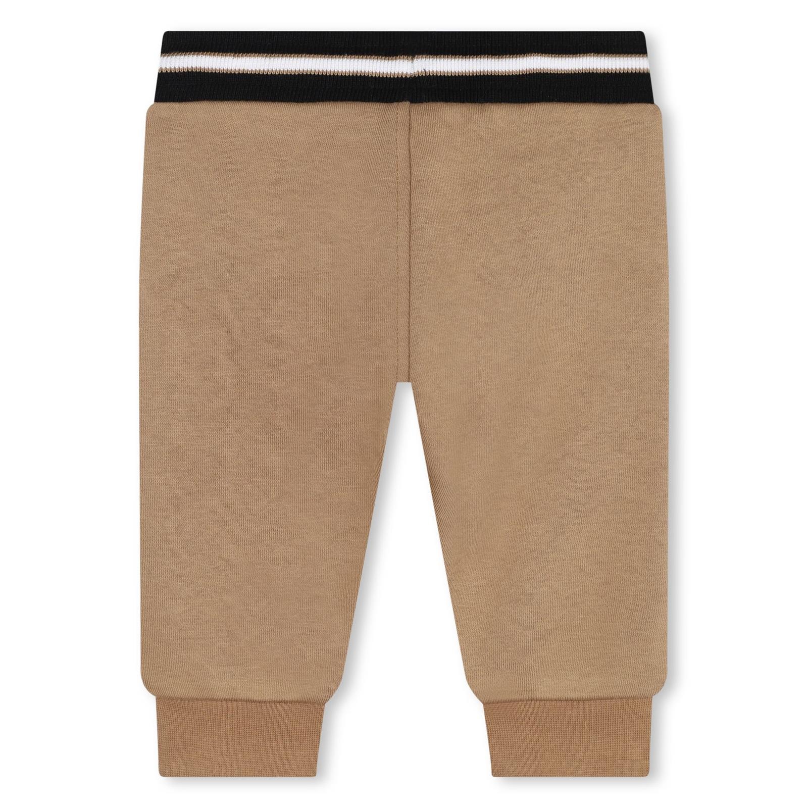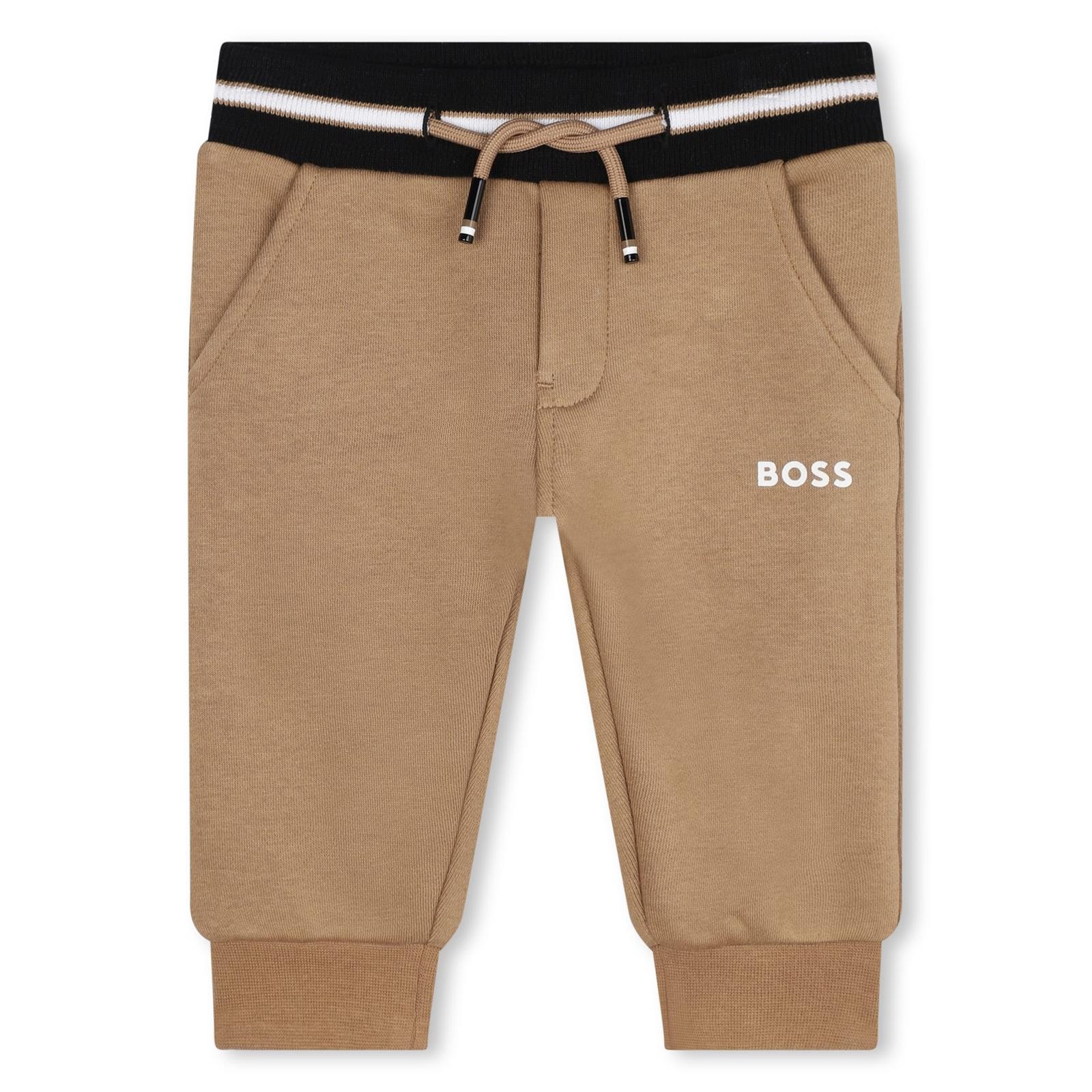 Heerlijke broek van het mooie merk BOSS, de broek is camel van kleur met een elastische verstelbare tailleband in het zwart met wit/camel kleur en een camel veter. De broek heeft steekzakken en boorden aan de pijpen. Onder de linker steekzak staat in witte letters de merknaam BOSS gedrukt. Combineer de broek met het bijpassende vest en t-shirt voor een complete set. De broek is geschikt voor de kleinste baby's tot peuters.