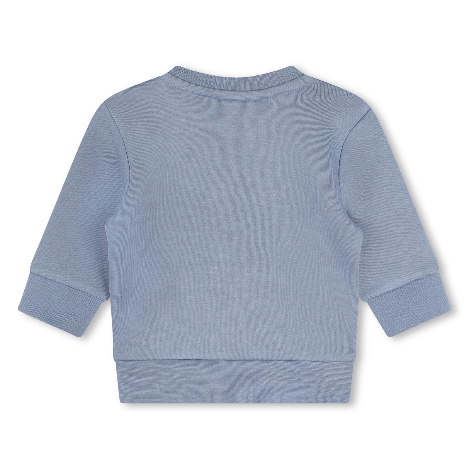 Gave blauwe sweater met witte opdruk, de opdruk is van rubber en wit van kleur. Op de indruk staat de merknaam BOSS in grote letters en eronder in een jaren 70 lettertype SEVENTY7. De trui heeft een ronde hals en elastische boorden aan de mouwen en onderzijde van de sweater. Op de linker schouder zitten twee drukknopen welke ervoor zorgen dat de trui super makkelijk aan en uit te trekken is. Combineer de sweater met een stoere spijkerbroek. De trui is geschikt voor de allerkleinste baby's en de liefste peuters.