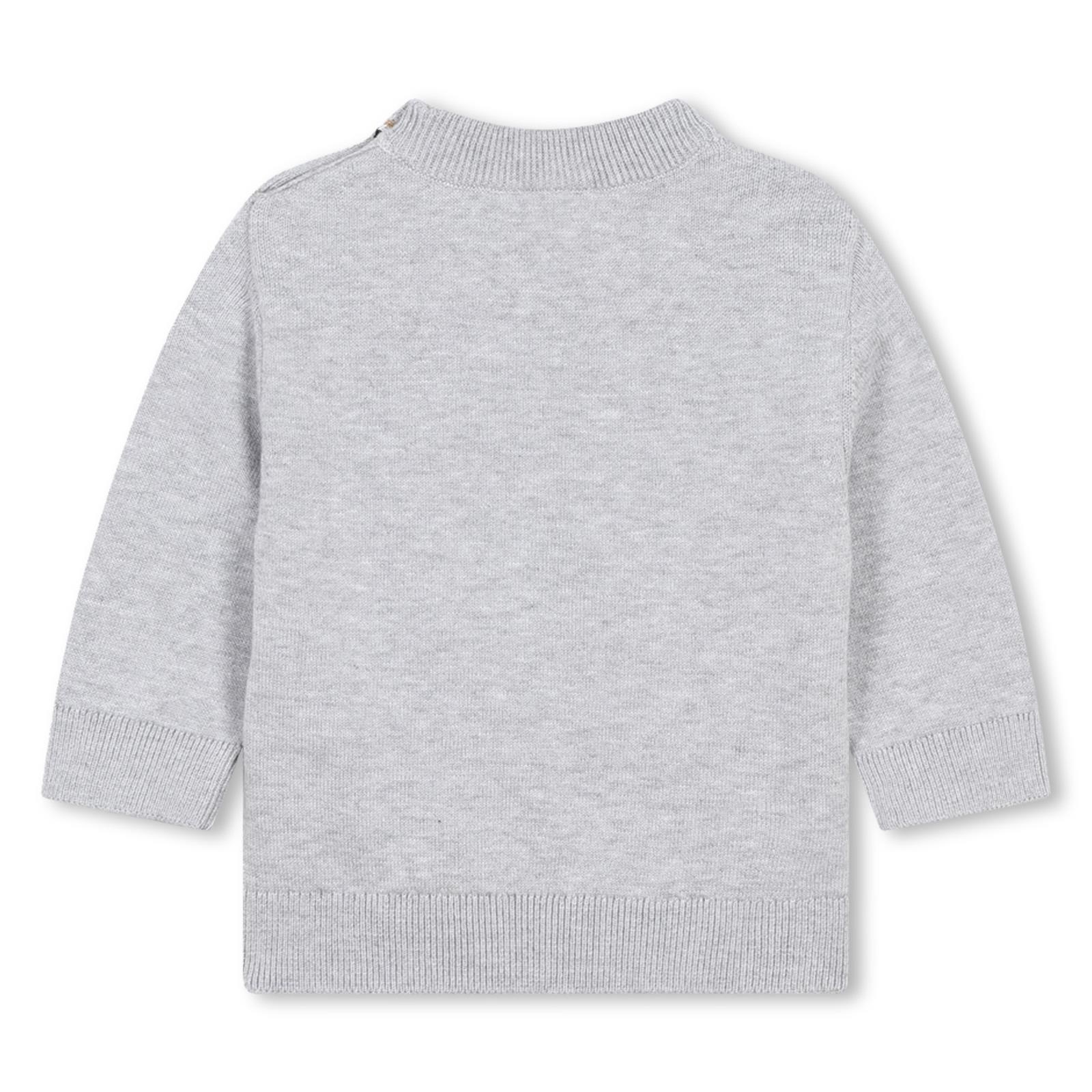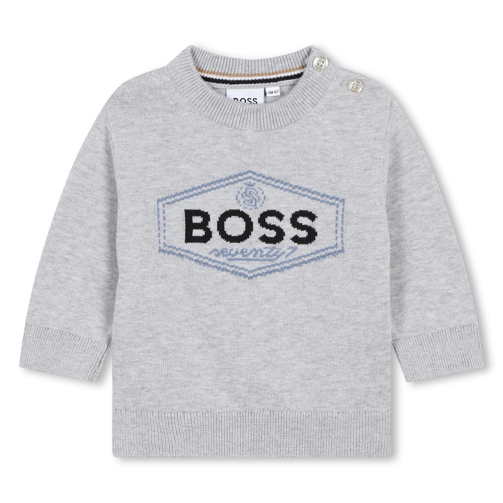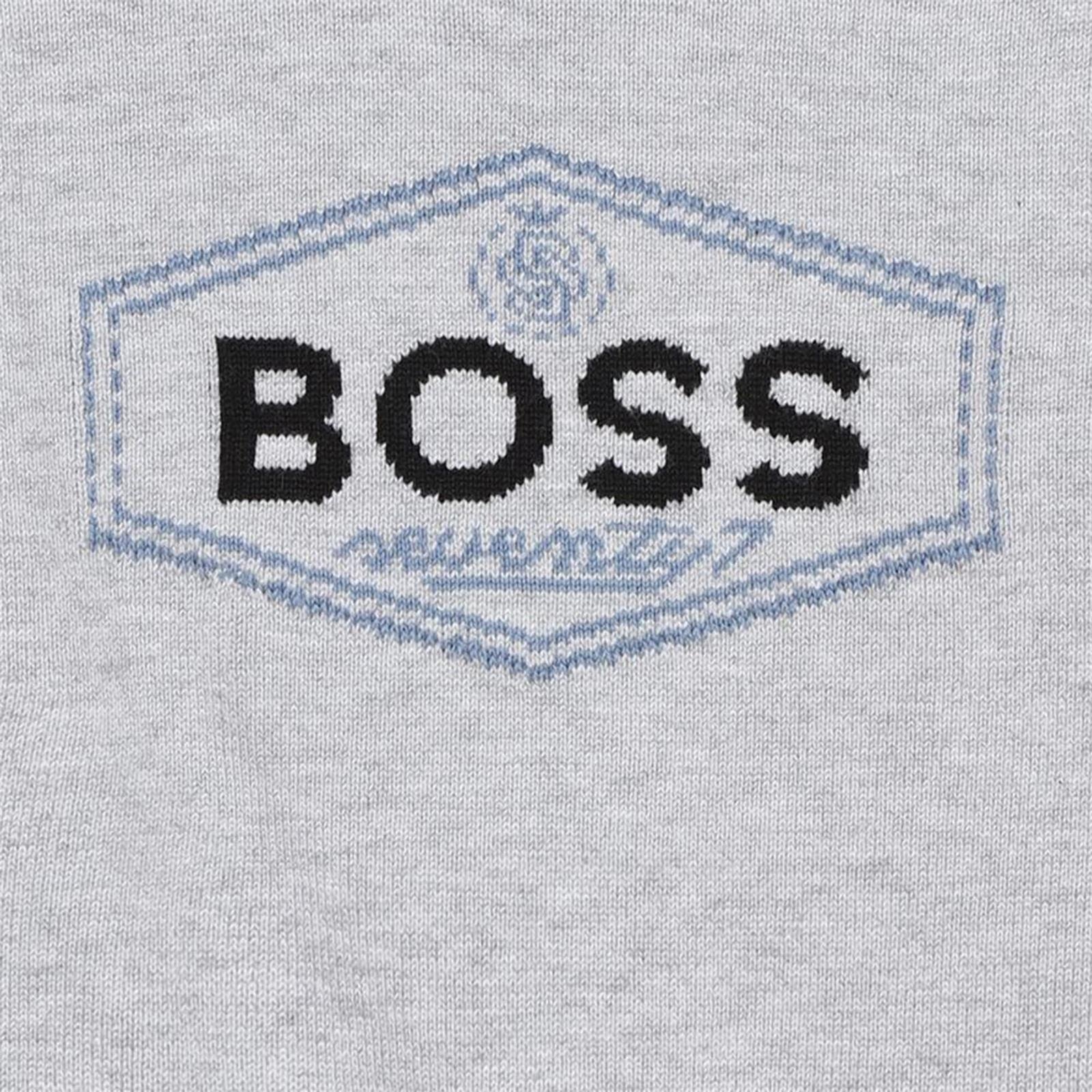 Prachtige fijn gebreide trui van het mooie klassieke merk BOSS. De sweater is grijs van kleur en heeft een afbeelding met merknaam welke in zwarte letters welke in de stof geweven is met blauwe omranding. De trui heeft een ronde rib hals en elastische rib boorden aan de mouwen en onderzijde van de trui. Ook heeft de trui twee knopen op de schouder zitten om te trui gemakkelijk over het hoofdje heen te krijgen. Combineer de knit met de mooie blauwe jeans van BOSS.