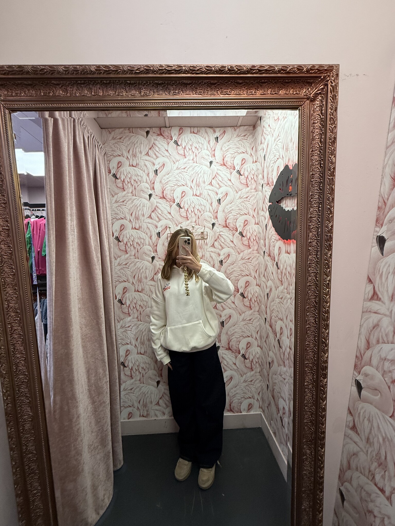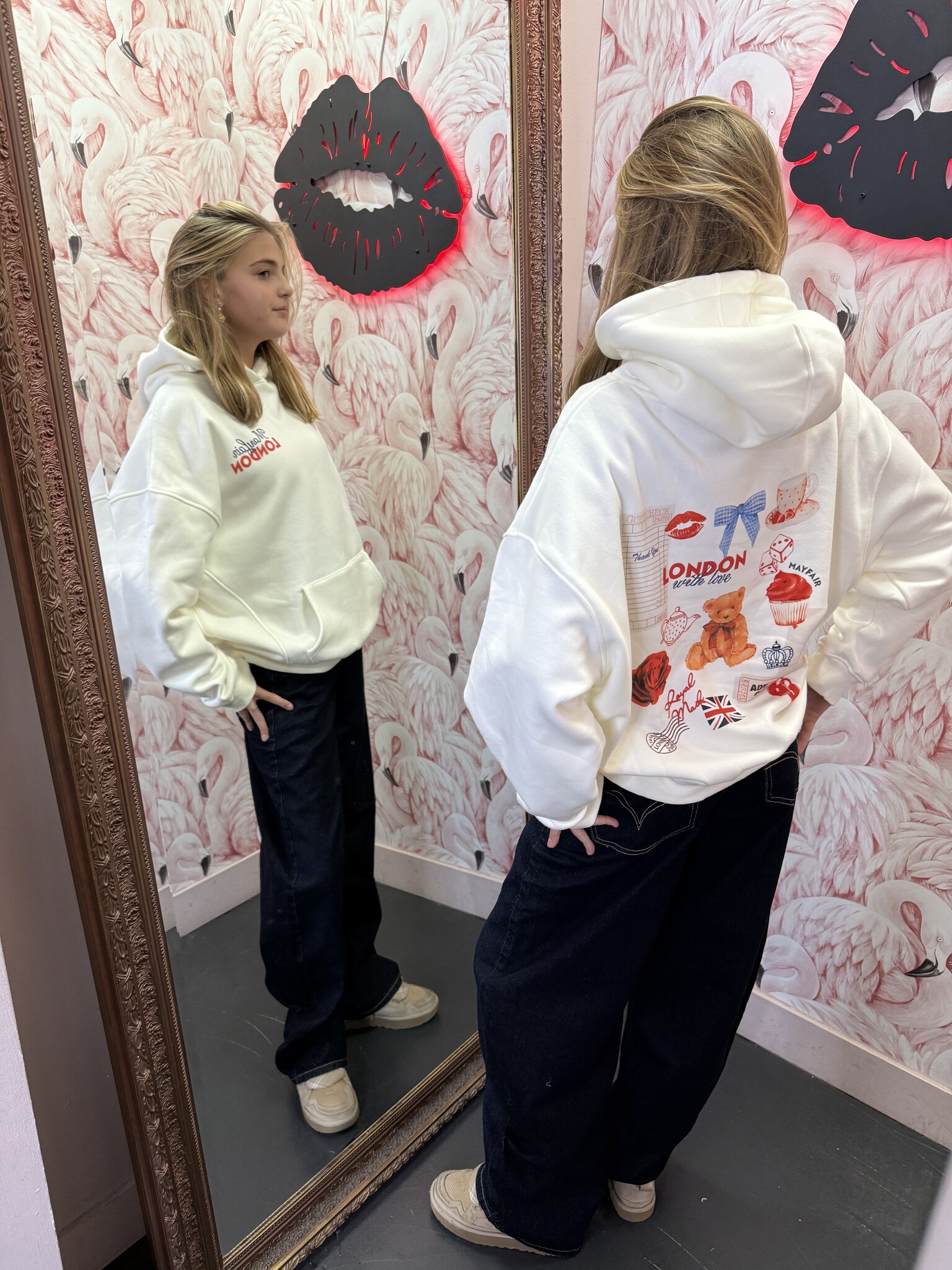 • Deze super gave trui is gebroken wit van kleur en dus een hoodie model, dit wil zeggen dat het een sweater met een capuchon is, op de voorzijde van de hoodie staat de tekst Mayfain London in de kleuren navy blauw en rood