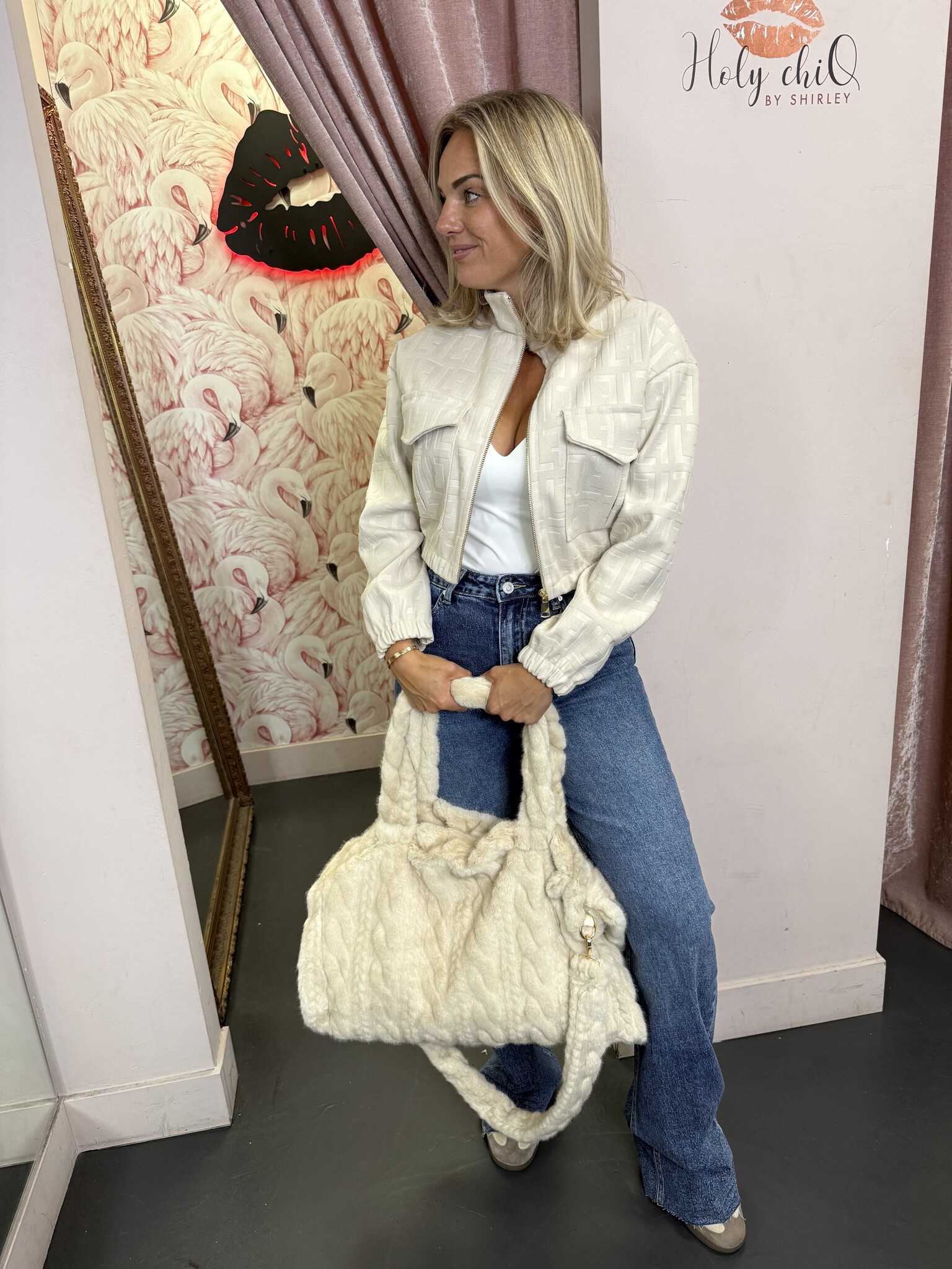 Dit super fijne jasje is een bomber model in de trend kleur taupe, het jasje is gemaakt van een vilt achtige stof waar het F patroon ingedrukt staat, dit geeft het jasje een extra dimensie door het 3D effect wat dit creëert.