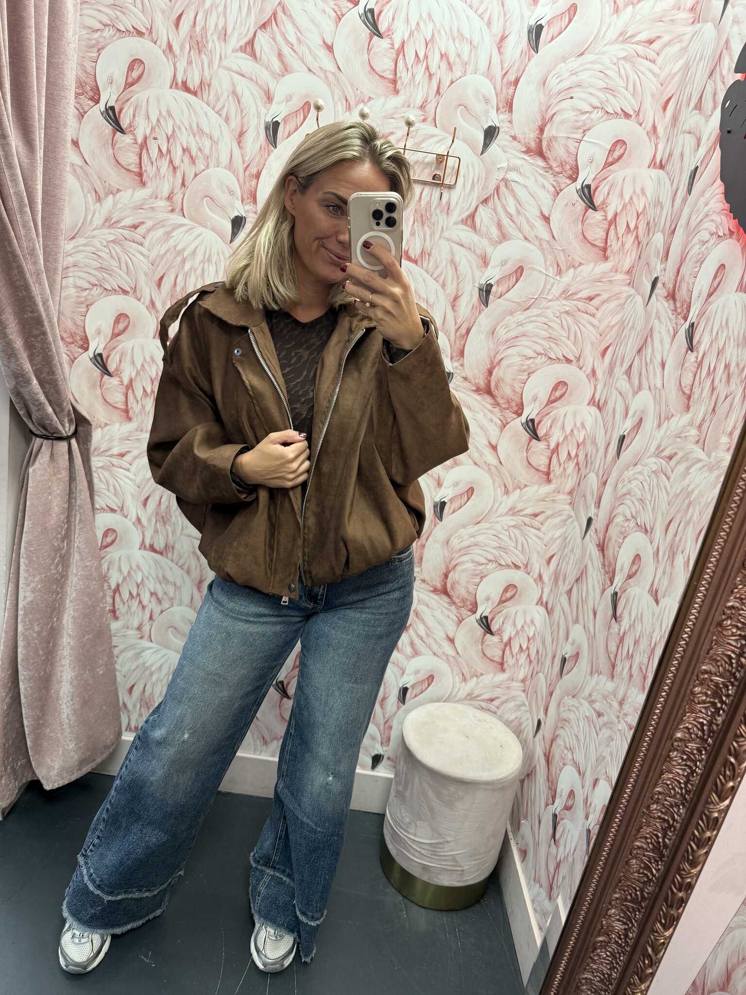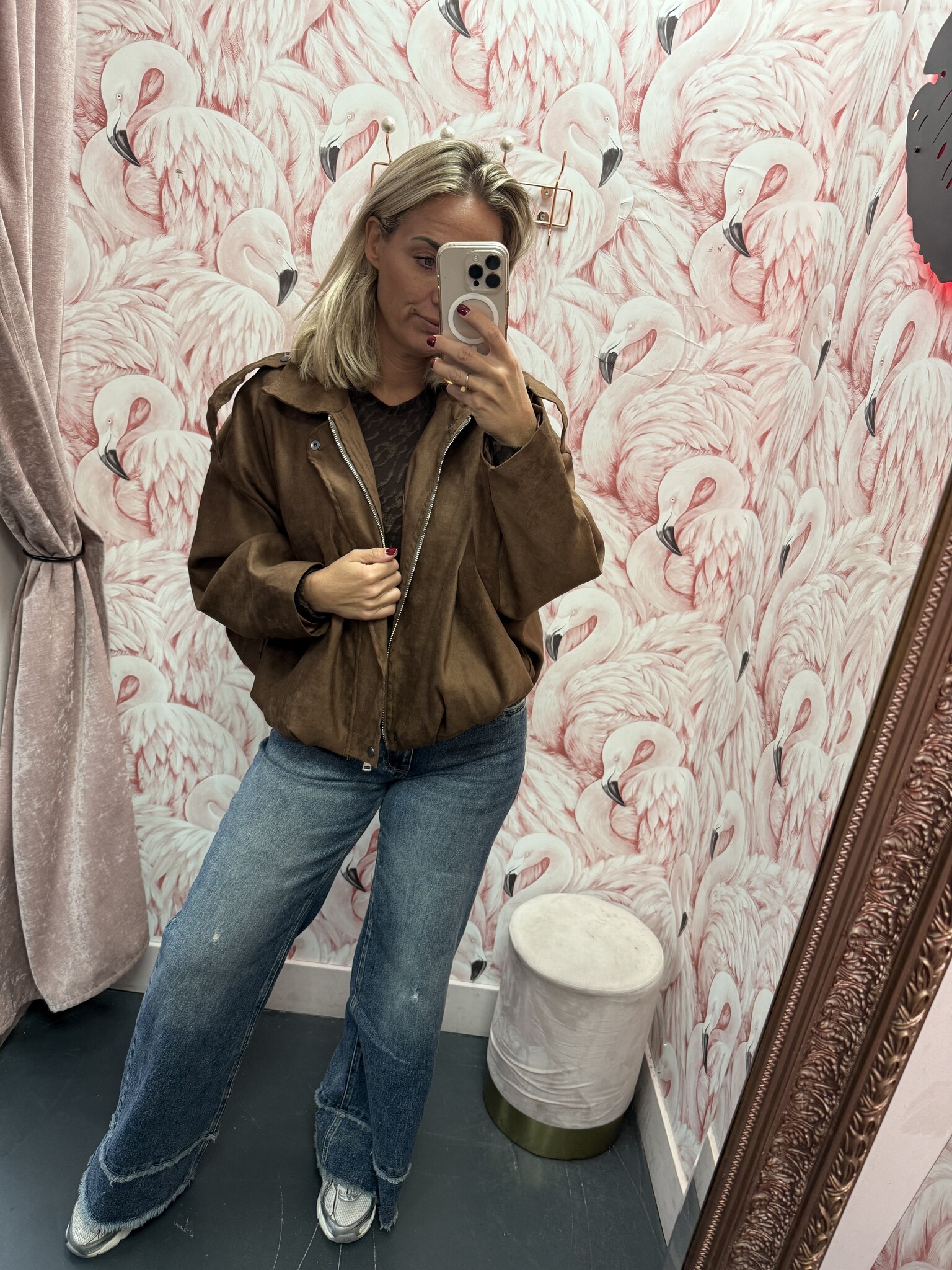 Dit gave jasje is gemaakt van suedine stof, dit geeft het jasje meteen een stoere uitstraling, de jas is afgewerkt met een zilveren ritssluiting en elastische tailleband, dit geeft het jasje de herkenbare gepofte uitstraling