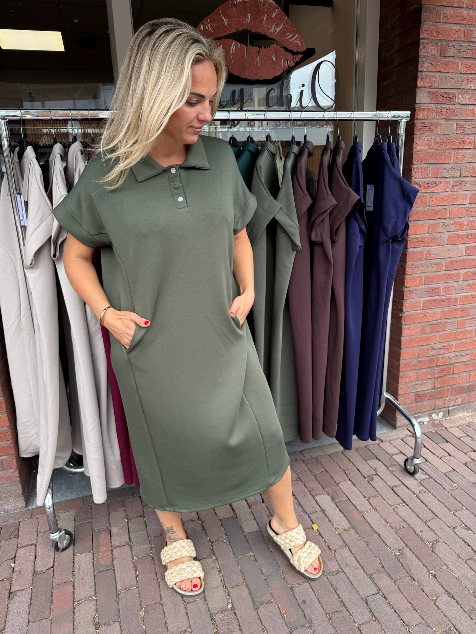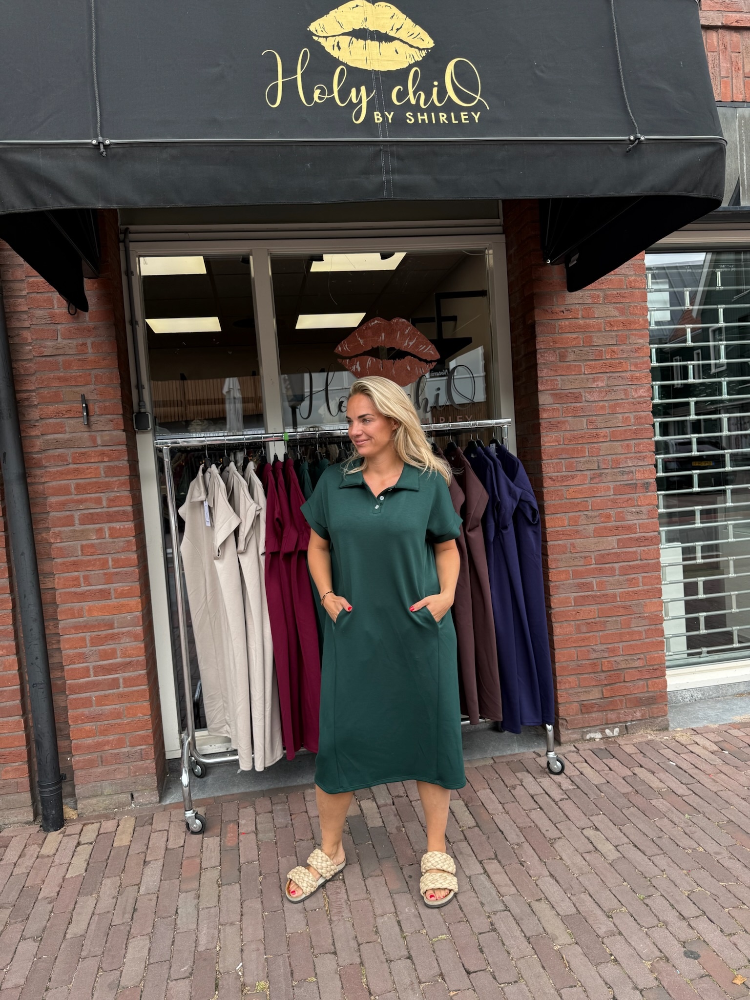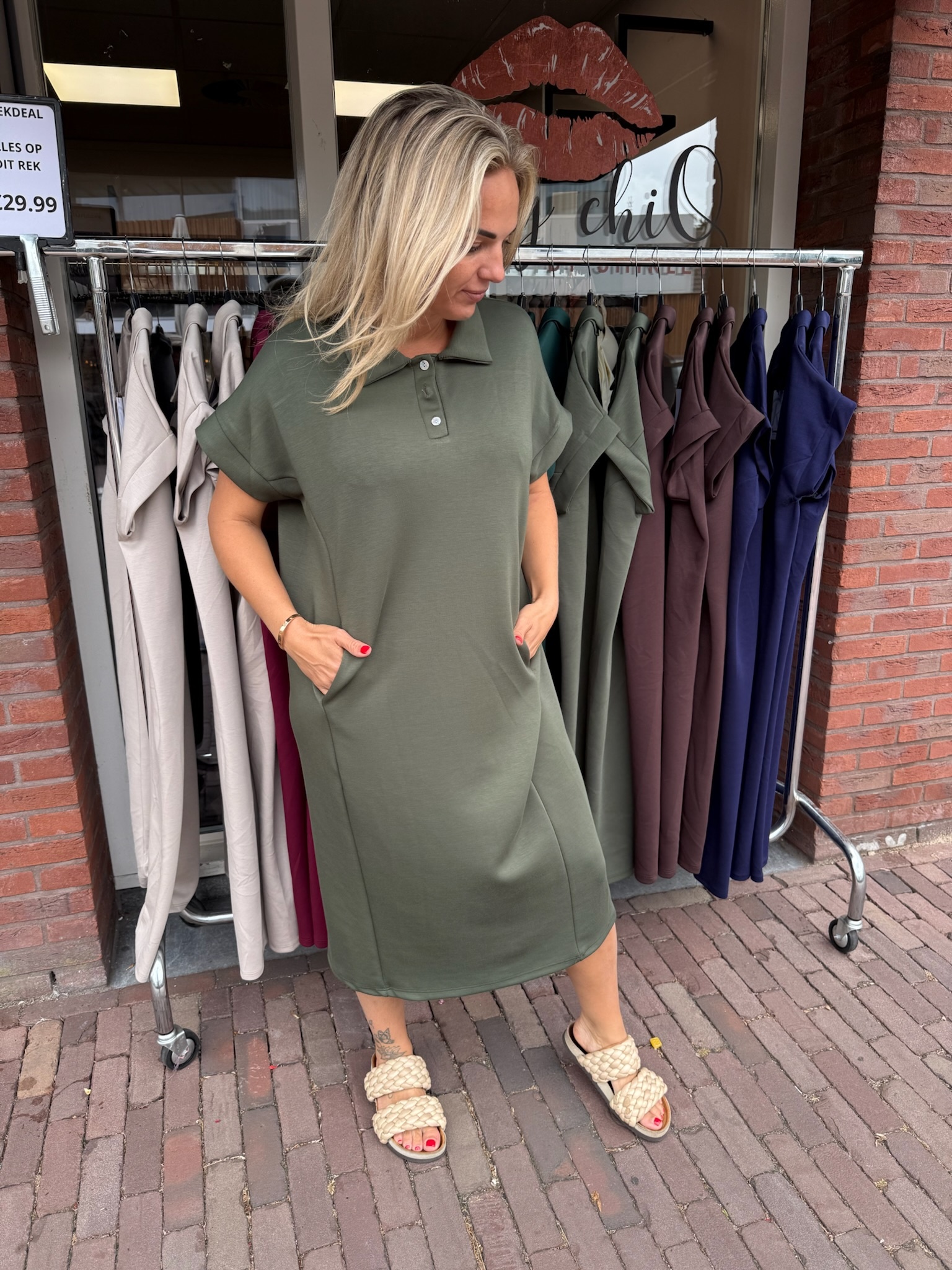 Deze heerlijke comfortabele jogging dress is gemaakt van een mega fijne en soepele stof. De jurk is halflang van lengte, heeft een polo kraag en steekzakken. Over de lengte van de jurk lopen aan beide kanten een naad wat ervoor zorgt dat de jurk optisch slanker maakt. De jurk is one size maar te dragen tot ongeveer maat 44/46.