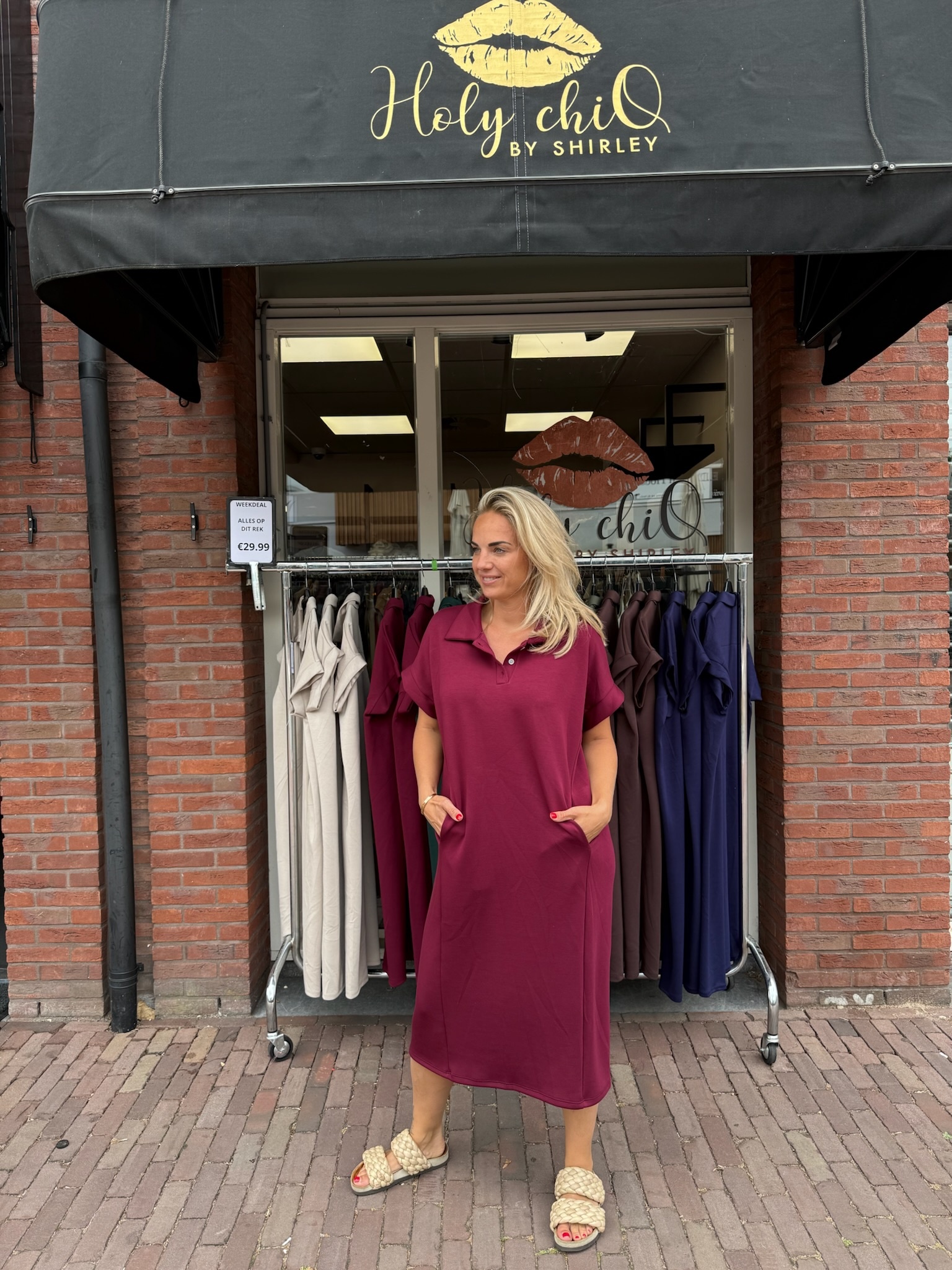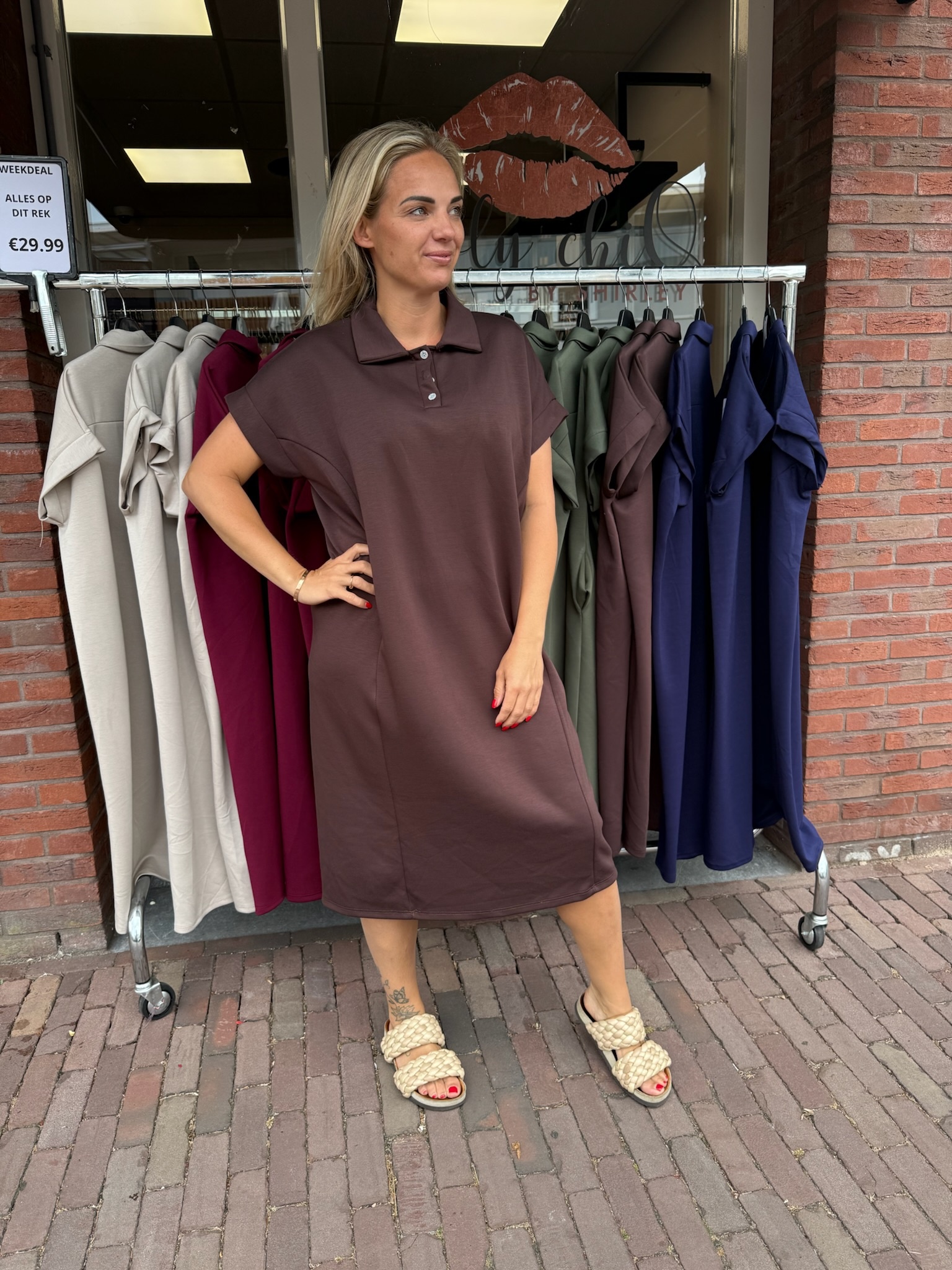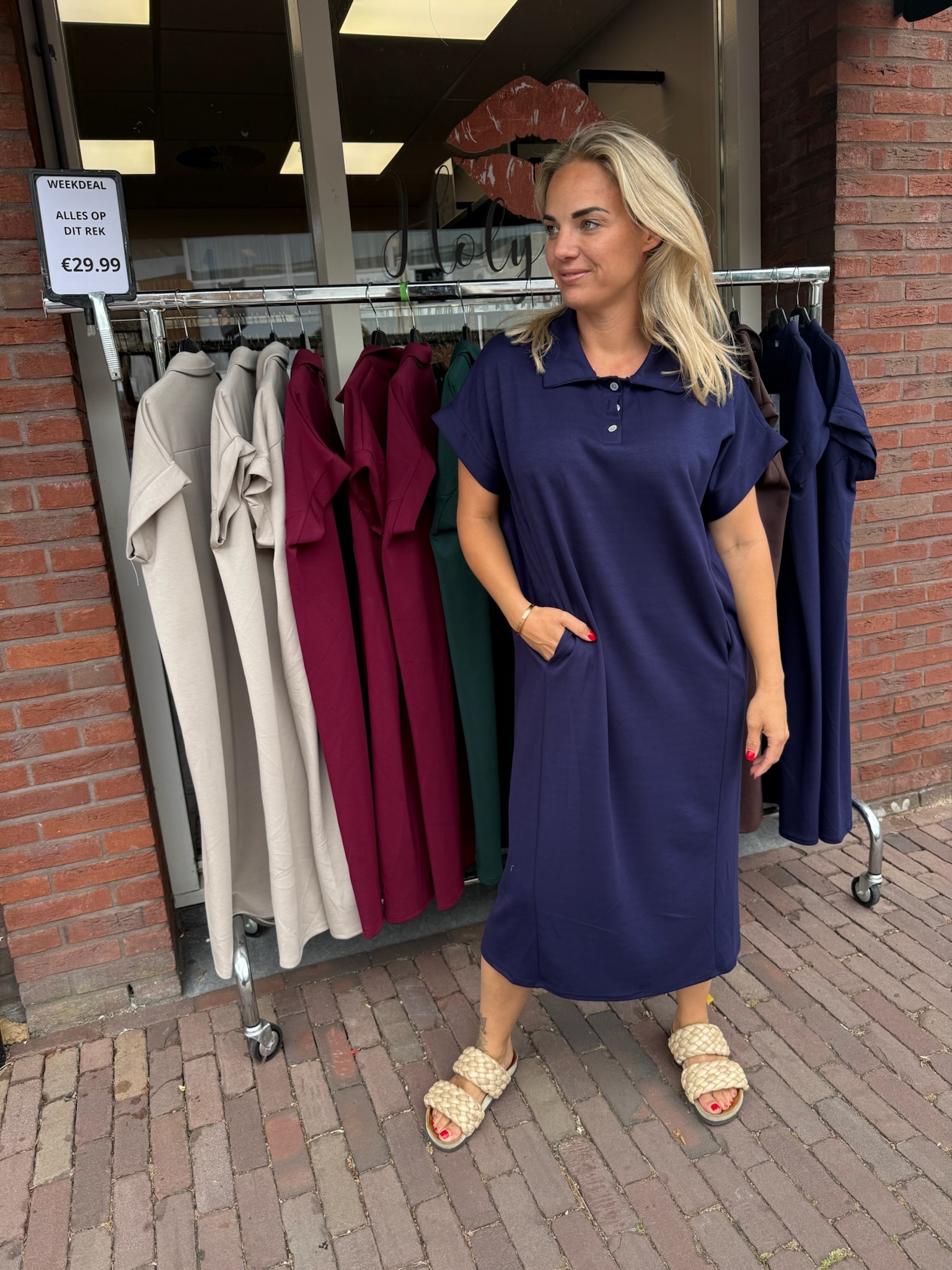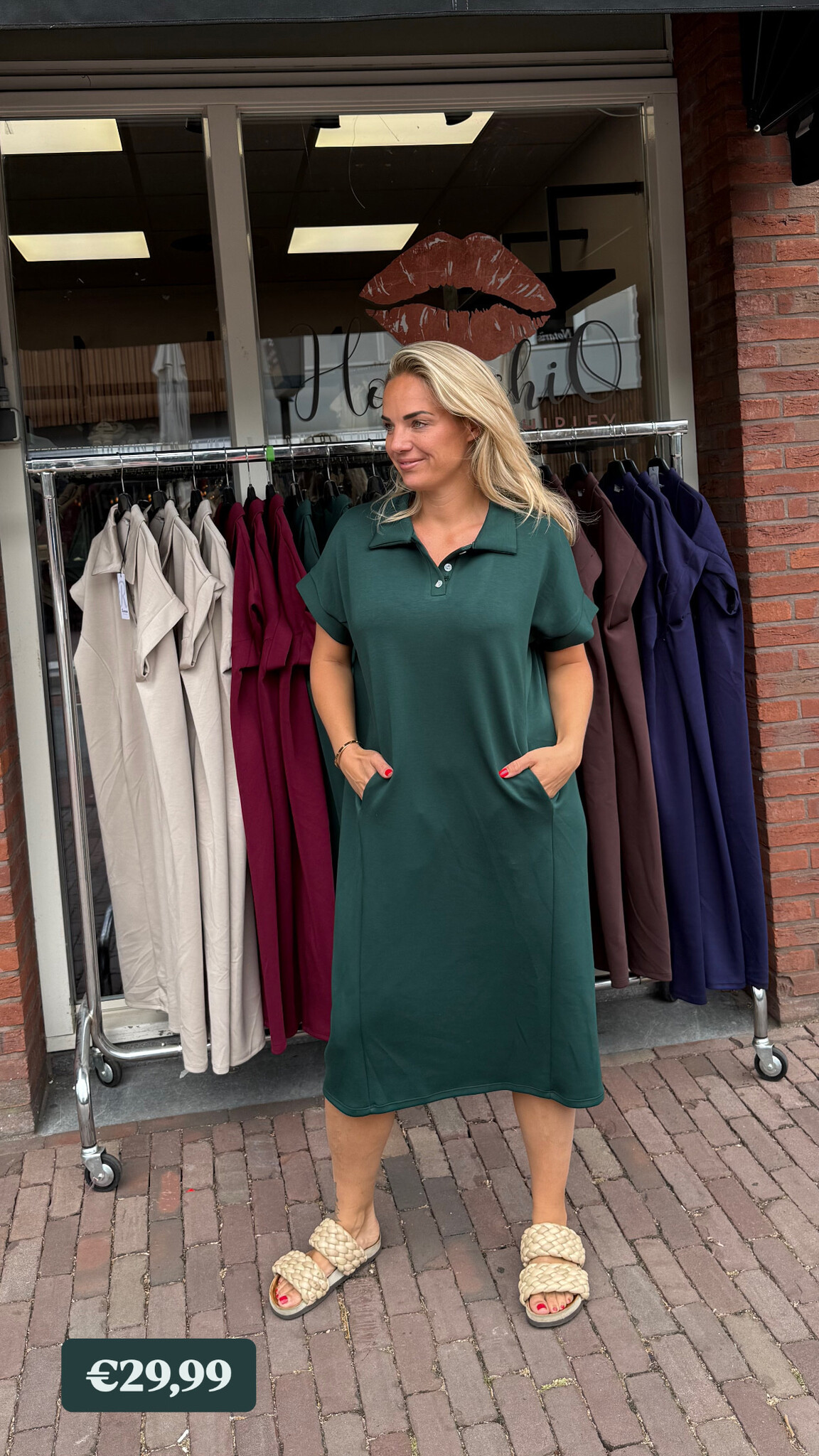 Deze heerlijke comfortabele jogging dress is gemaakt van een mega fijne en soepele stof. De jurk is halflang van lengte, heeft een polo kraag en steekzakken. Over de lengte van de jurk lopen aan beide kanten een naad wat ervoor zorgt dat de jurk optisch slanker maakt. De jurk is one size maar te dragen tot ongeveer maat 44/46.