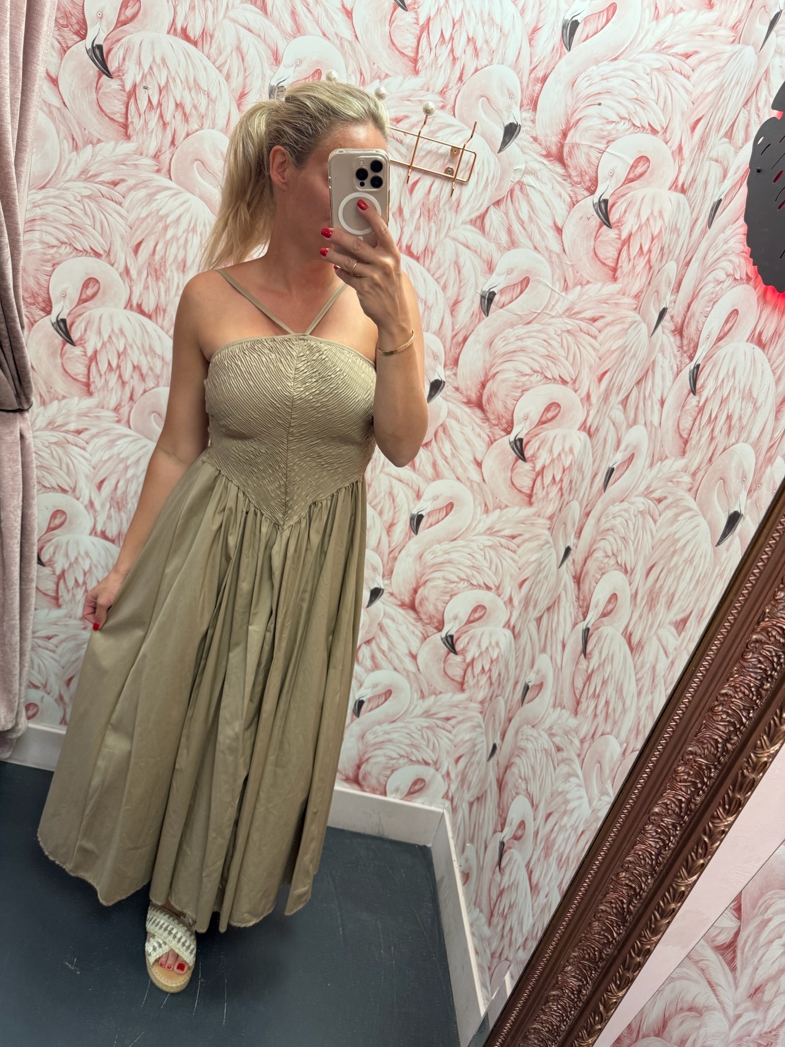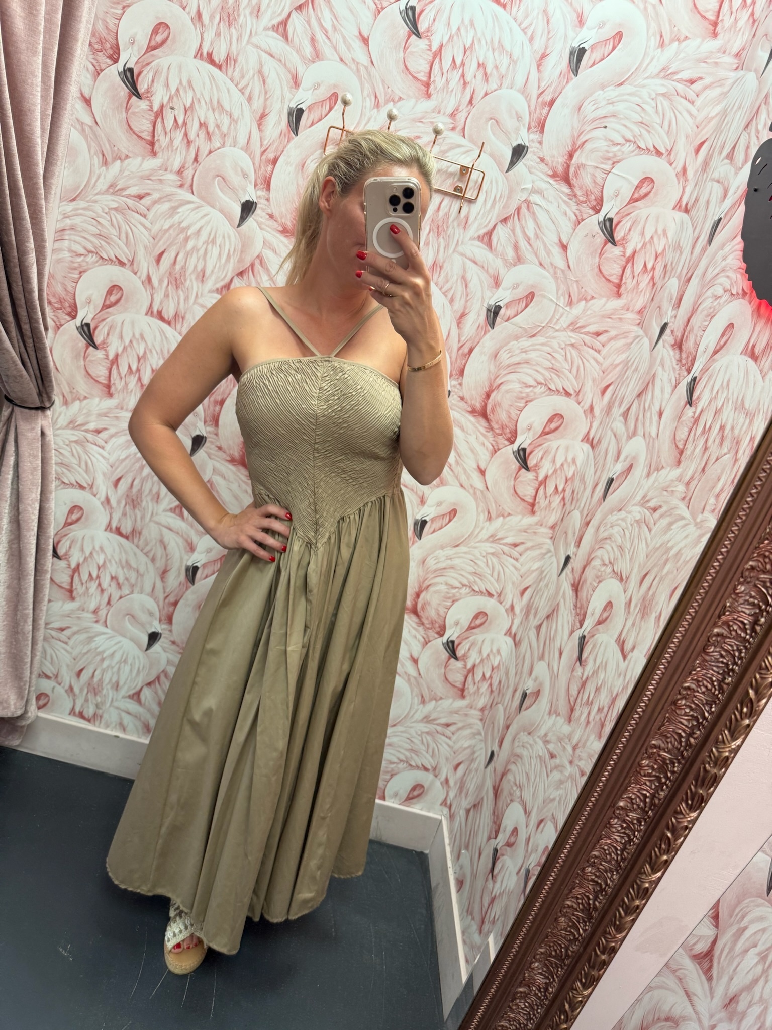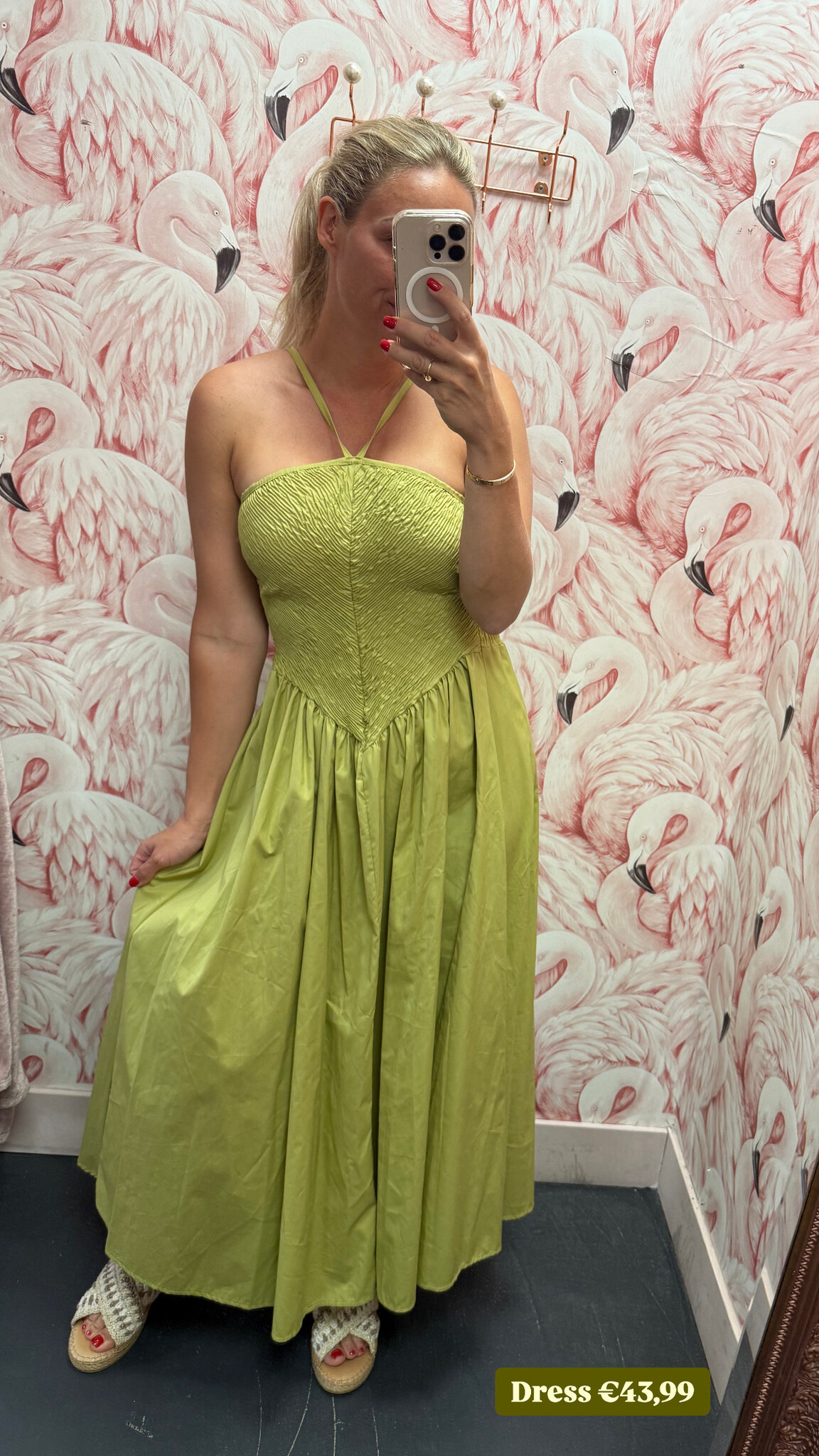 Deze te gekke zomer jurk heeft een gesmokt lijfje en een in a lijn lopende rok, de jurk heeft spaghetti bandjes welke vanaf de borst lopen. Het lijfje van de jurk loopt in een V punt wat de jurk een heel mooi silhouet geeft. De jurk is er in 3 kleuren namelijk bordeaux rood, camel bruin en lime geel/groen.
