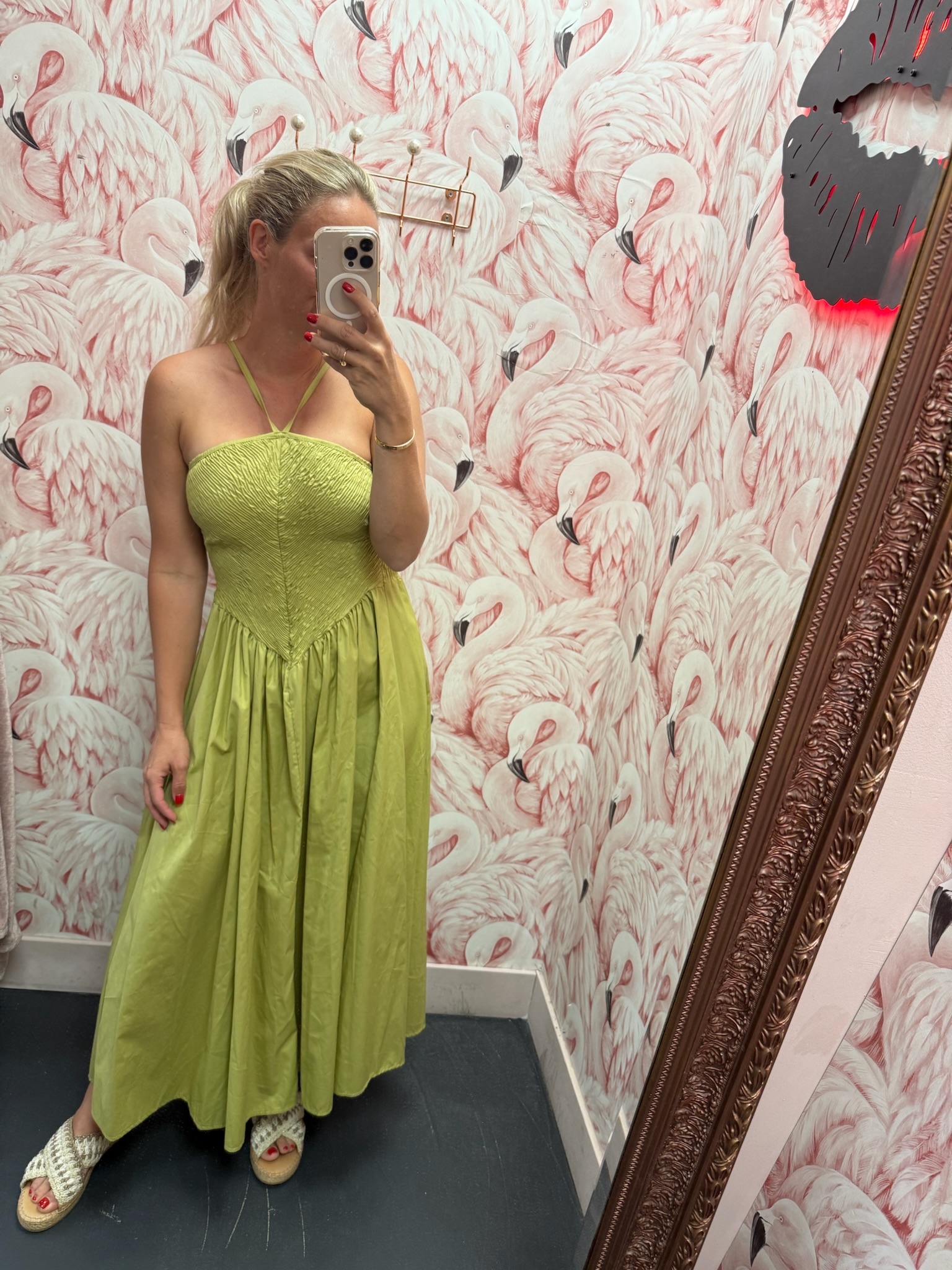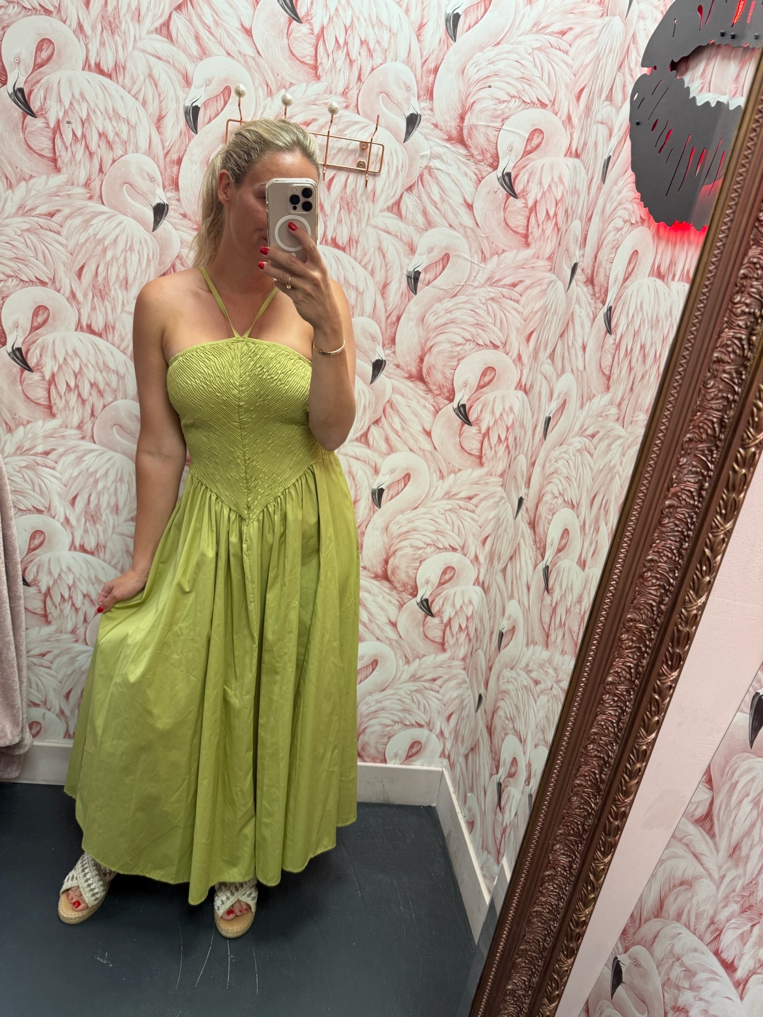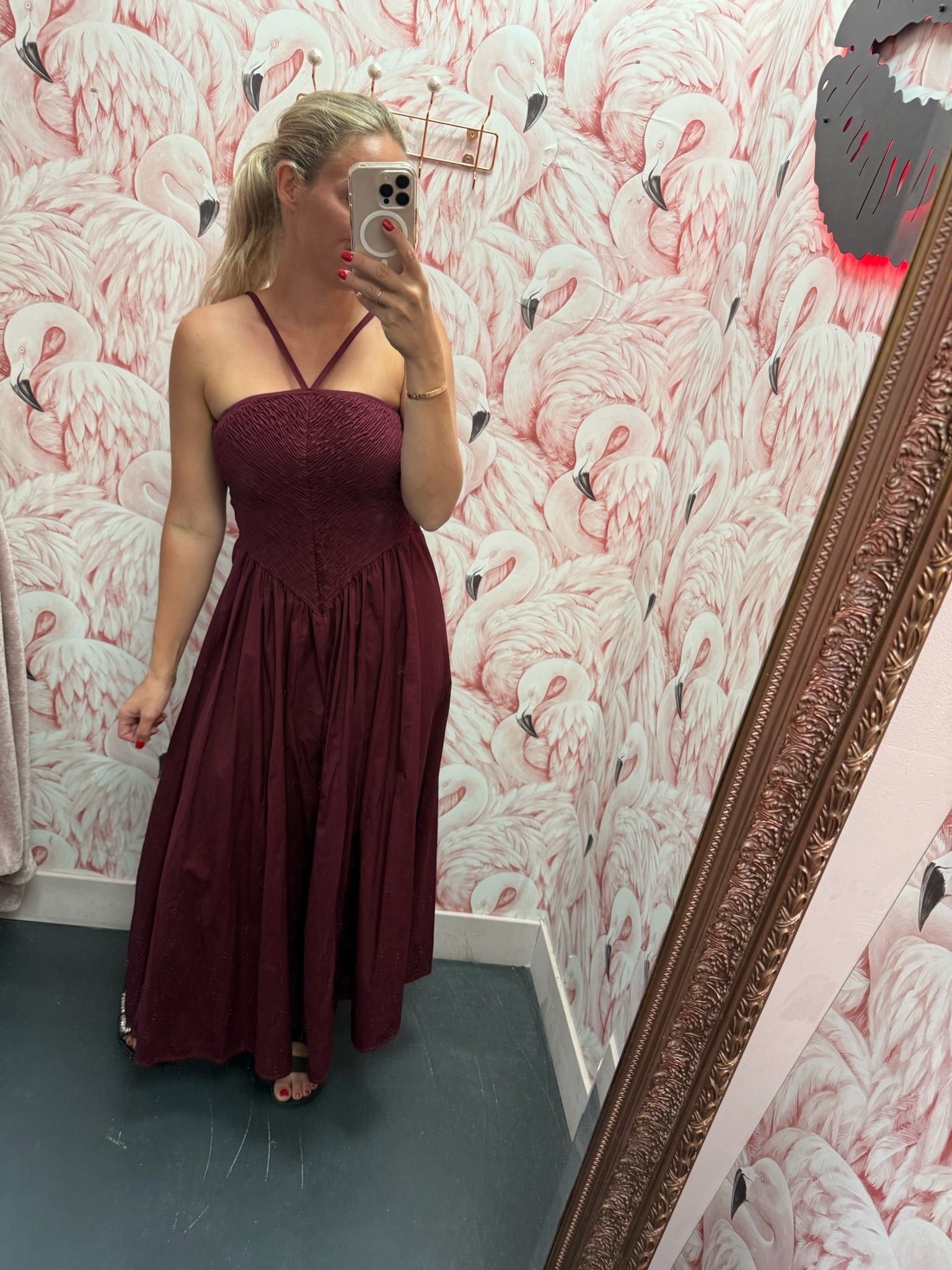 Deze te gekke zomer jurk heeft een gesmokt lijfje en een in a lijn lopende rok, de jurk heeft spaghetti bandjes welke vanaf de borst lopen. Het lijfje van de jurk loopt in een V punt wat de jurk een heel mooi silhouet geeft. De jurk is er in 3 kleuren namelijk bordeaux rood, camel bruin en lime geel/groen.