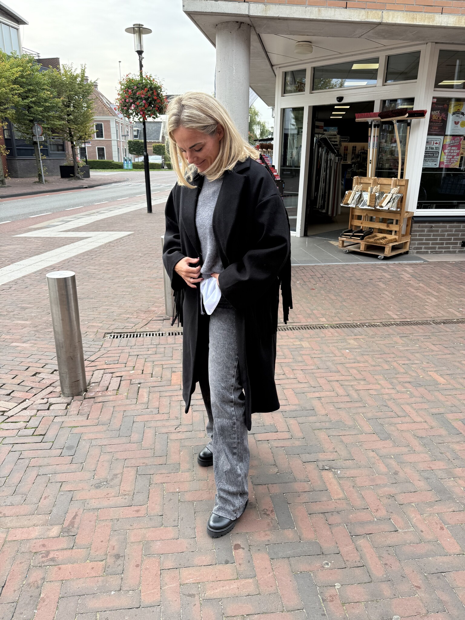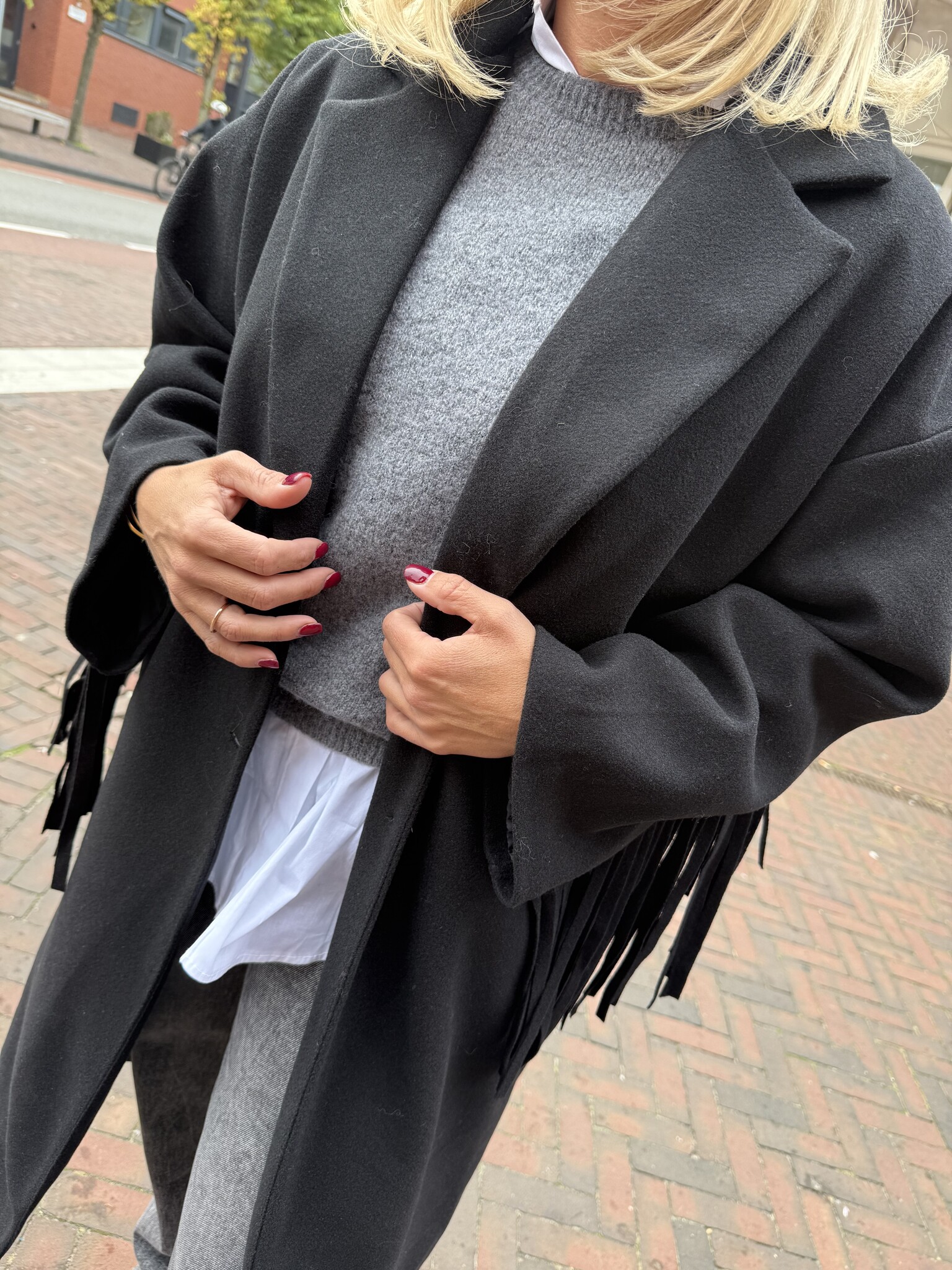 Deze prachtige gevoerde dames mantel is bordeaux rood van kleur en lekker lang. De jas heeft lange mouwen en franjes welke over de rug en mouwen lopen, ook is de jas voorzien van steekzakken.