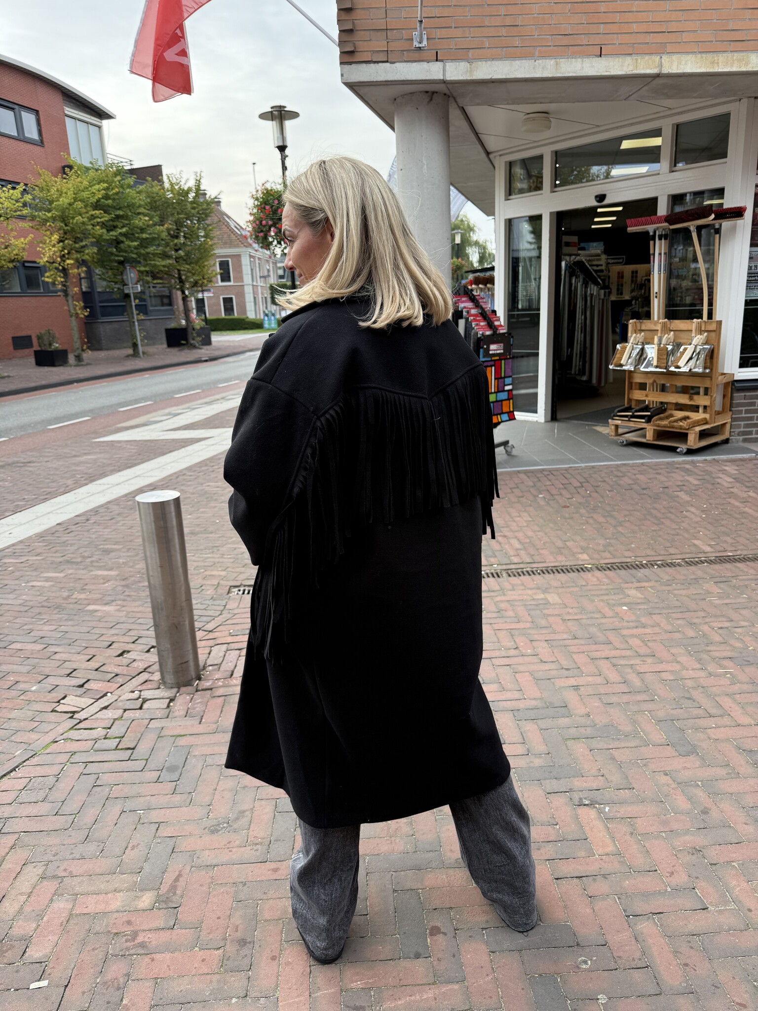 Deze prachtige gevoerde dames mantel is camel bruin van kleur en lekker lang. De jas heeft lange mouwen en franjes welke over de rug en mouwen lopen, ook is de jas voorzien van steekzakken.