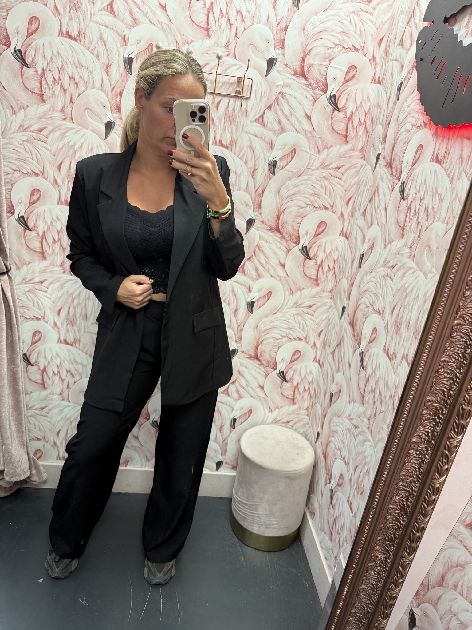 Deze super mooie klassieke set bestaat dus uit een pantalon en uit een blazer. De set is verkrijgbaar in het zwart en in het groen. De blazer heeft een klassieke kraag, sierzakken en een knoopsluiting en de pantalon broek heeft steekzakken, riem lussen en een knoop en ritssluiting. Het pak is one size en te dragen tot een kleine maat L.