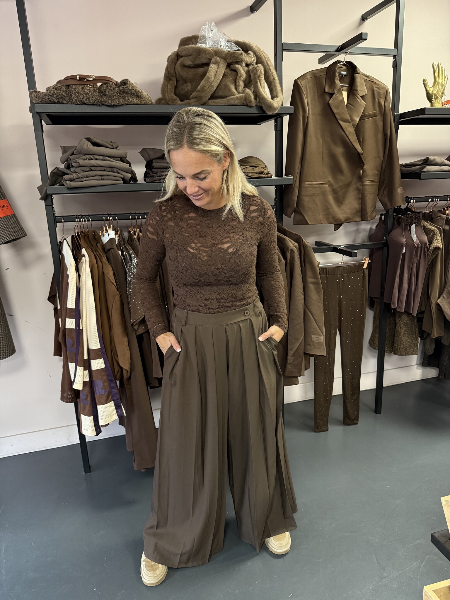 Deze prachtige top is gemaakt van een aansluitende gladde stof in de trendkleur van het najaar namelijk donkerbruin , deze kleur is een hele donkere warme kleur bruin. De top heeft lange mouwen en een ronde hals, combineer met de bijpassende wide leg.