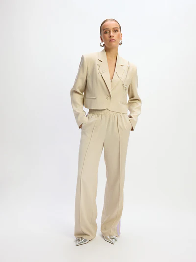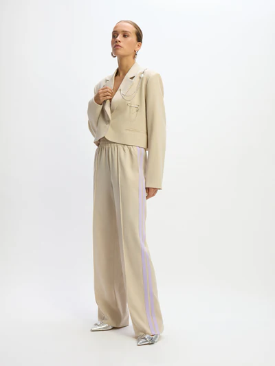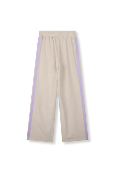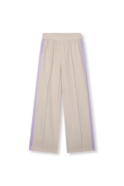 Deze te gekke broek is een wide leg model en beige van kleur, de stof heeft een chique ruitjes patroon en is gemaakt van rijke stof. De broek is afgewerkt met lila tape biezen aan de zijkant en heeft een elastische tailleband.