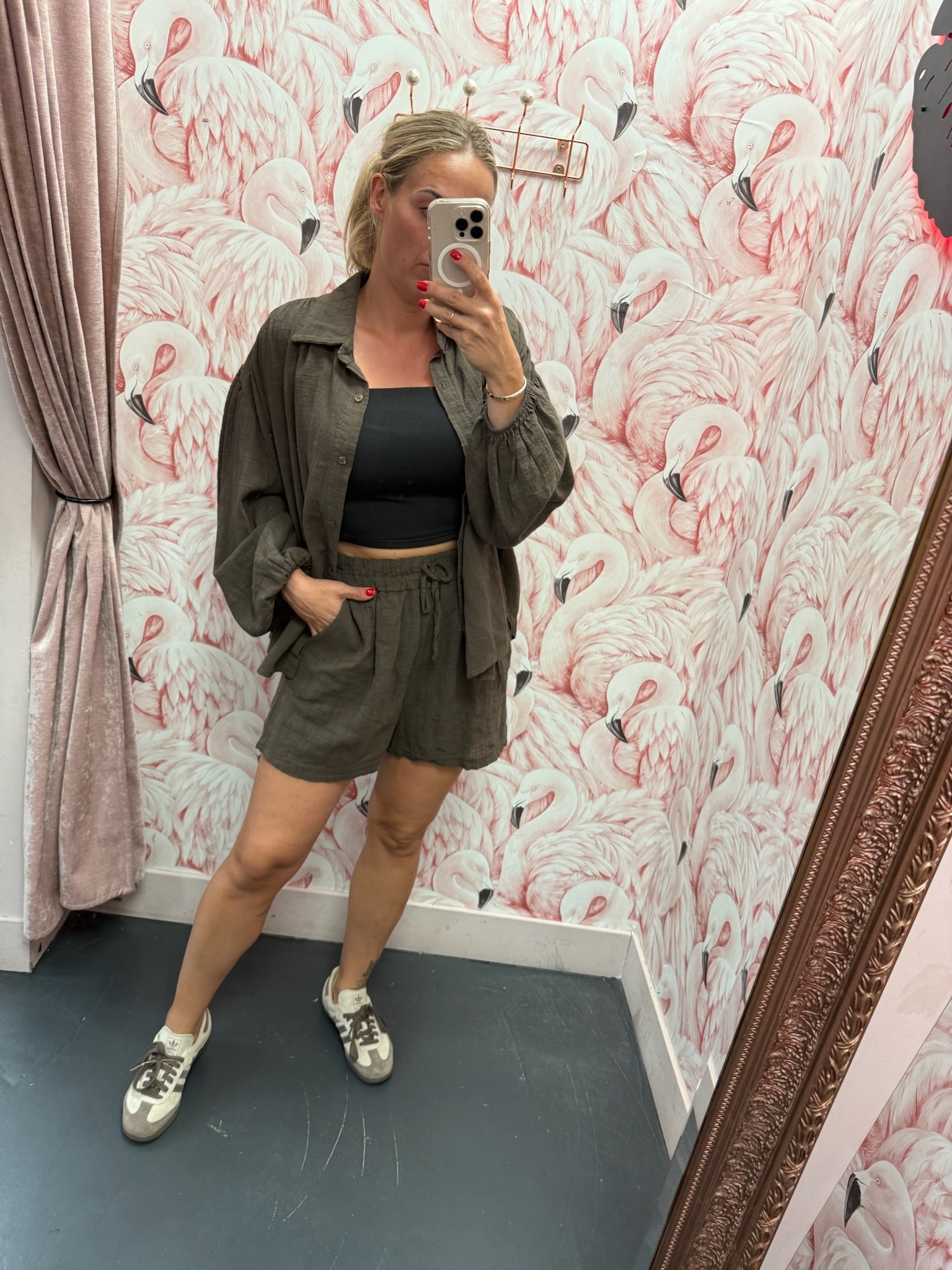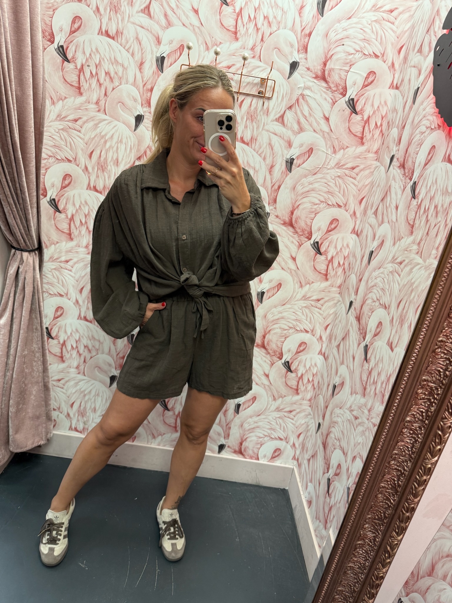 Deze heerlijke luchtige set is gemaakt van katoen. De set bestaat uit een korte broek en een blouse met lange mouwen. De korte broek heeft een elastische tailleband en steekzakken, de blouse heeft een klassieke kraag, valt lekker lang en heeft elastische boorden aan de mouwen. De set is bruin van kleur, wat helemaal de kleur is van dit moment.