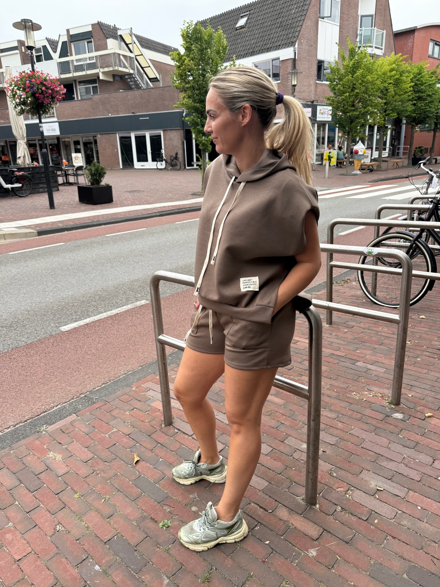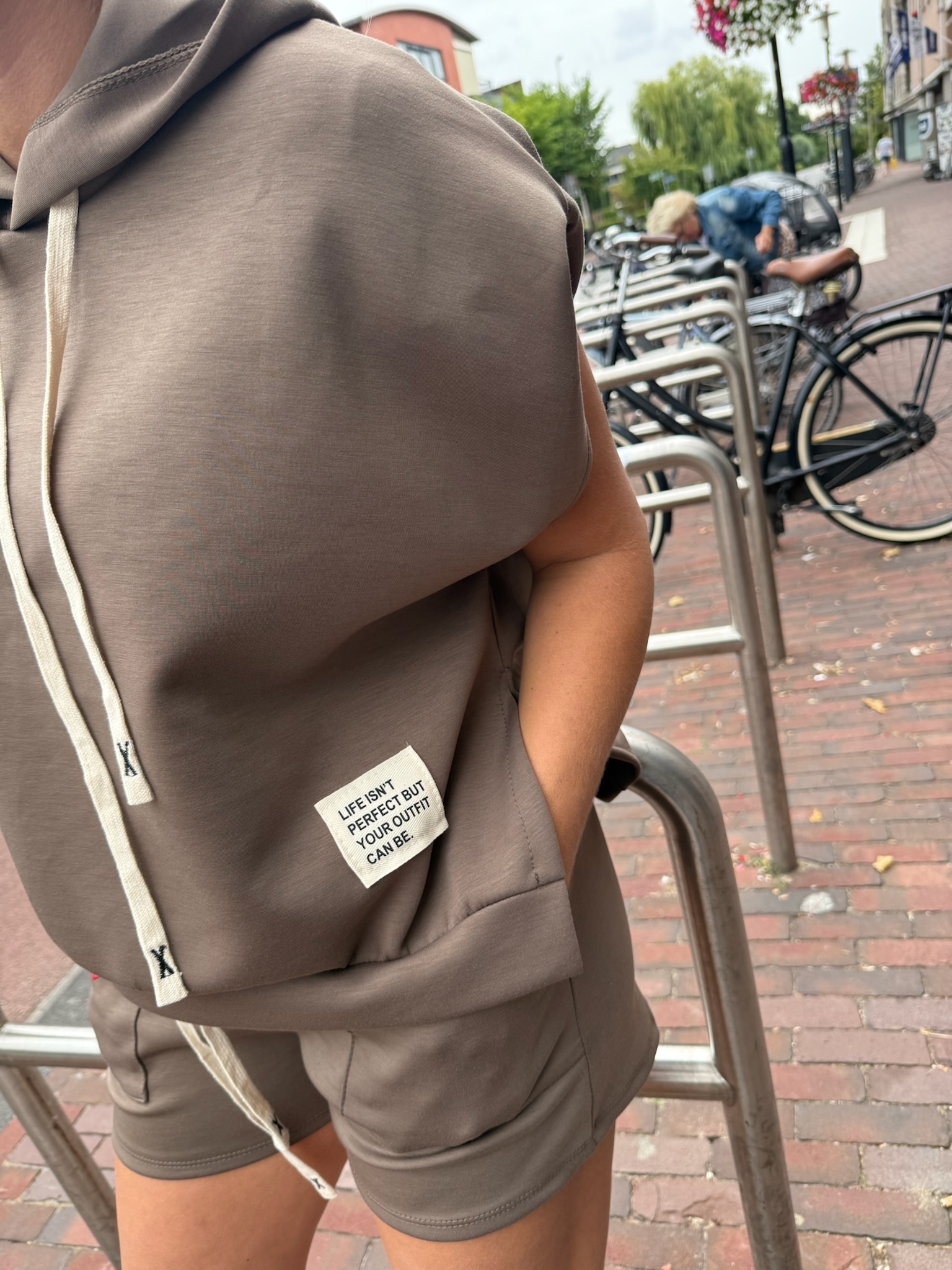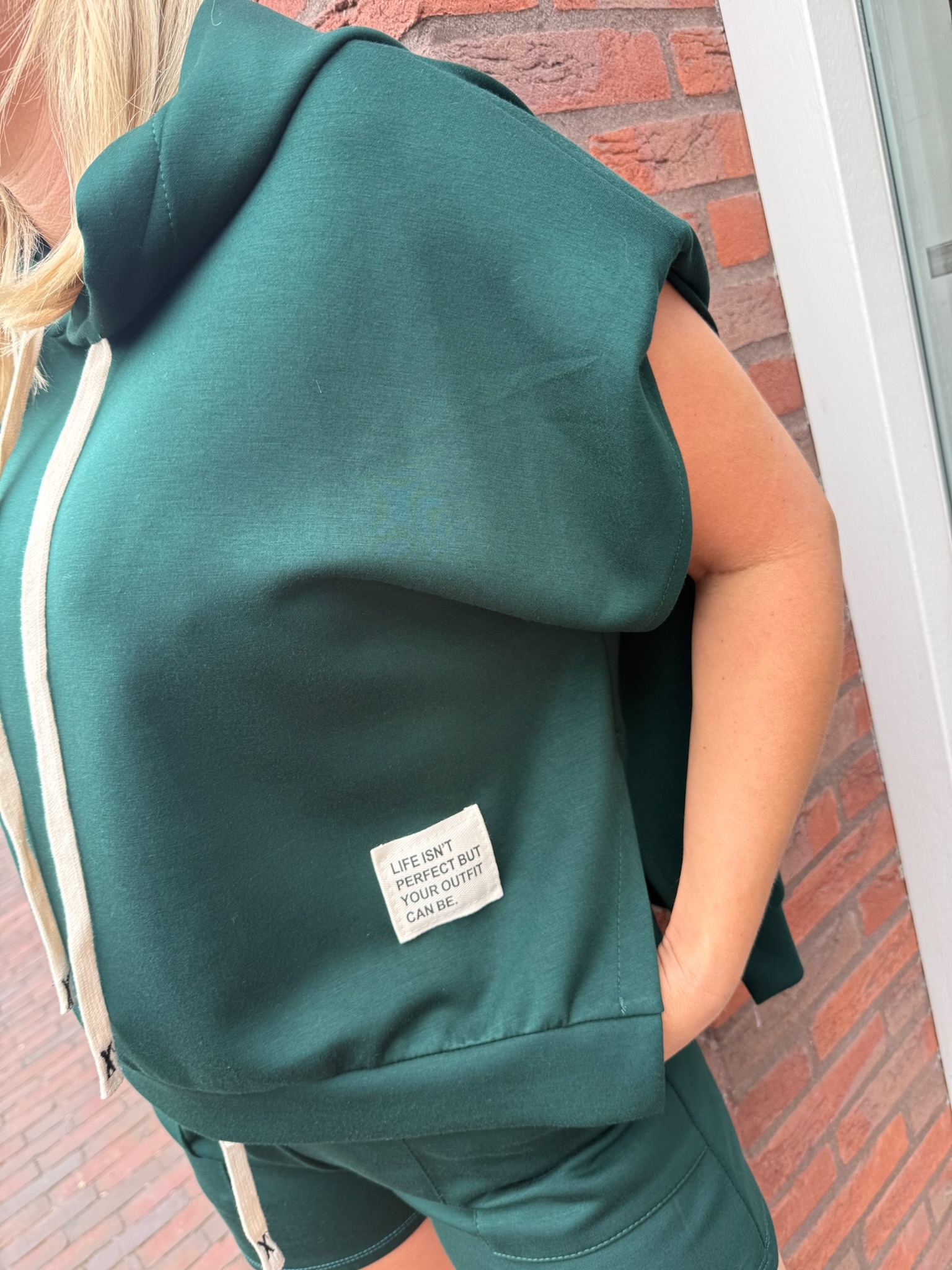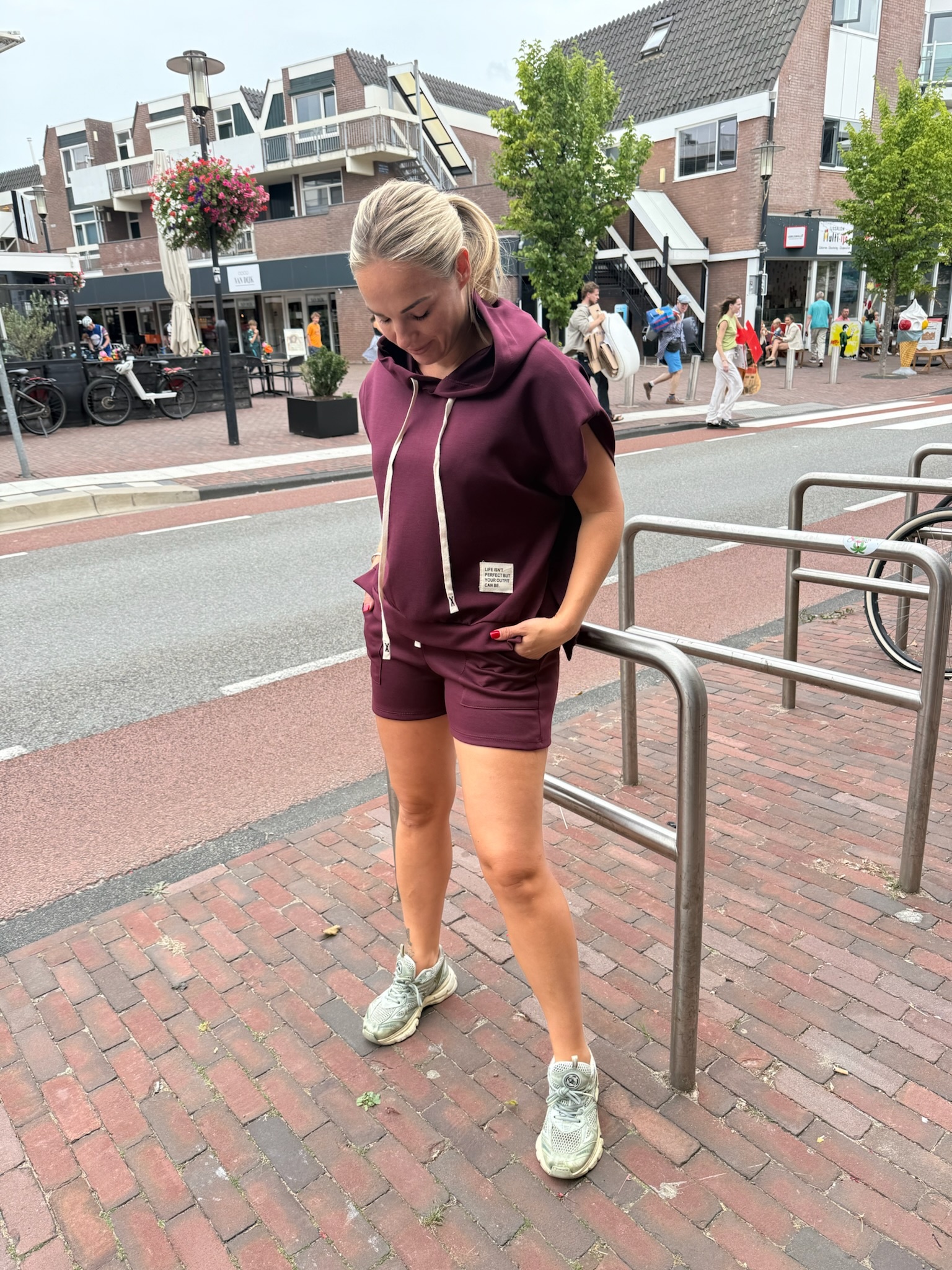 Dit heerlijke pakje voor dames bestaat uit een korte broek en t-shirt, de korte broek heeft een elastische tailleband en steekzakken, het t-shirt heeft een ronde hals en korte mouwen.