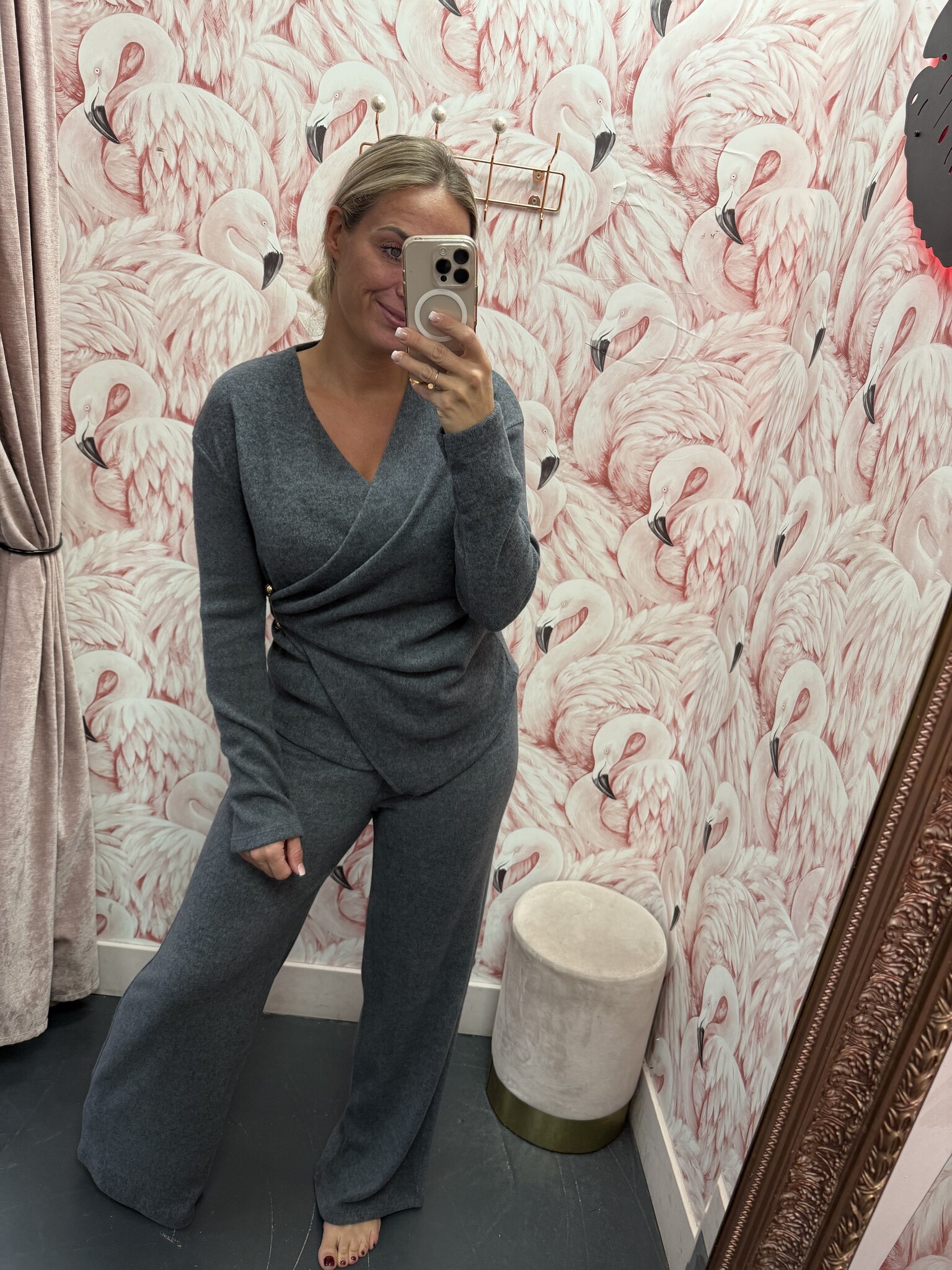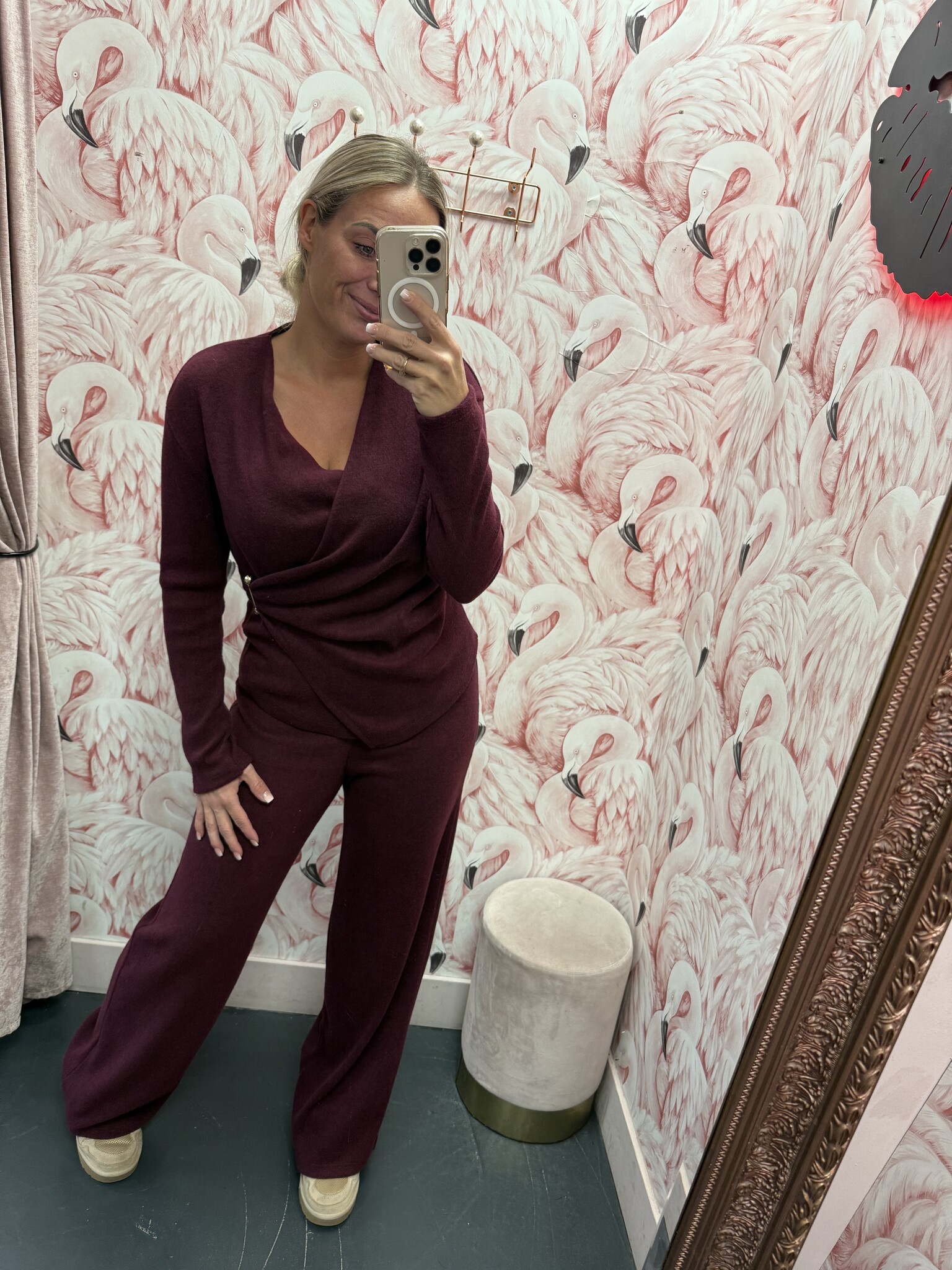 Deze heerlijke zachte set bestaat uit een wide leg broek en een overslag shirt met gouden broche. De set is er in het donkergrijs en bordeaux rood. De set bevat heel veel stretch en rekt dus lekker mee, de set is one size en te dragen met ongeveer maat S M L.