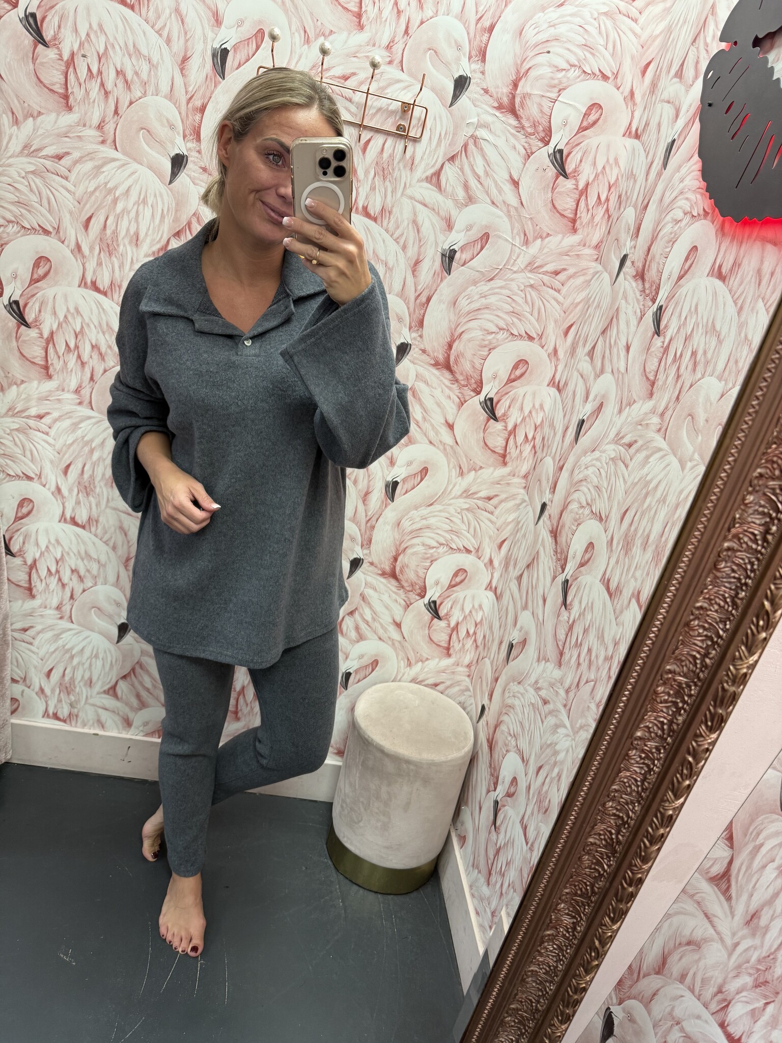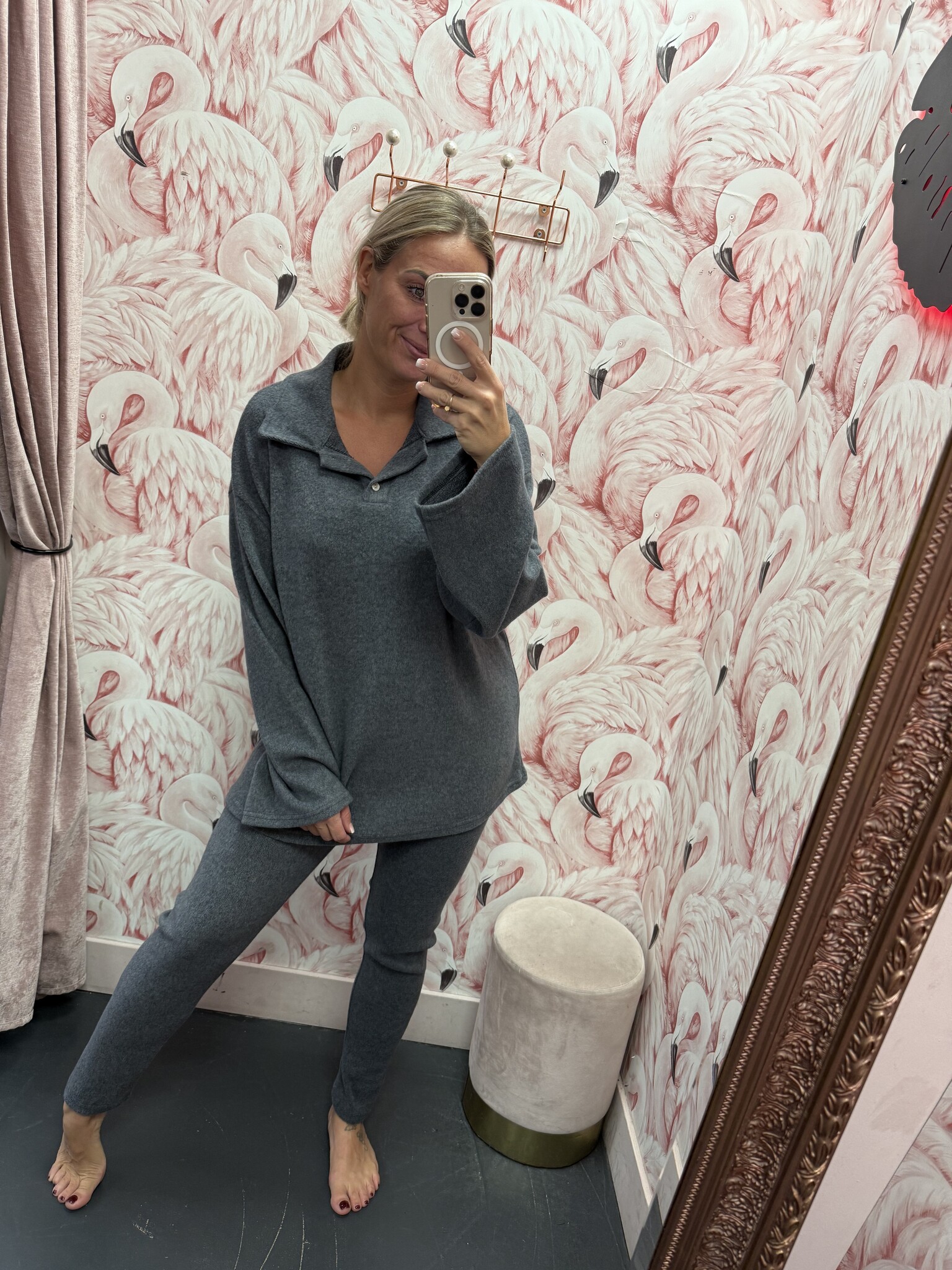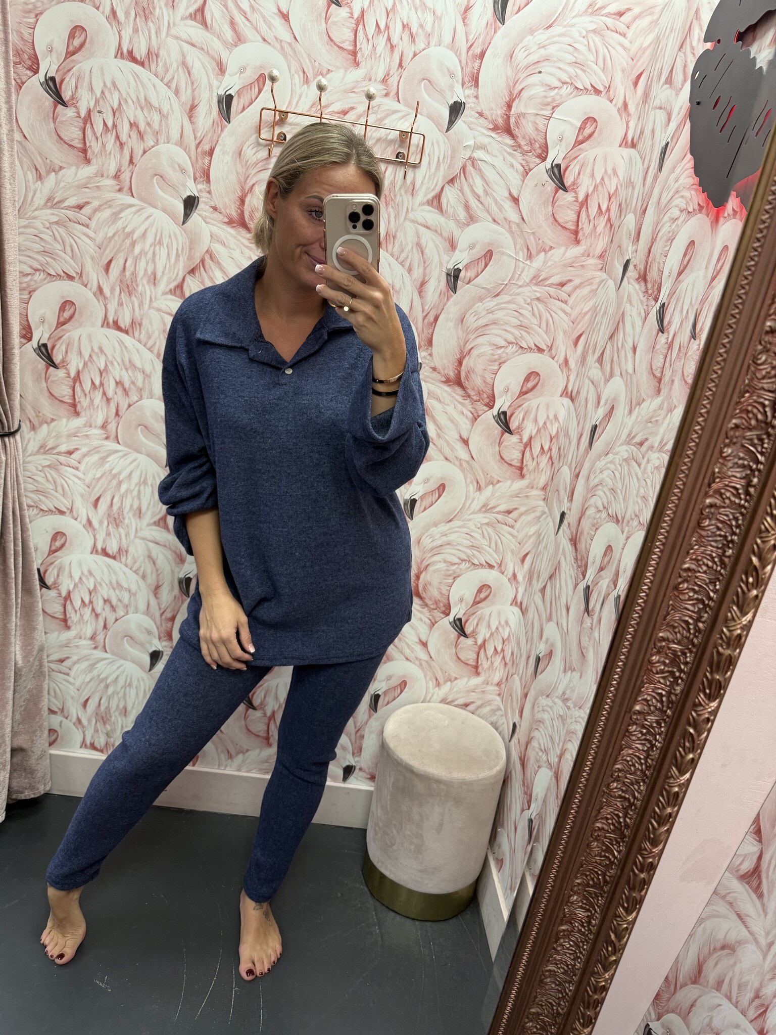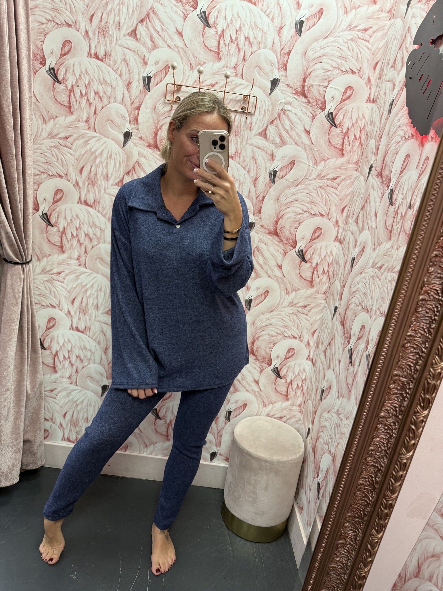 Deze heerlijke zachte set bestaat uit een smalle broek en een ruim shirt met een polo kraag. De set is er in het donkergrijs, bordeaux rood en blauw. De set bevat heel veel stretch en rekt dus lekker mee, de set is one size en te dragen met ongeveer maat S M L XL.