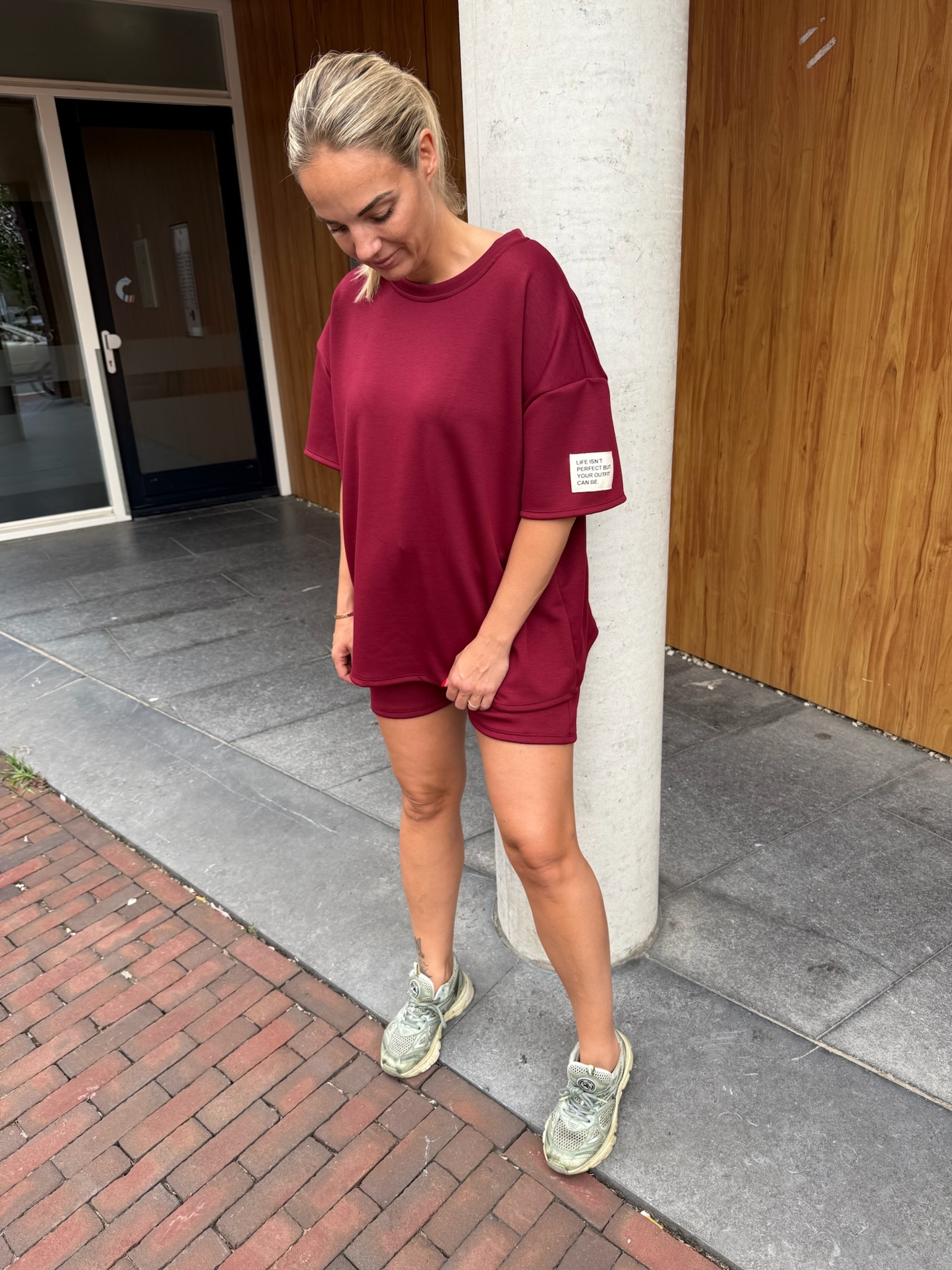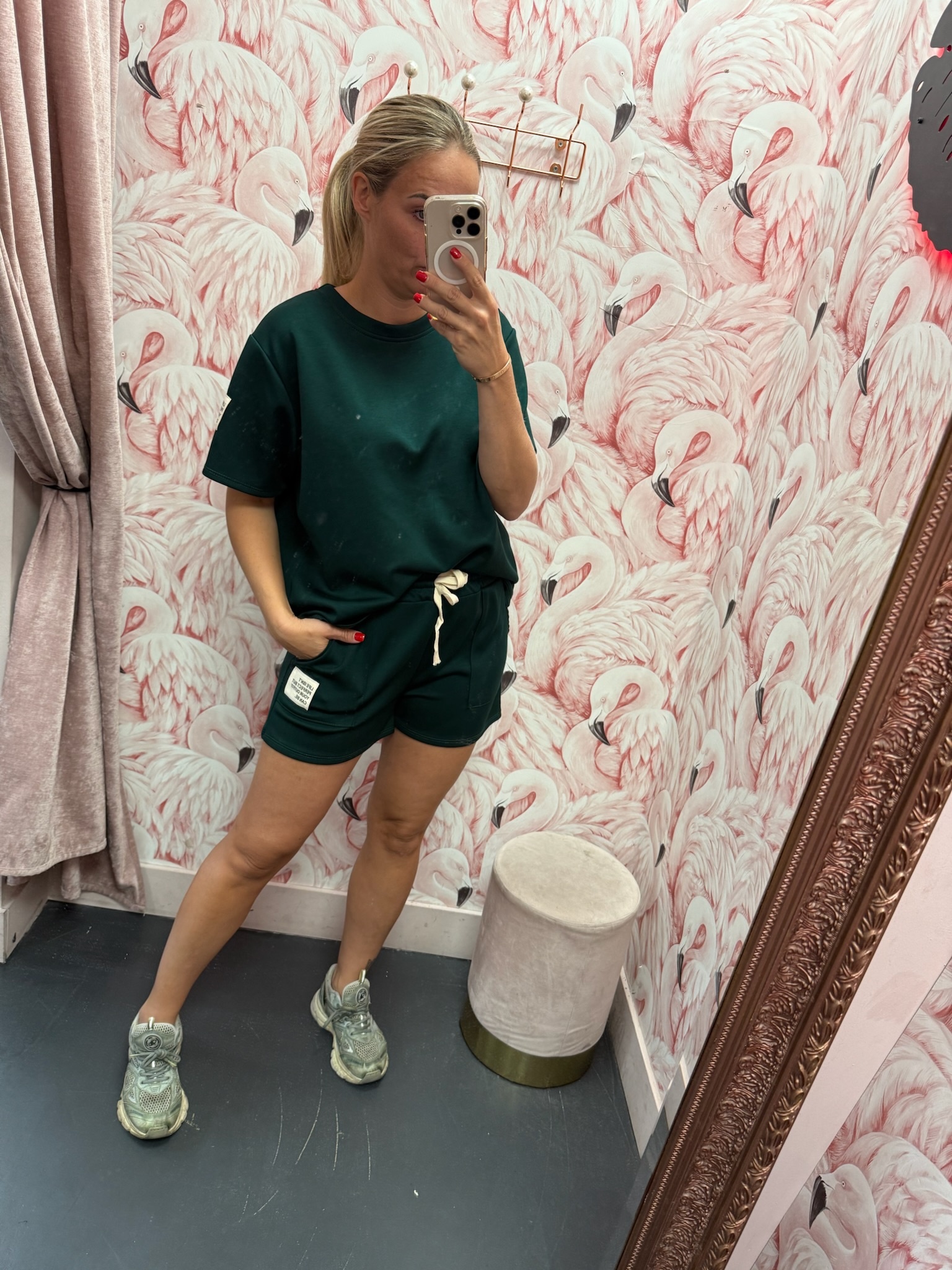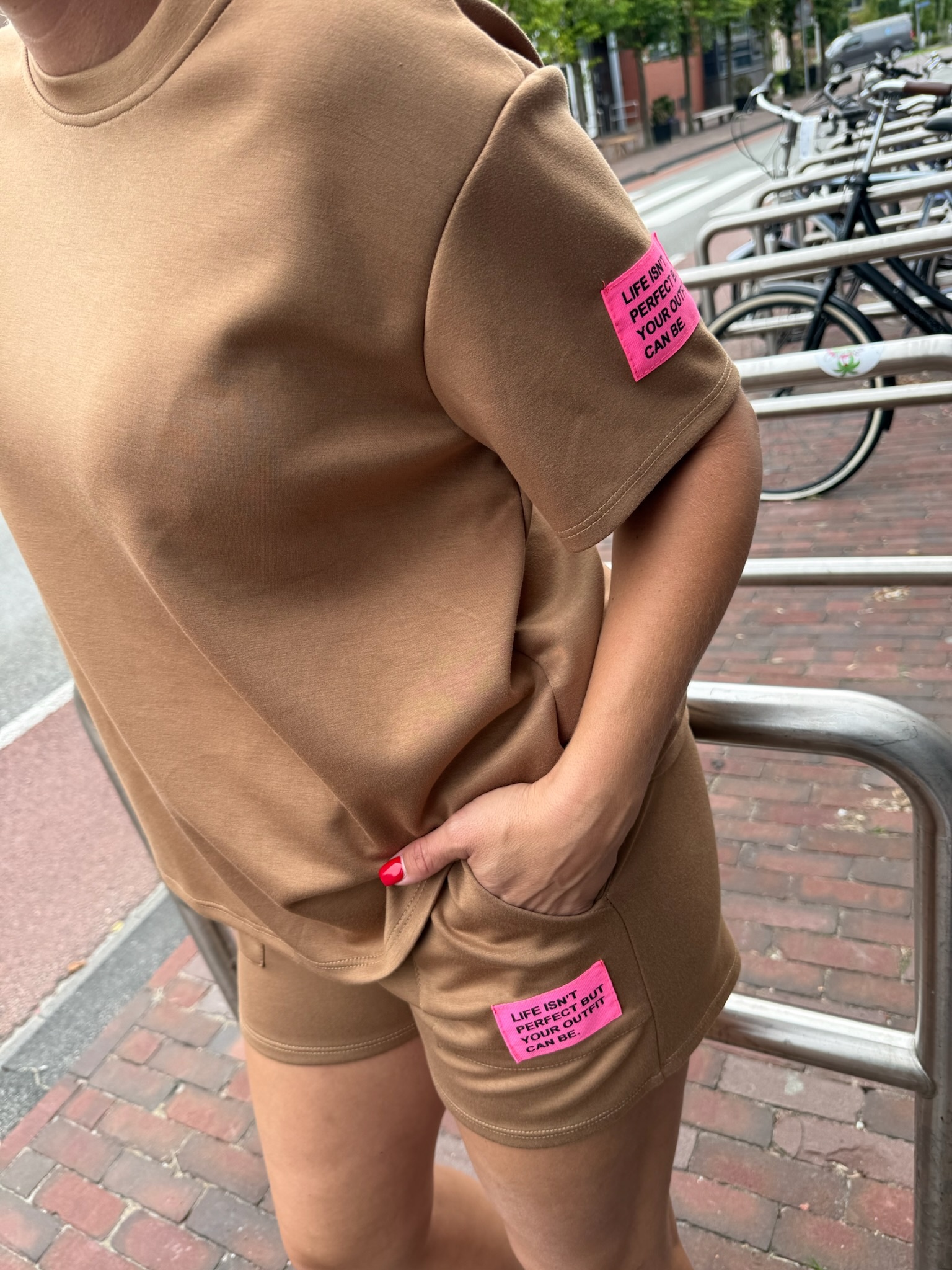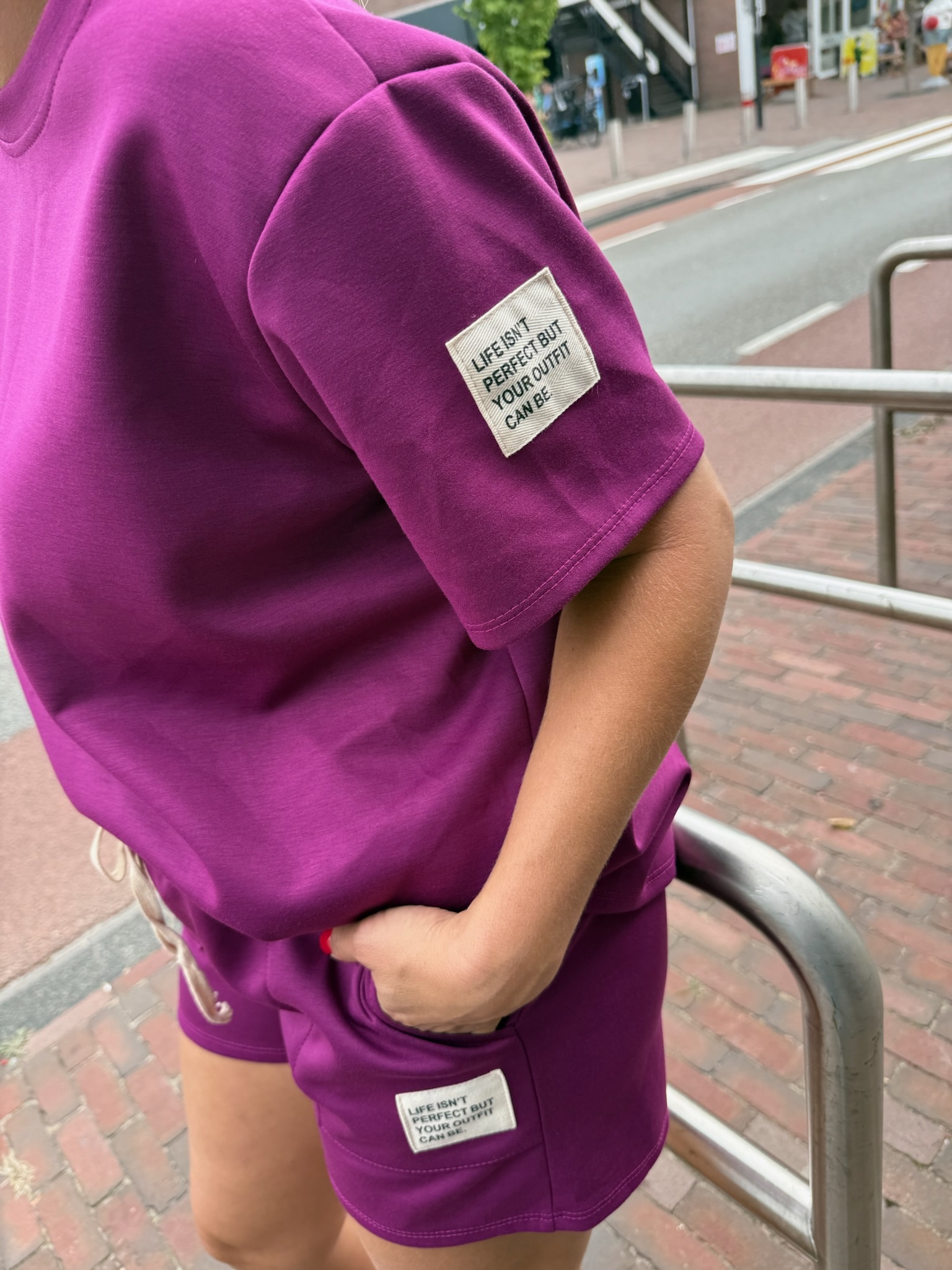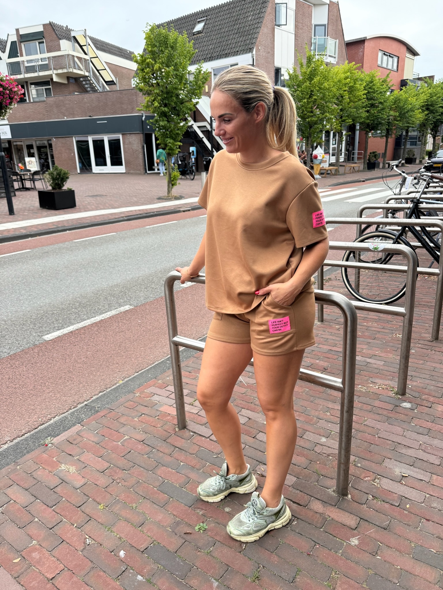 Dit heerlijke pakje voor dames bestaat uit een korte broek en t-shirt, de korte broek heeft een elastische tailleband en steekzakken, het t-shirt heeft een ronde hals en korte mouwen.