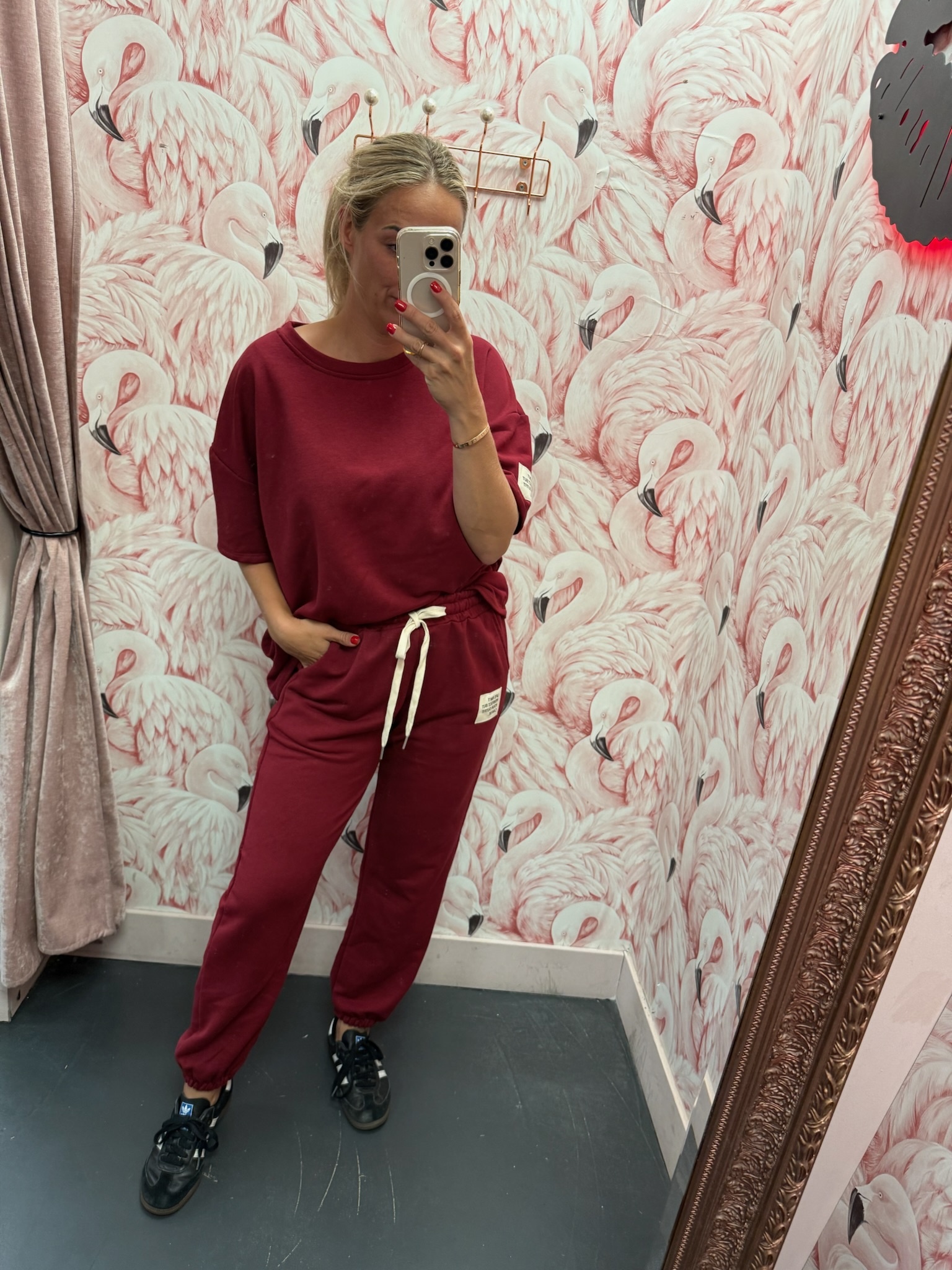 Dit heerlijke pakje voor dames bestaat uit een lange broek en t-shirt, de lange broek heeft een verstelbare elastische tailleband, steekzakken en een elastische boord aan de pijpen, het t-shirt heeft een ronde hals en korte mouwen. Het pak is een warme kleur rood. Alle setjes zijn op de mouw en zak voorzien van een label met de tekst LIFE ISN'T PERFECT BUT YOUR OUTFIT CAN BE. De set is one size en te dragen tot ongeveer maat XL.