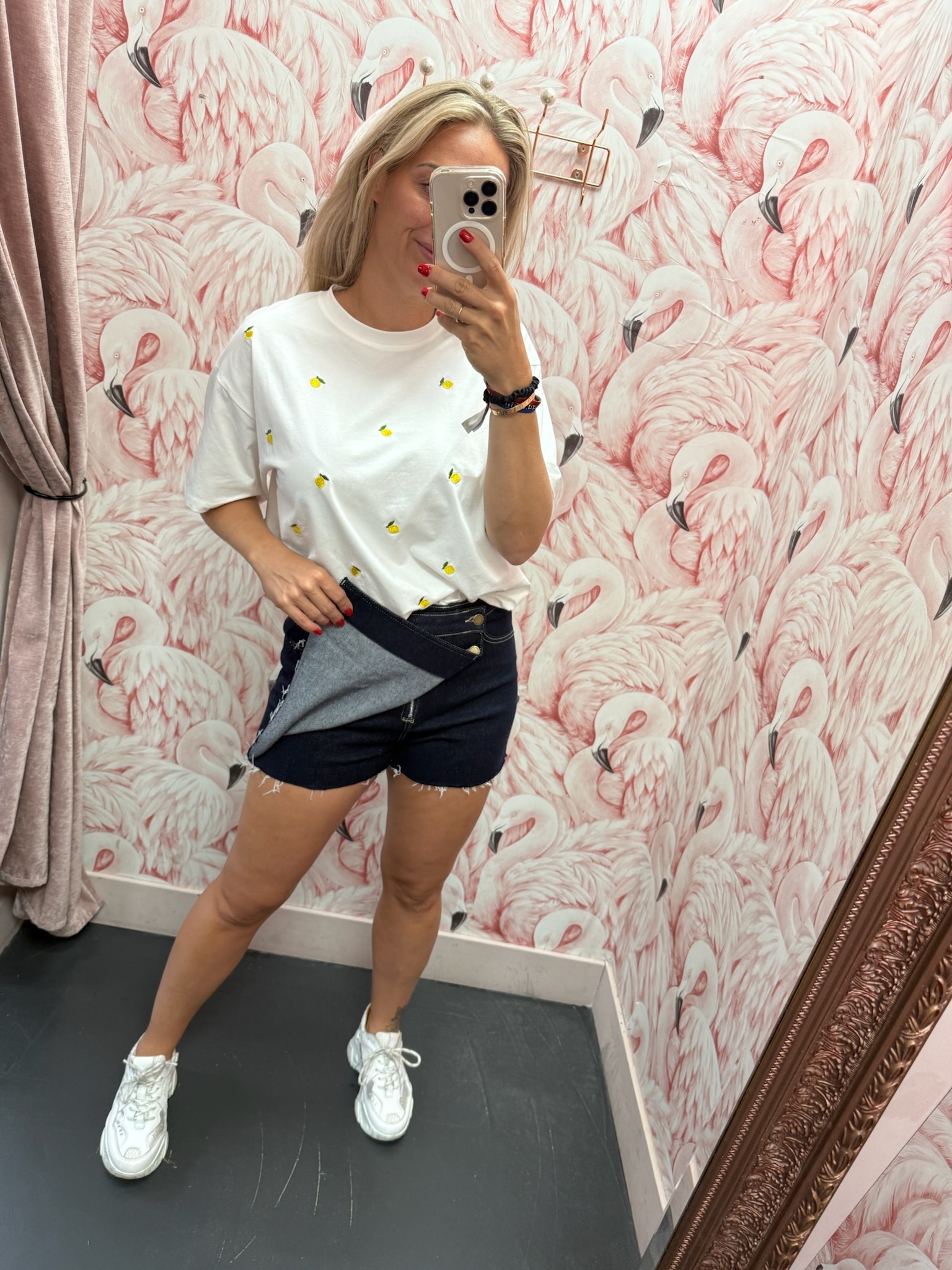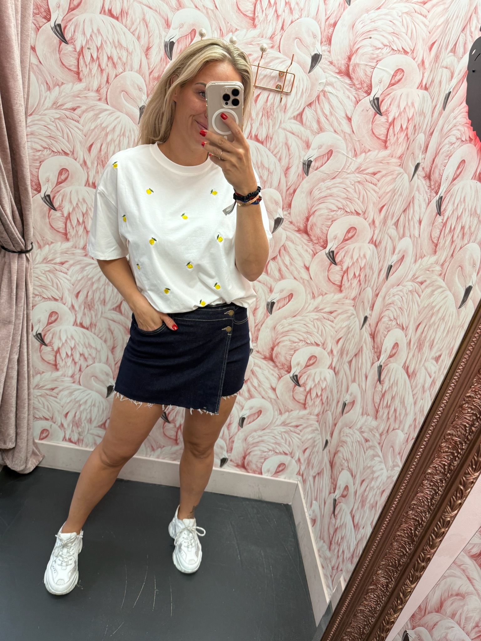 Dit heerlijke korte broekje oogt als een rokje door de flap aan de voorzijde. Het broek rokje is gemaakt van jeans stof, heeft een dubbele knoopsluiting en heeft zakken aan de voor en achterzijde. De kleur van de skort is donkerblauw en heeft een geraffelde onderzijde. Het shortje bevat heel veel stretch.