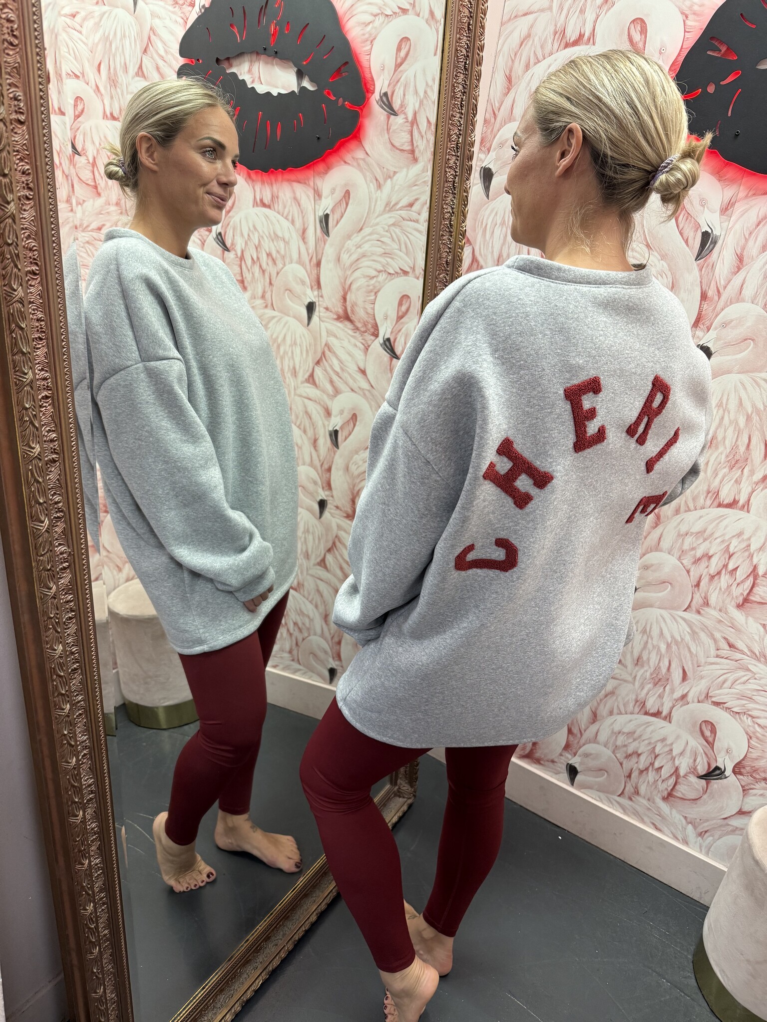 Deze heerlijke trui is grijs van kleur en heeft op de achterzijde een opdruk in bordeaux rode teddy stof met de tekst CHERIE. De trui valt goed lang en lekker ruim, hierdoor is deze ook goed op een legging te dragen. De trui is one size en zeker te dragen tot en met maat 46. De trui heeft een ronde hals, lange mouwen met boord en heet geen boord aan de onderzijde. De sweater heeft een lekkere warme fleece voering.