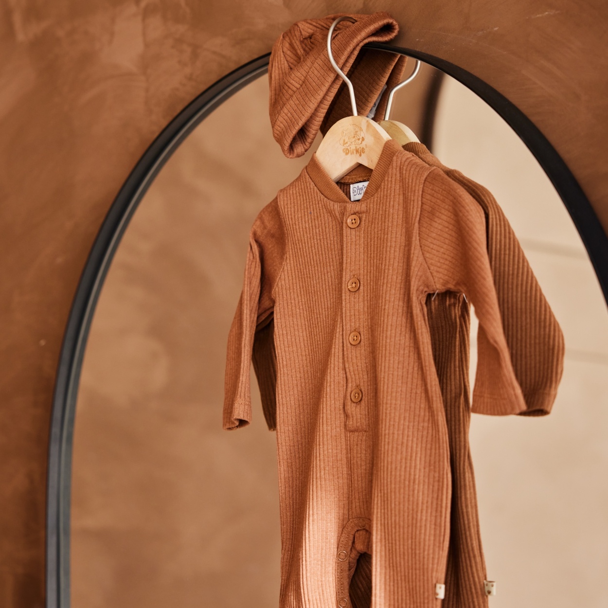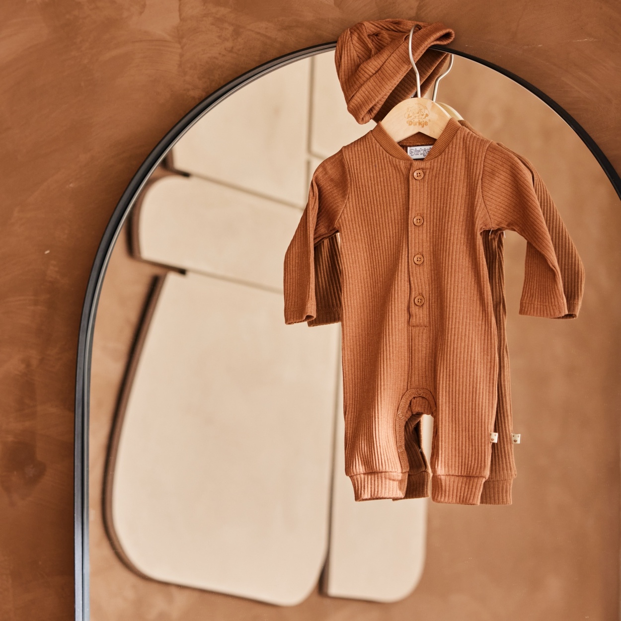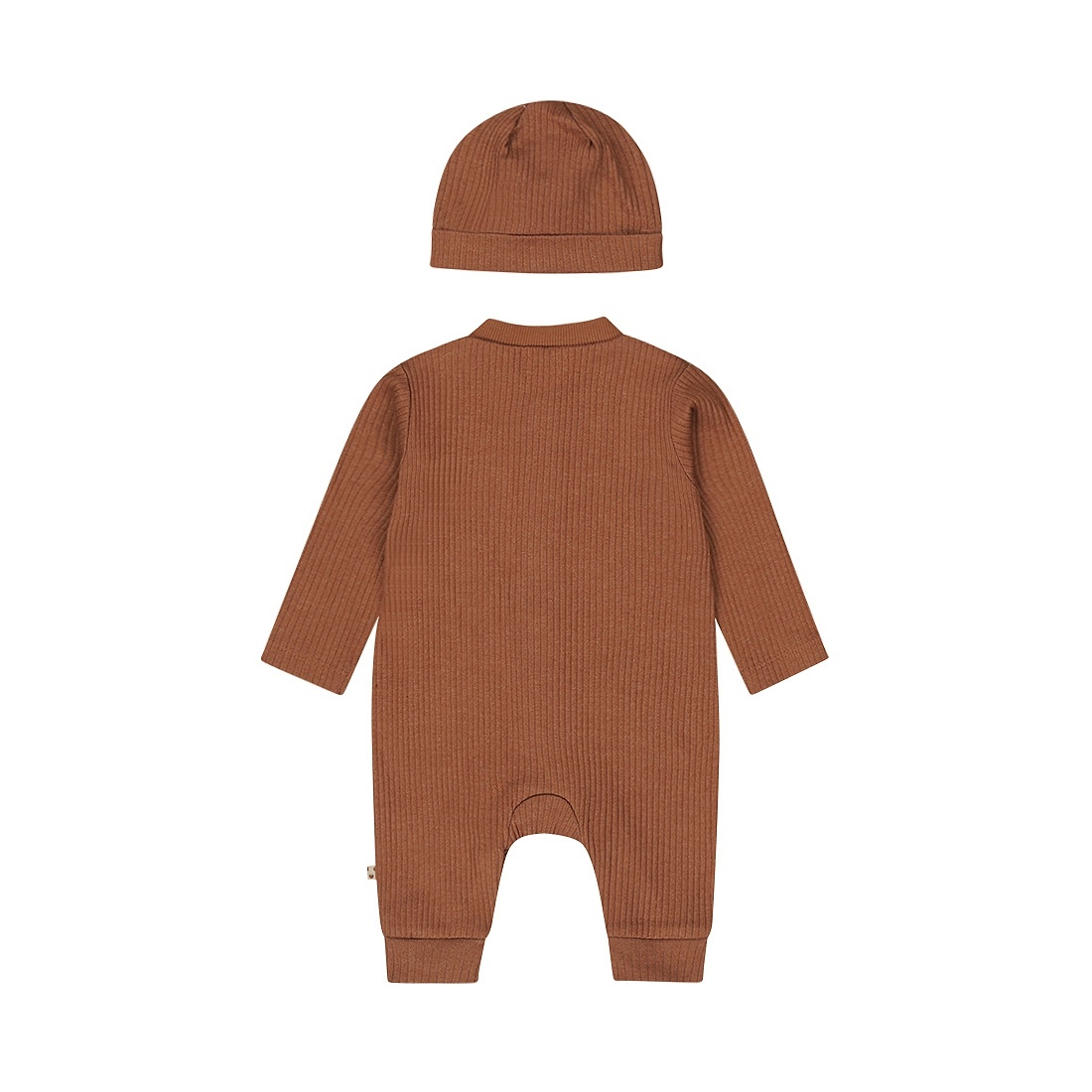 Dit mooie stoere jongens boxpakje is donkerbruin van kleur en gemaakt van ribstof, dit geeft het pakje meteen een super stoere uitstraling. Het babypakje heeft een drukknoop sluiting tussen de beentjes lopen, zo kun je gemakkelijk je baby verschonen, over de borst loop verticaal naar beneden een gewone knoop sluiting met bruine knoopjes. Het boxpakje heeft lange mouwen en lange pijpen, de pijpjes hebben ook boorden aan de onderzijde zitten. Bij het pakje zit een bijpassende mutsje met omslag in dezelfde donkerbruine kleur.