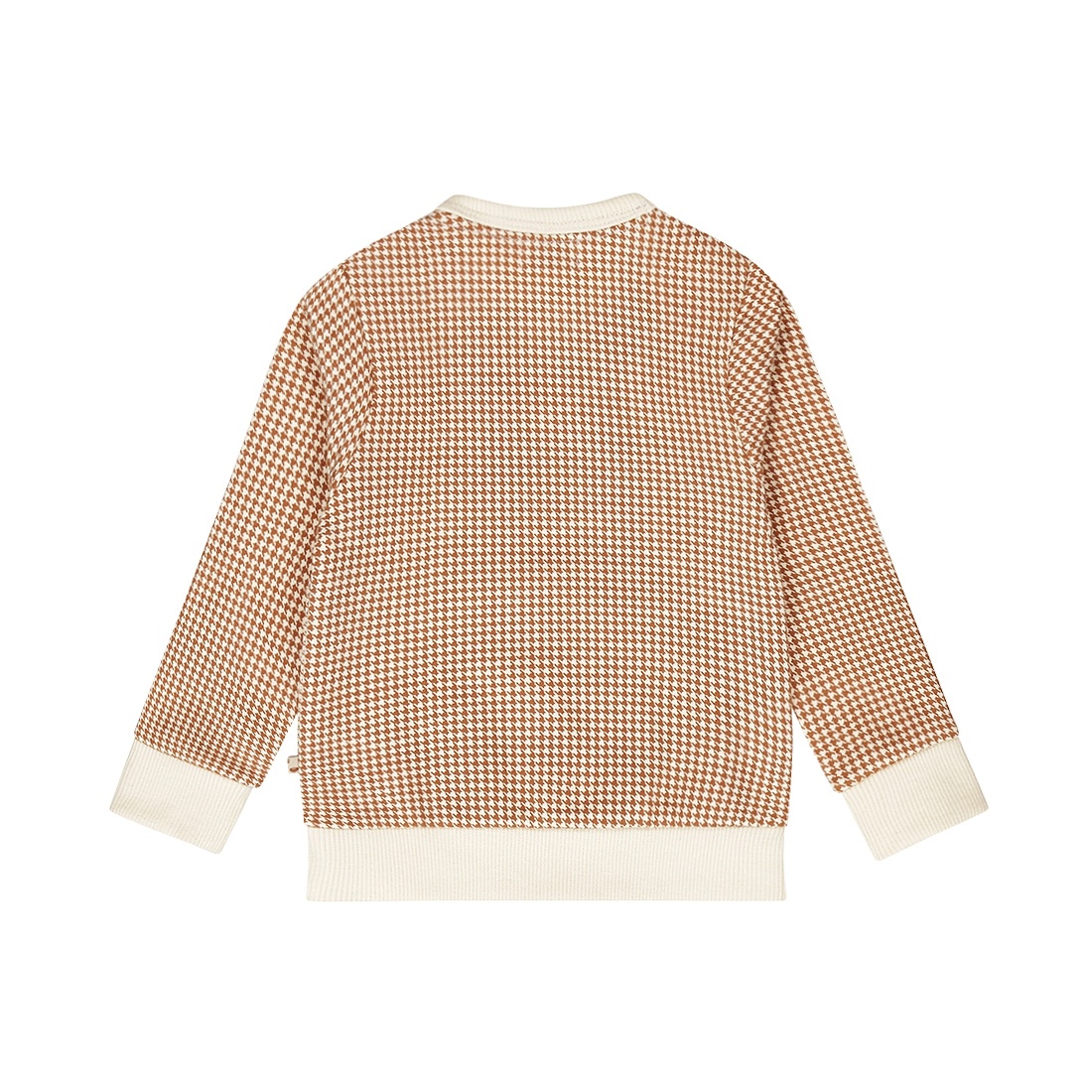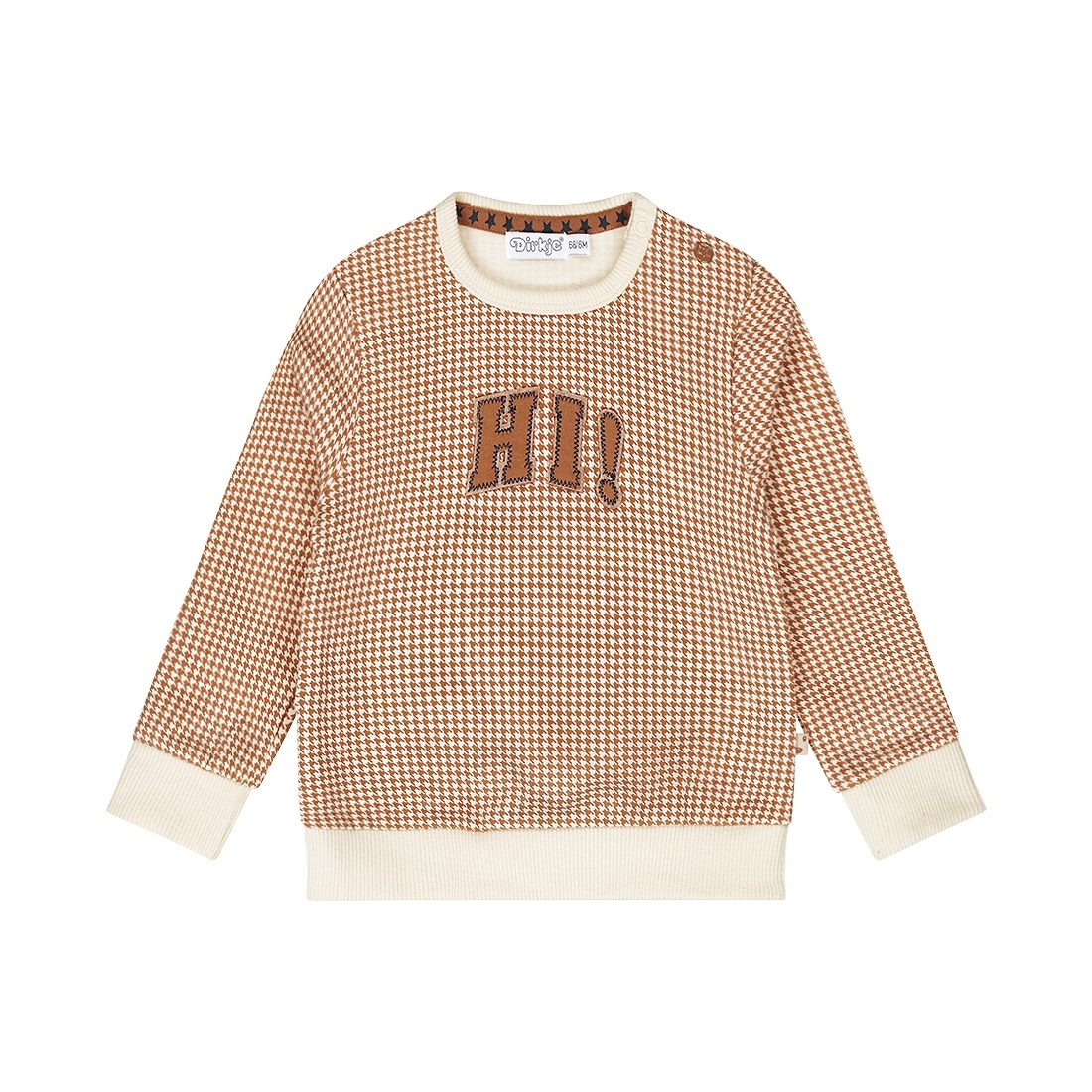 Deze te gekke trui in de kleur beige/bruin is voor de stoere jongens baby's. De trui heeft een pied de poule print en een embleem met tekst ''HI!" op het voorpand. De trui heeft een ronde hals afgezet met ribstof in de kleur beige. De Onderkant van de baby sweater en de onderkant van de mouwen zijn ook afgezet met dezelfde beige ribstof. 1 schouder heeft 2 drukknoopjes zodat de trui makkelijk over het hoofd aan en uitgetrokken kan worden. De sweater is te combineren met het bijpassende broekje uit dezelfde collectie van Dirkje.