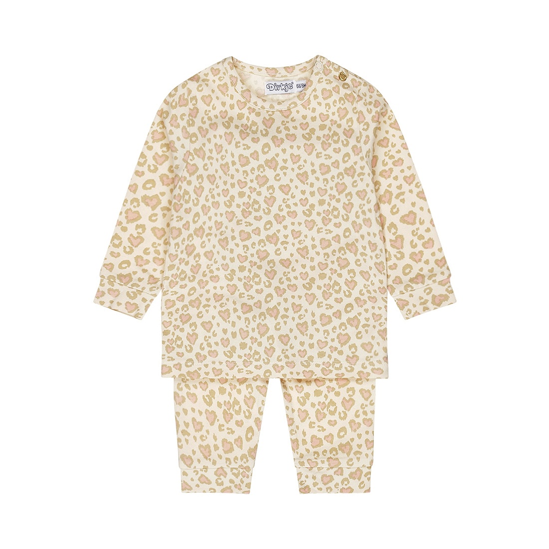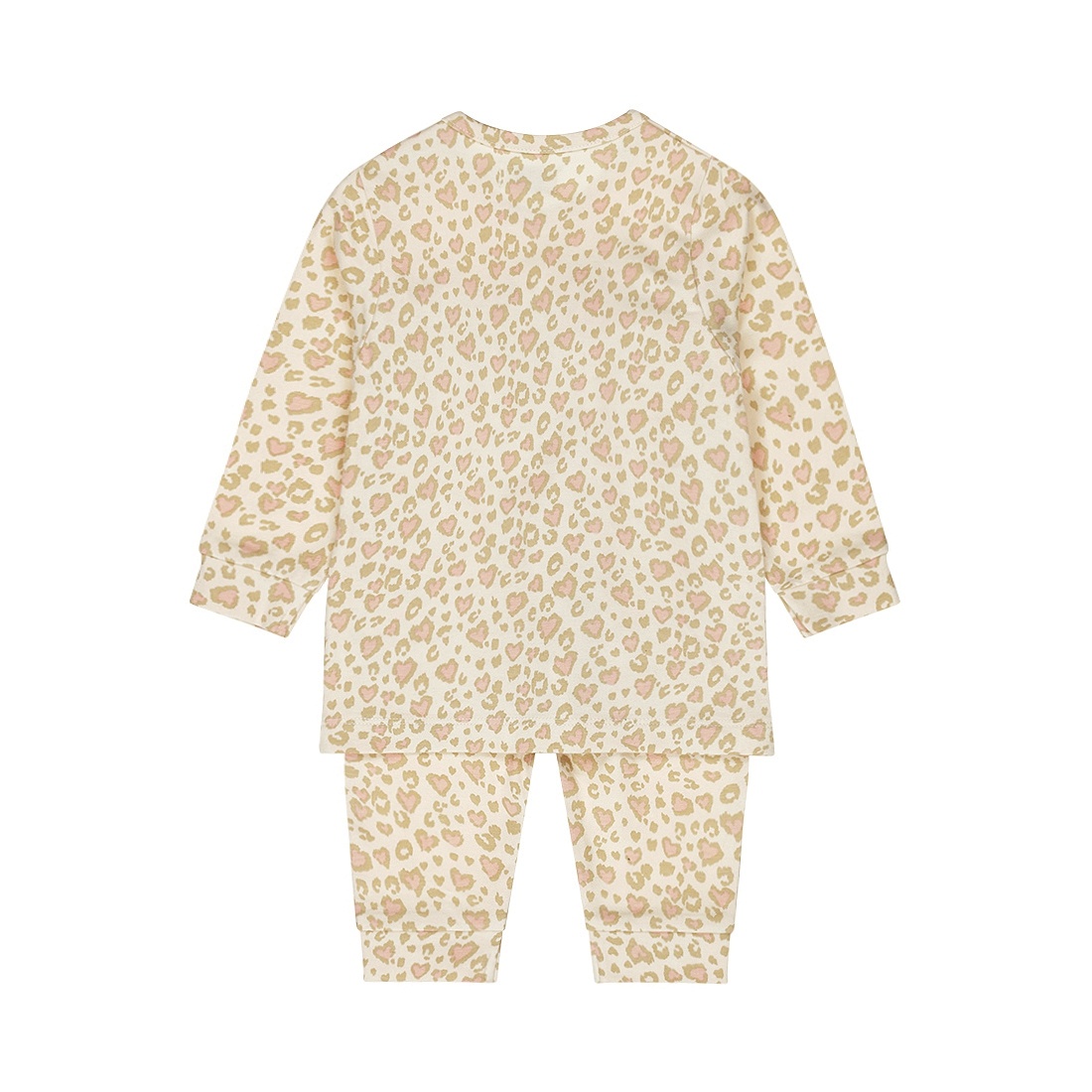 2 delige baby-pyjama in de kleur off white met roze panterprint maar dan net even anders de panterprint is in de vorm van hartjes dus net even een ander motief. De pyjama heeft een ronde hals en de broek heeft een elastische band. De onderkant van de mouwen en de broekspijpen zijn afgezet met een brede band van dezelfde stof.