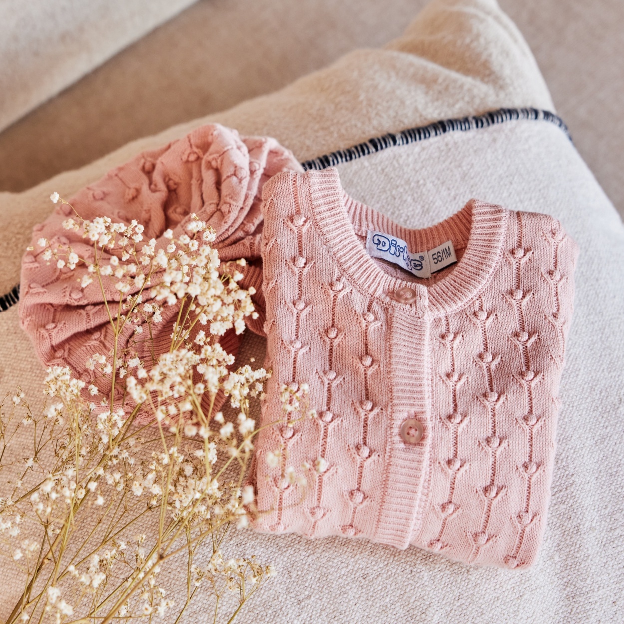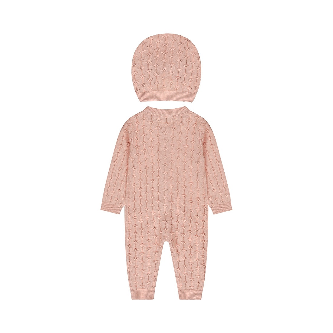 Dit heerlijke super zachte gebreide baby pakje is een mooie oud roze kleur (blushed pink) en heeft geen voetjes. Het pakje heeft lange pijpjes en lange mouwen. Het pakje heeft een prachtig romantisch motief in het breiwerk zitten en heeft een knoopsluiting. Bij het pakje zit een bijpassend mutsje, het mutsje heeft hetzelfde meisjesachtige motief en een knoop op de voorzijde. Het pakje heeft een ronde hals en boorden aan de mouwen en pijpen. Het is ook een prachtig geboortepakje.