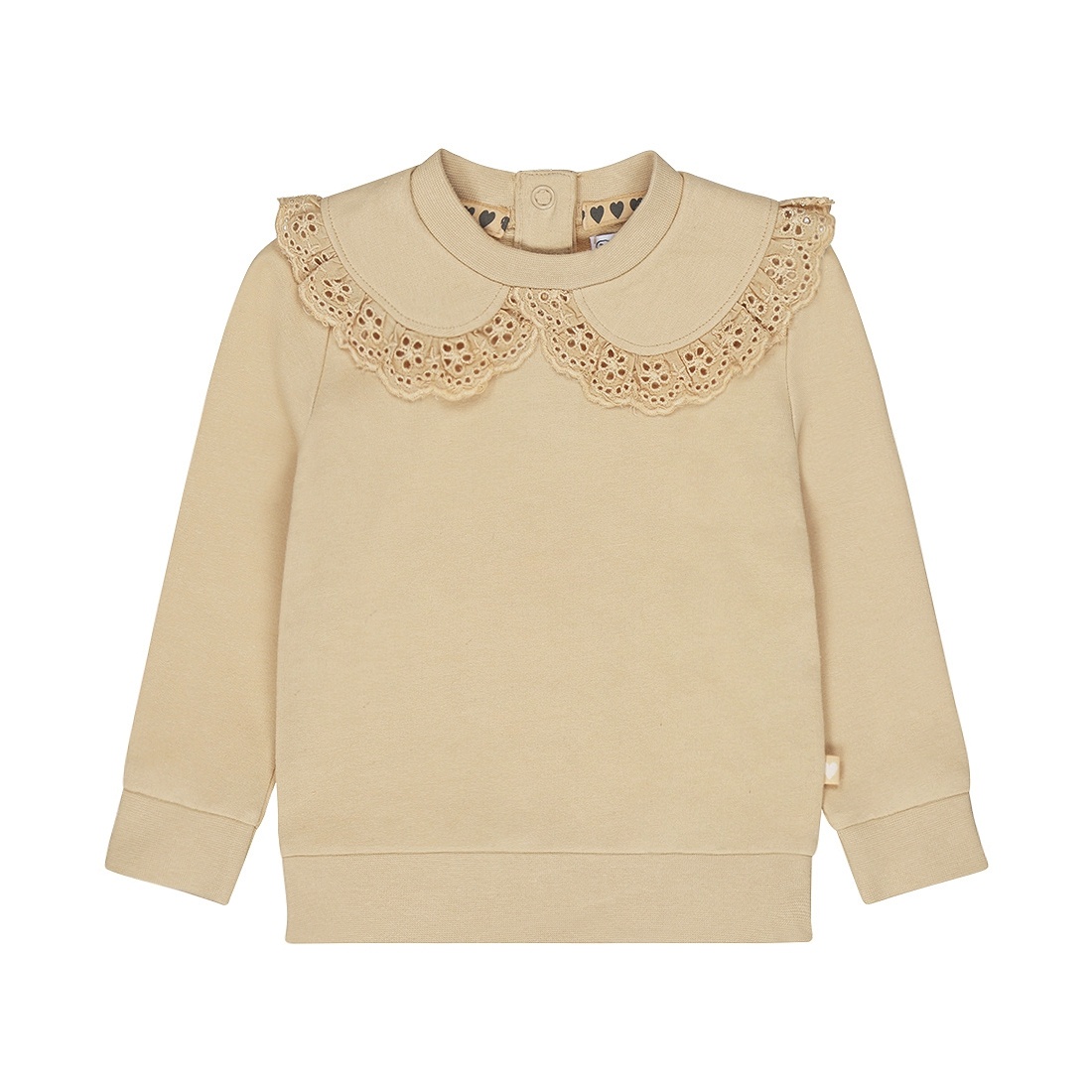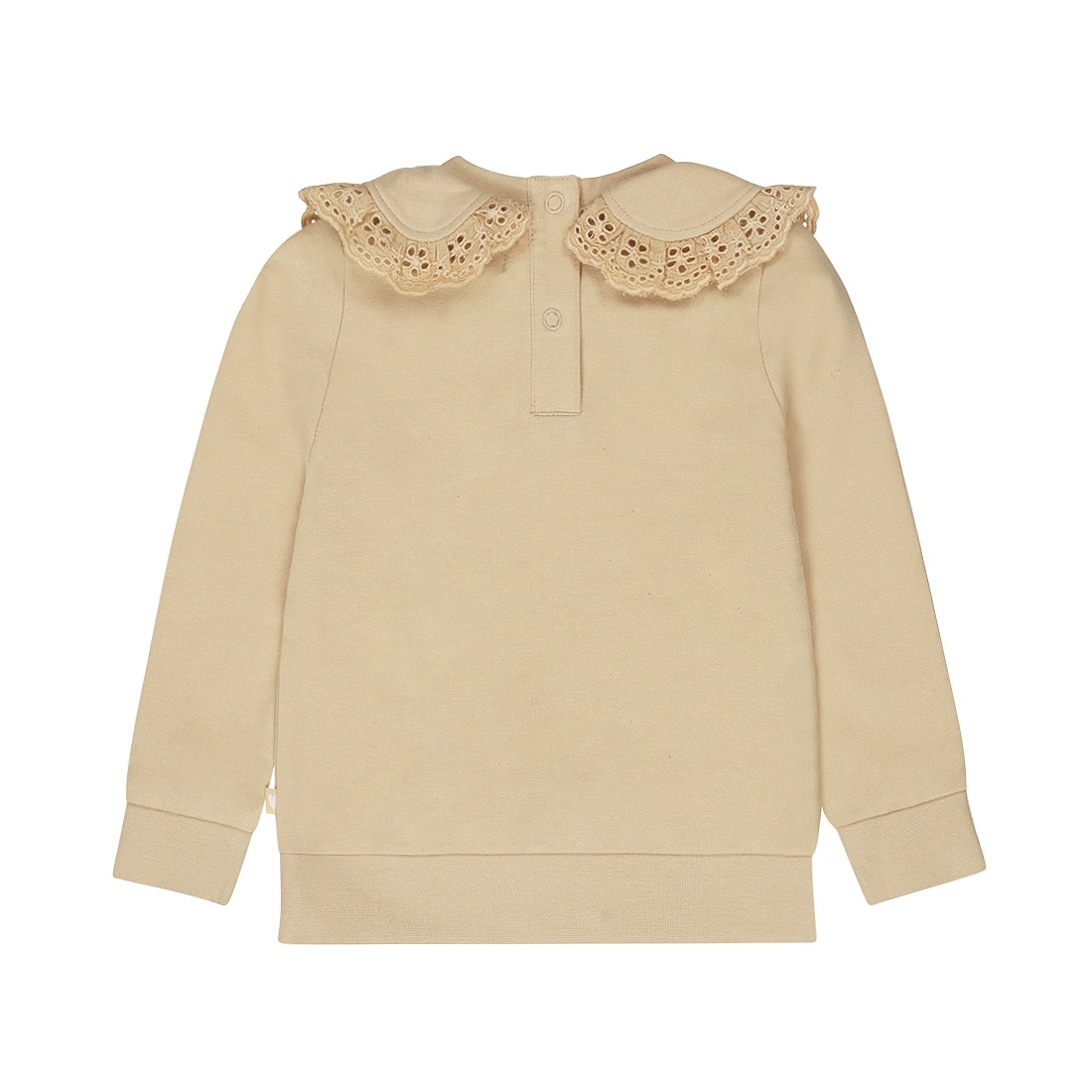 Dit prachtige truitje is een donkere beige kleur (dark sand) en heeft aan de kraag een ruffle met een randje van kant. De sweater heeft een ronde hals met drukknop sluiting aan de achterkant. De trui heeft een elastieke boord aan de onderzijde en aan de uiteinde van de mouwen.