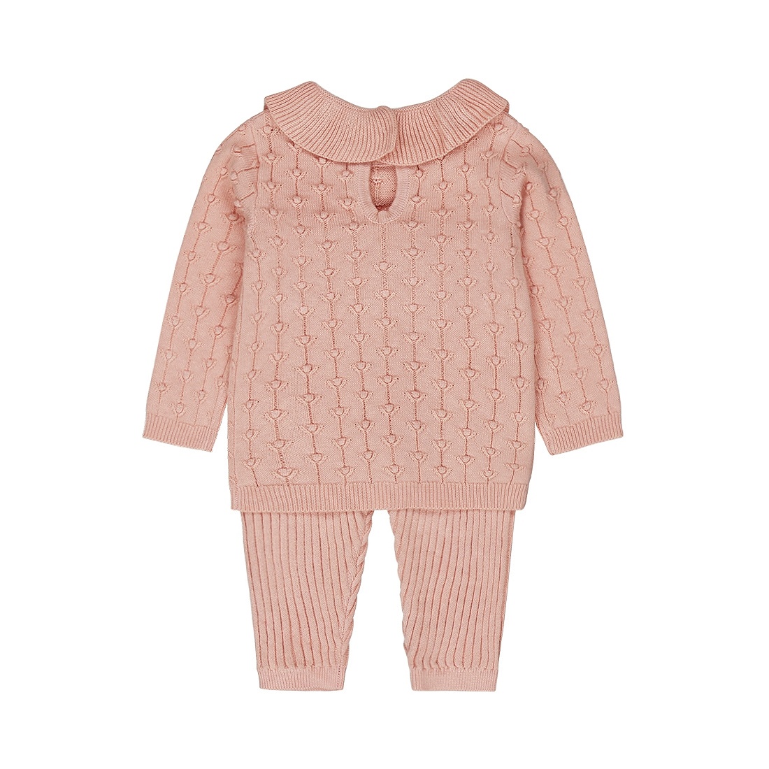 Dit heerlijke setje van het mooie Nederlandse baby merk DIRKJE is tweedelig en bestaat uit een legging en trui welke zijn gebreid. De legging is gemaakt van een prachtige en super comfortabele ribstof, De trui heeft een prachtige ruches kraag en heeft een prachtig motief in het breiwerk zitten, ook heeft de trui een knoopje in de nek zitten. De set is een prachtige kleur oud roze met de naam blushed pink. Dit heerlijke setje is een echte aanrader om te geven bij de geboorte of op de babyshower.