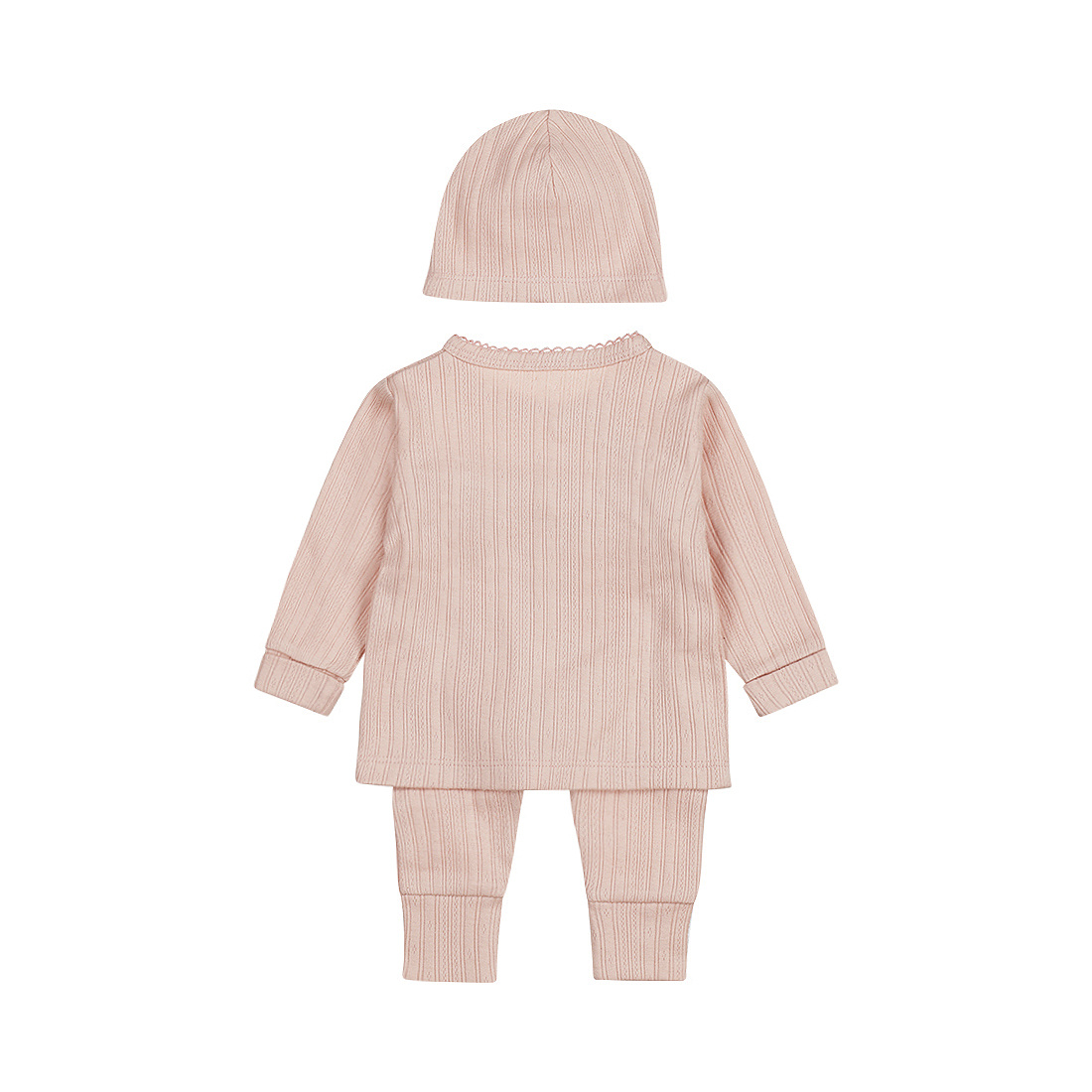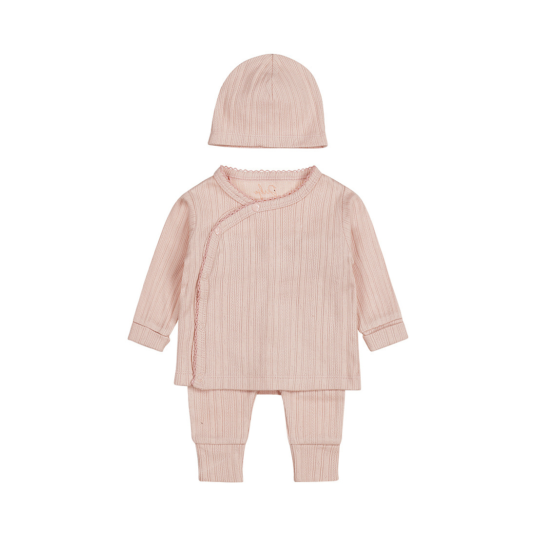 Dit 3 delige pakje in de kleur roze bestaat uit een top, muts, en legging/broekje van dezelfde stof en kleur. De stof heeft een werkje in de stof zitten wat lijkt op een borduursel voor een luxere uitstraling. De top sluit door middel van drukknoopjes en de sluiting zit schuin net of het een overslag is. De stof is gemaakt van 100% organische katoen hierdoor help je mee aan een beter milieu.