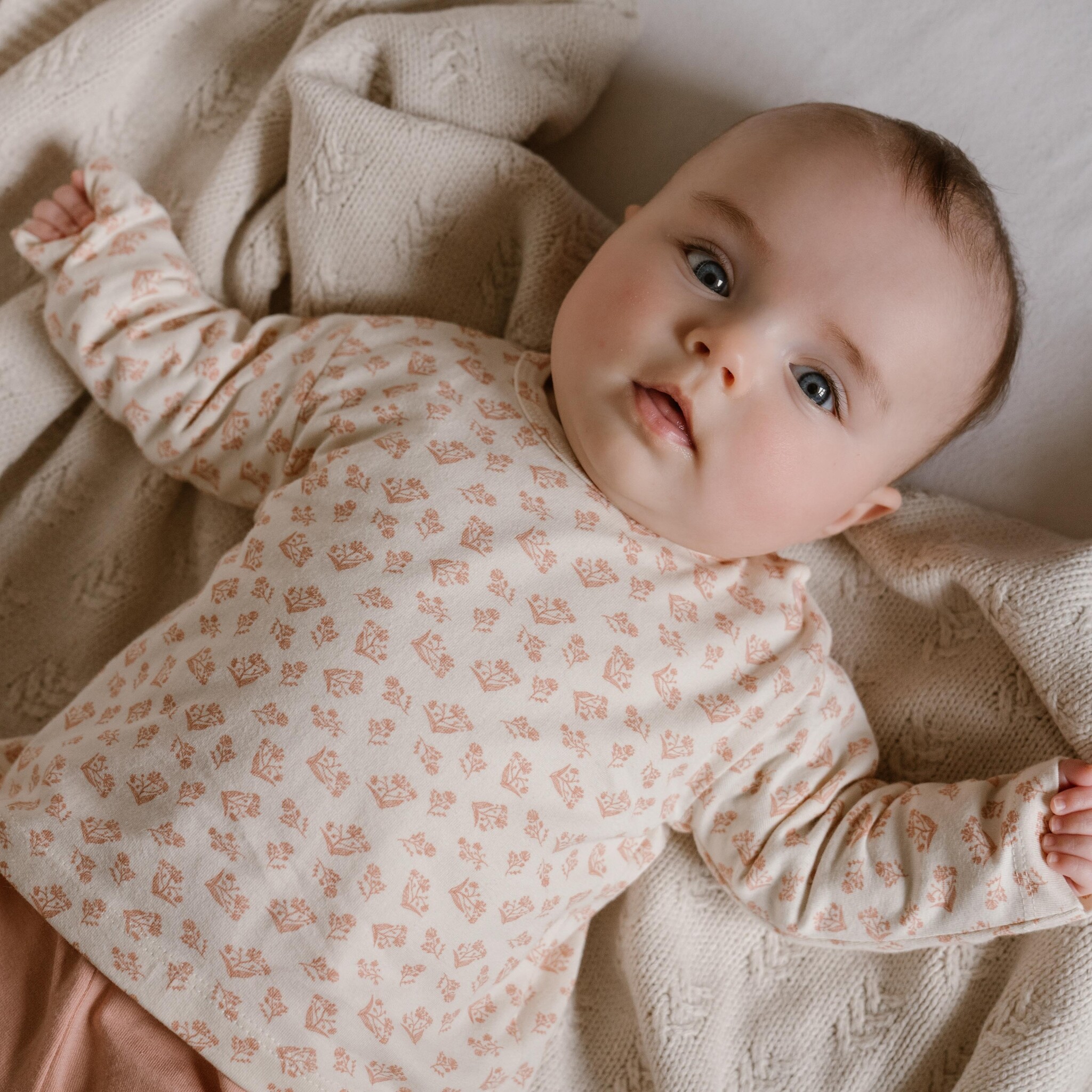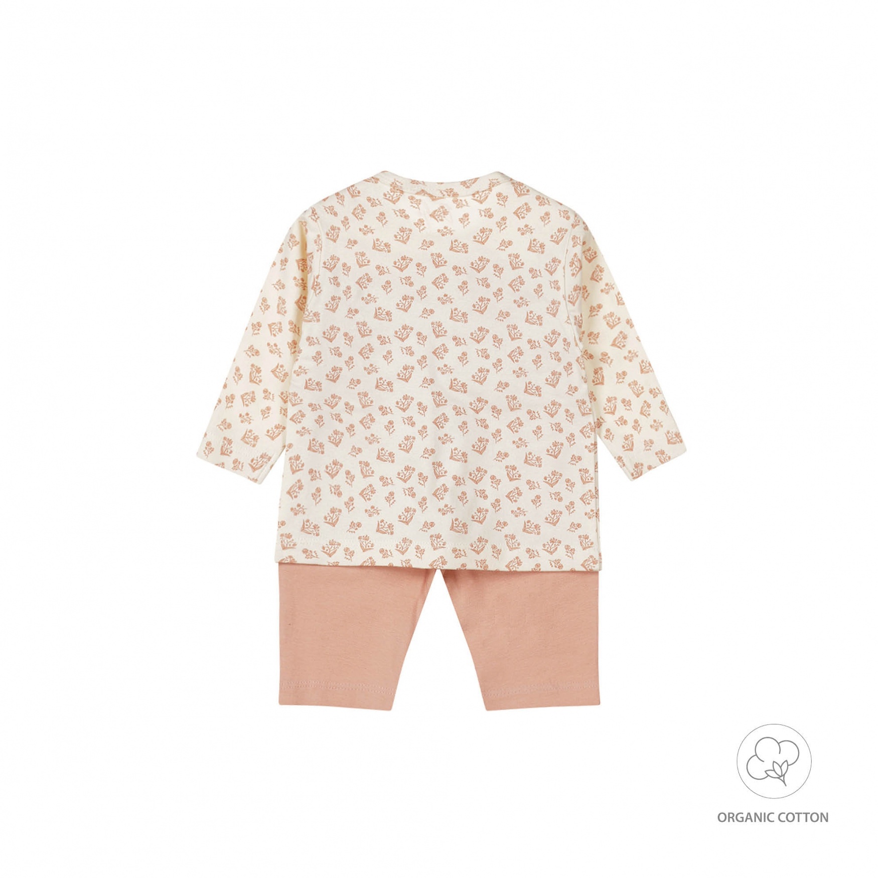 Dit super leuke en lieve pyjamaatje is van het baby en peuter merk DIRKJE, de pyjama bestaat uit een oud roze broekje met lange pijpjes ene elastische tailleband, het tweede deel van de pyjama is een t-shirt met lange mouwen, het shirt is beige van kleur met in dezelfde kleur oud roze een bloemetjes motief, ook heeft de top drukknoopjes op de schouder zitten voor gemakkelijk aan en uitkleden. De pyjama is voor het grootste gedeelte gemaakt van organic Cotton, dit pakje shop je dus duurzaam.