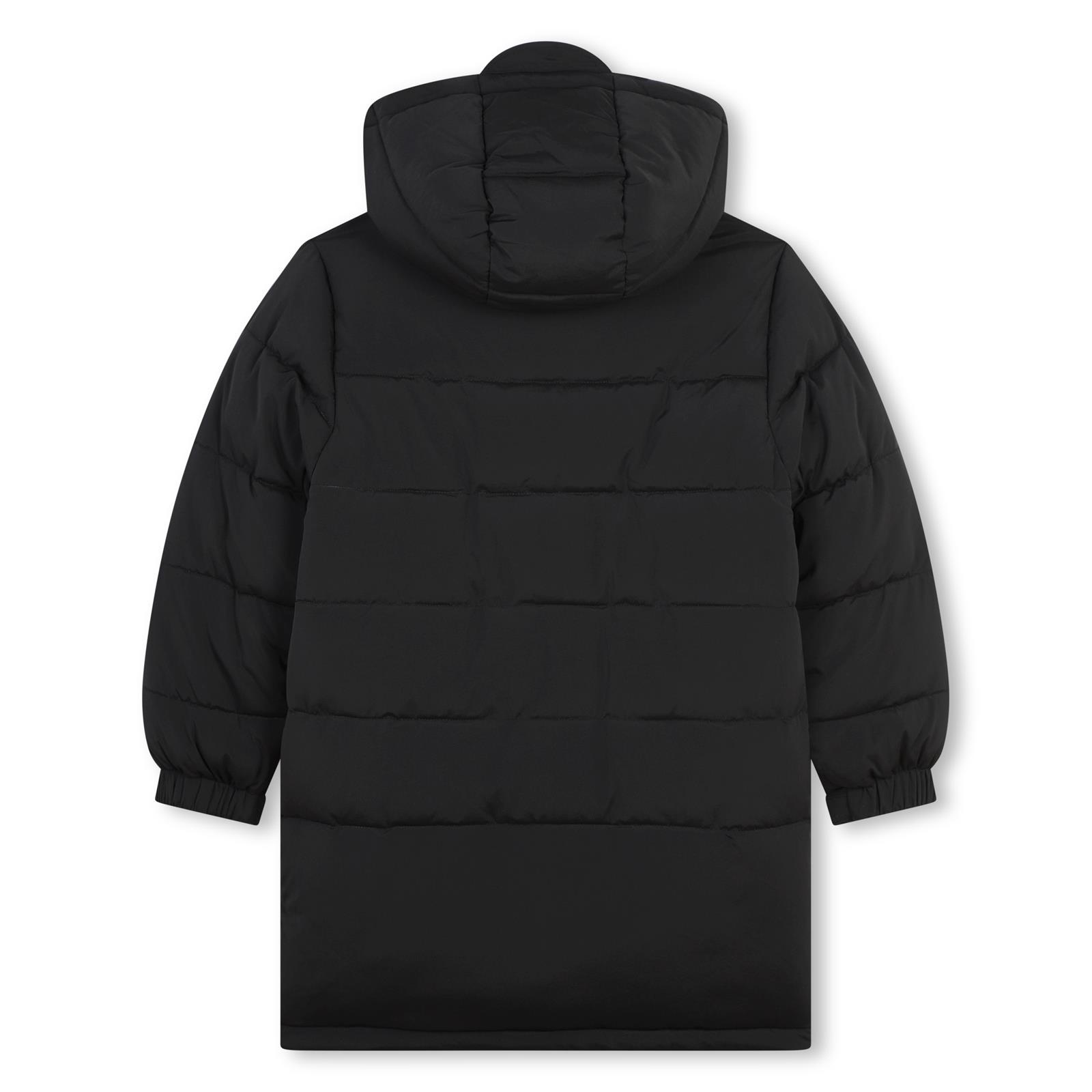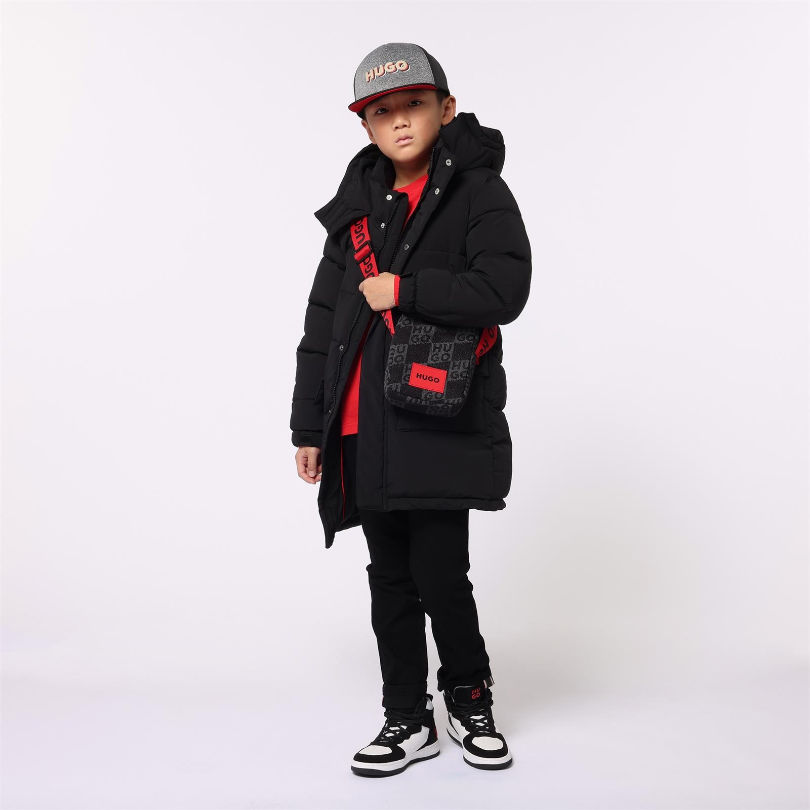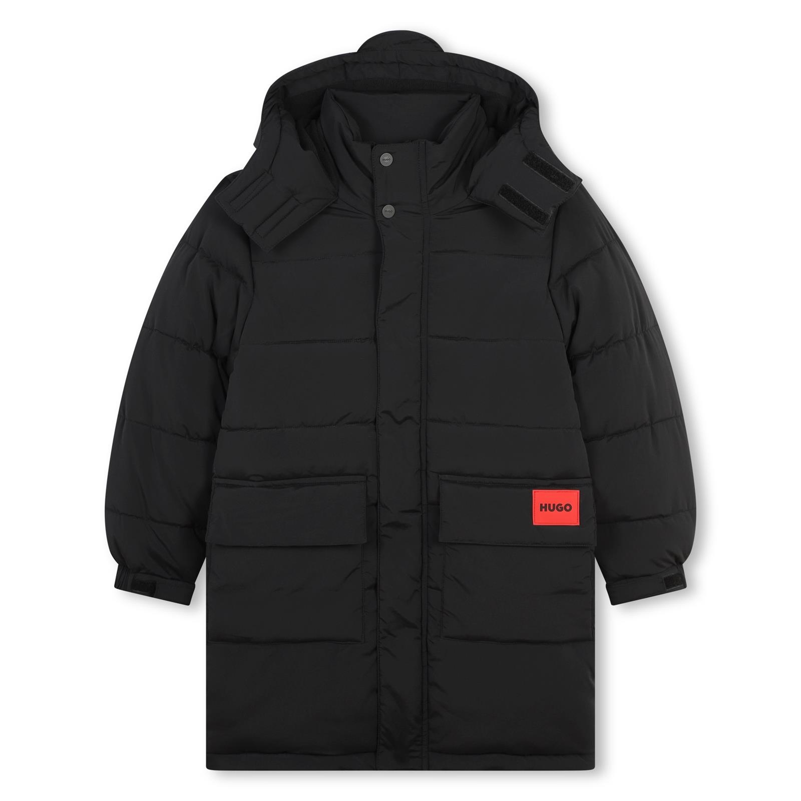 Deze heerlijke halflange winterjas is van het stoere MERK HUGO, HUGO is een onderdeel van het begrip HUGO BOSS. De jas is zwart van kleur en heeft een capuchon, ook heeft de jas twee klep zakken voor waar het merk logo in het rood op staat op de linkerzak. De jas heeft een ritssluiting drukknopen, langs de capuchon en mouwen zit een klittenband sluiting. De jas is een echte winterjas en perfecte voor de koude winterdagen. De voering van de jas is van fleece.