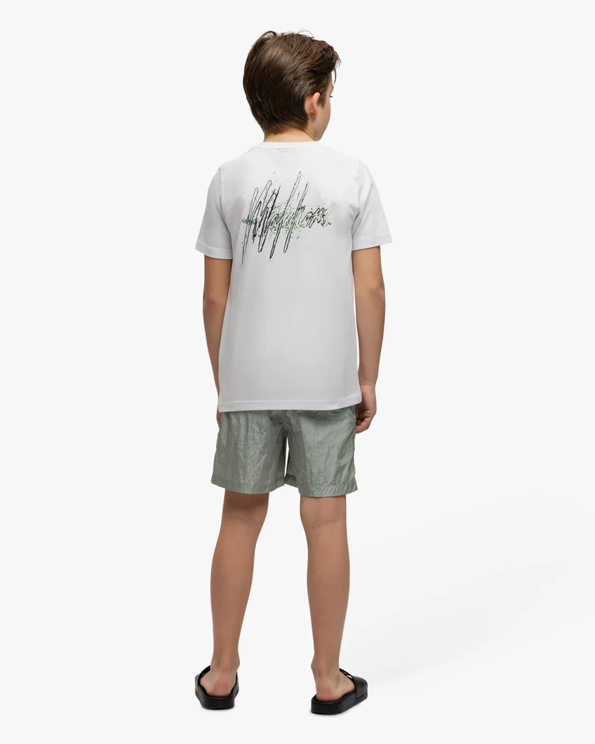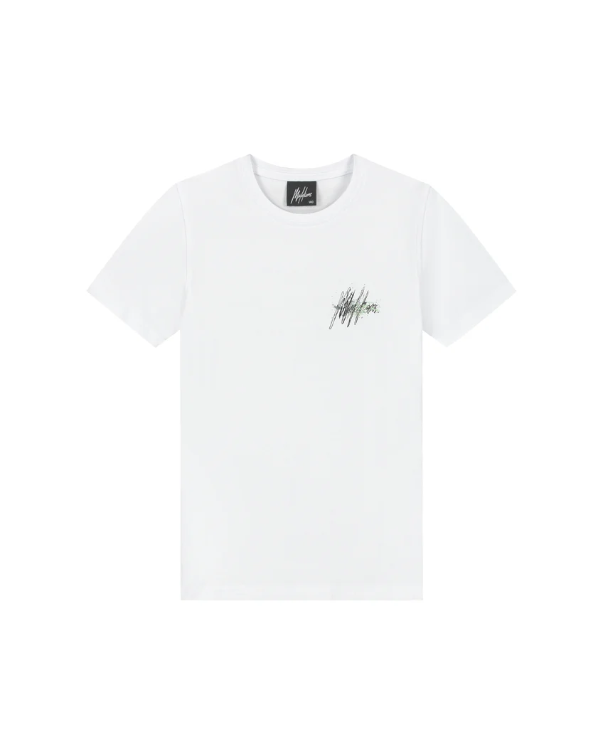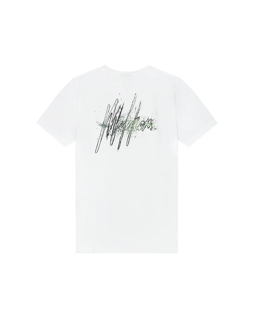 Heerlijk fris wit t-shirt van MALELIONS, het shirt heeft korte mouwen en een ronde hals. Het t-shirt heeft op de voorzijde een kleine opdruk op de borst met het merknaam logo in de splash (spetters) stijl, op de achterzijde vind je dit zelfde logo in het groot in de kleuren zwart en groen.