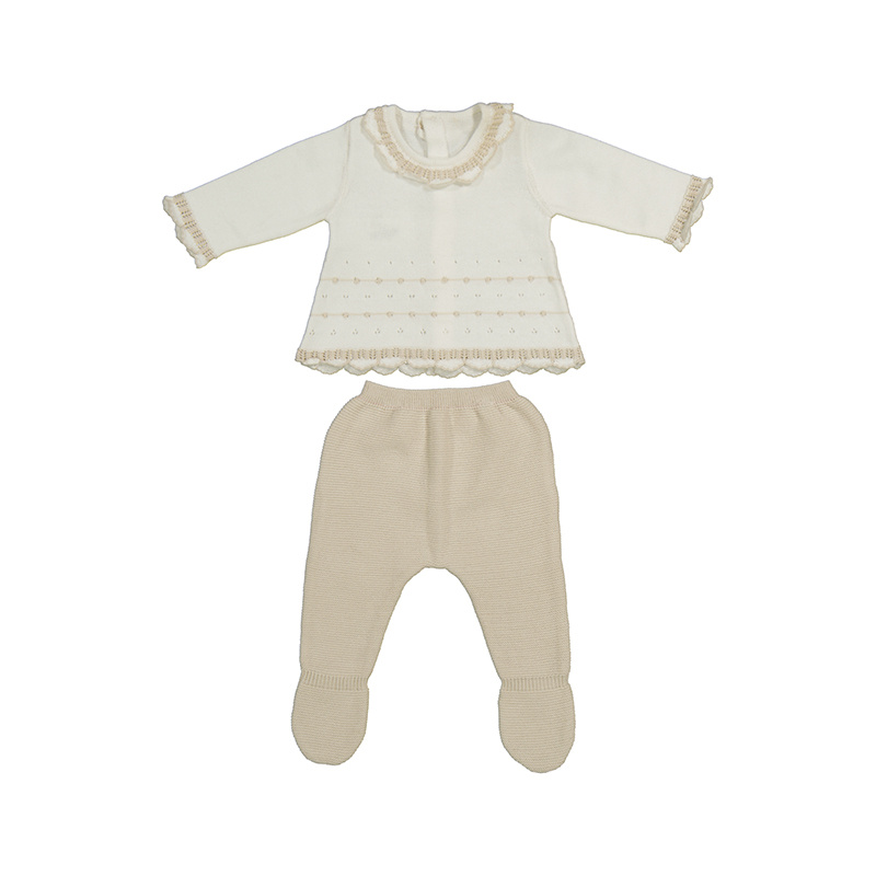 Deze super mooie set is gebreid en bestaat uit een een lang broekje met voetjes in een hele mooie zand kleur en een top met lange mouwen, de top is beige van kleur en heeft een mooi werkje erin en zand kleurige details, ook heeft het hele mooi schulp details bij de kraag, onderzijde en mouwen. De top heeft knoopjes op de rug voor het gemakkelijk aan en uittrekken, het broekje is een slip on model wat wil zeggen zonder sluingen wat het erg gemakkelijk in gebruik maakt. Het breiwerk geeft het setje een echte Spaanse uitstraling. De kleur naam van de set is Piedra. Het setje wordt geleverd met een cadeau doosje wat het een ideaal setje maakt om te geven.