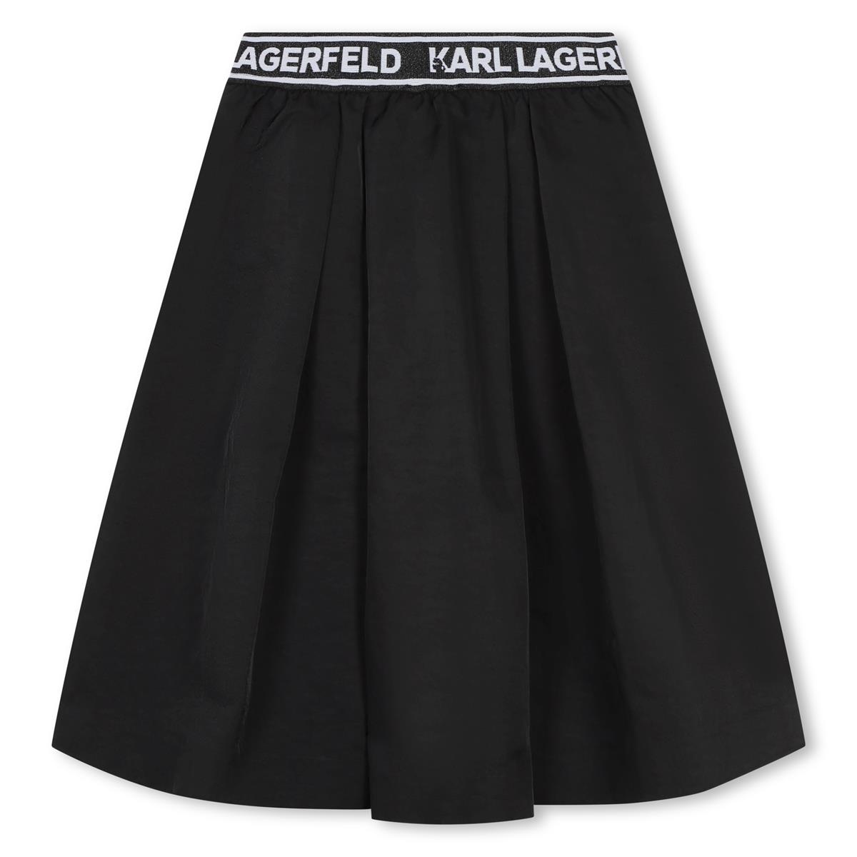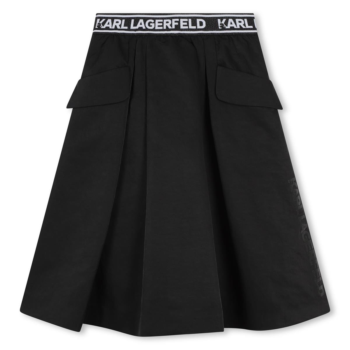Prachtige halflange a-lijn rok met plooien en grove cargo zakken aan beide zijkanten. De rok is zwart van kleur en heeft een elastische tailleband met glitter, op deze band staat in het wit de merk naam erop. De rok is ook voorzien van een onderrok. Combineer de rok met een stoere sweater of klassieke top.
