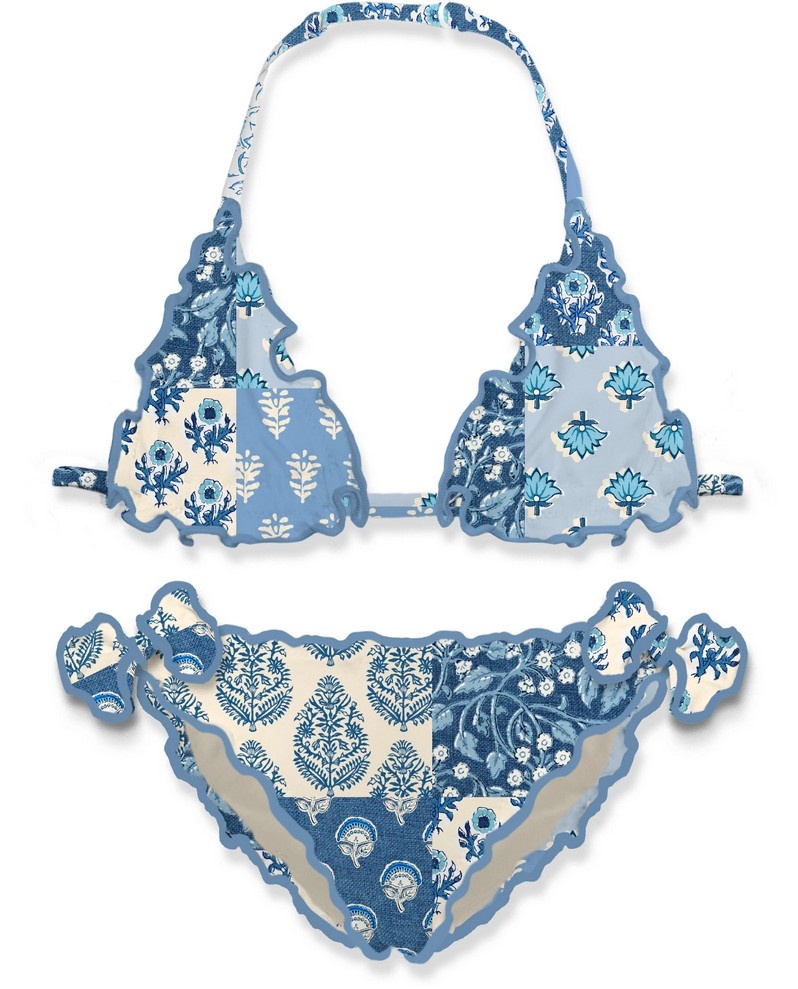 Deze prachtige bikini is blauw/wit van kleur en heeft verschillende printjes door elkaar in dezelfde tinten. De bikini bestaat uit een broekje en uit een topje, het broekje kun je zelf knopen en daardoor zelf stellen in hoe strak of los je hem zou willen, het topje heeft verstelbare bandjes. De bikini heeft als extra detail een super sierlijk schulp randje. Er is bij ons in de collectie ook een bijpassende zwembroek voor de jongens verkrijgbaar! Lekker matchen dus.
