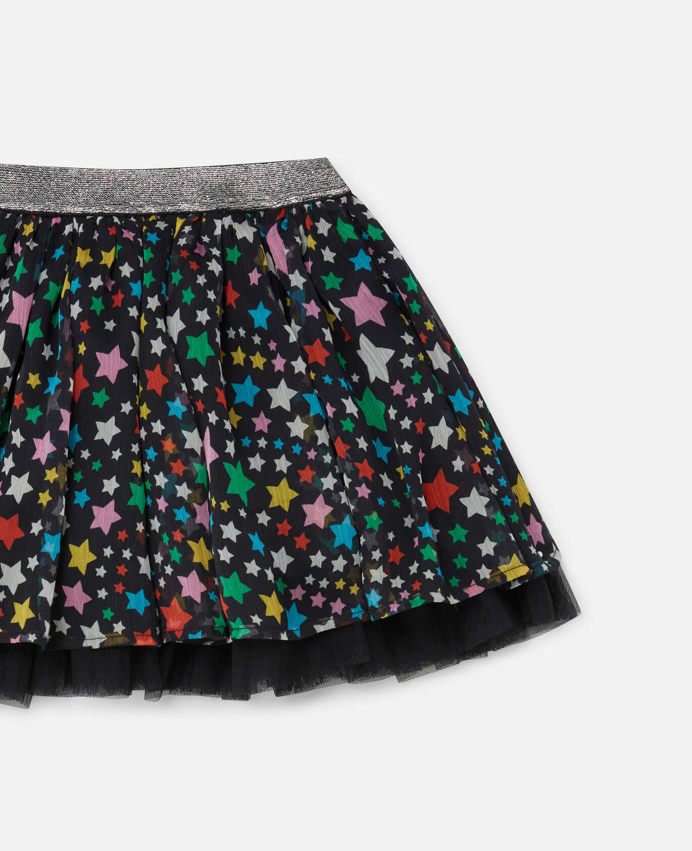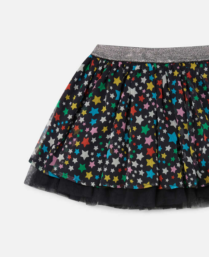 Deze fantastische rok is van het te gekke merk Stella McCartney! De rok heeft alles waar een klein meisje van droomt: Tulle, glitters, sterren en kleur, de rok loopt uit is een A-lijn door de Tulle onderrok. De bovenlaag van de rok heeft een multi color sterren print en een elastische taille band met zilver lurex glitter. Combineer de rok met een sweater, de sterren enkellaarsjes en een panty en jouw mini steelt overal de show.