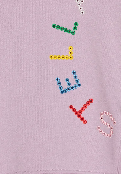 Deze fijne trui van het mooie modieuze merk Stella McCartney is gemaakt in een mooie pastelkleur lila en aan de linkerkant van de trui staat de merknaam in verschillende kleurrijke letters geborduurd in een rond patroon, wat de sweater een hele frisse uitstraling geeft. De trui heeft een ronde hals en boorden aan de onderzijde en uiteinde van de mouwen. Combineer de trui met een verwassen wide leg jeans of leuk op een bijpassende legging van het merk Stella McCartney.