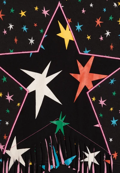 Deze heerlijke zwarte sweater heeft een all over multicolor sterren print en in het midden een grote ster met franjes, deze franjes zitten ook over de lengte van de lange mouwen. De trui heeft een ronde hals en elastische boorden aan de onderzijde en aan de uiteinde van de mouwen. Combineer de sweater met de bijpassende ster laarsjes van het merk en een zwarte legging of een kleurrijke legging en stoere boots.