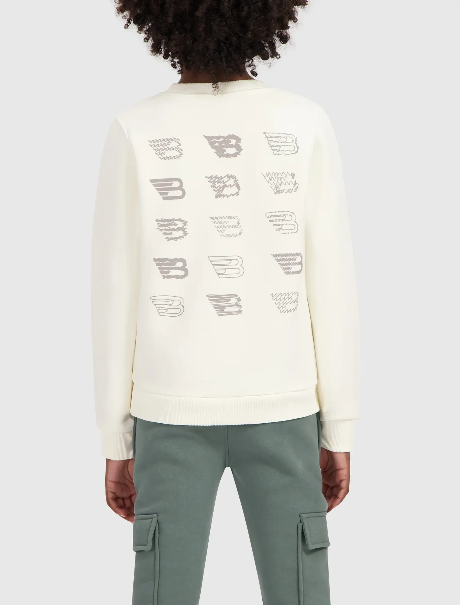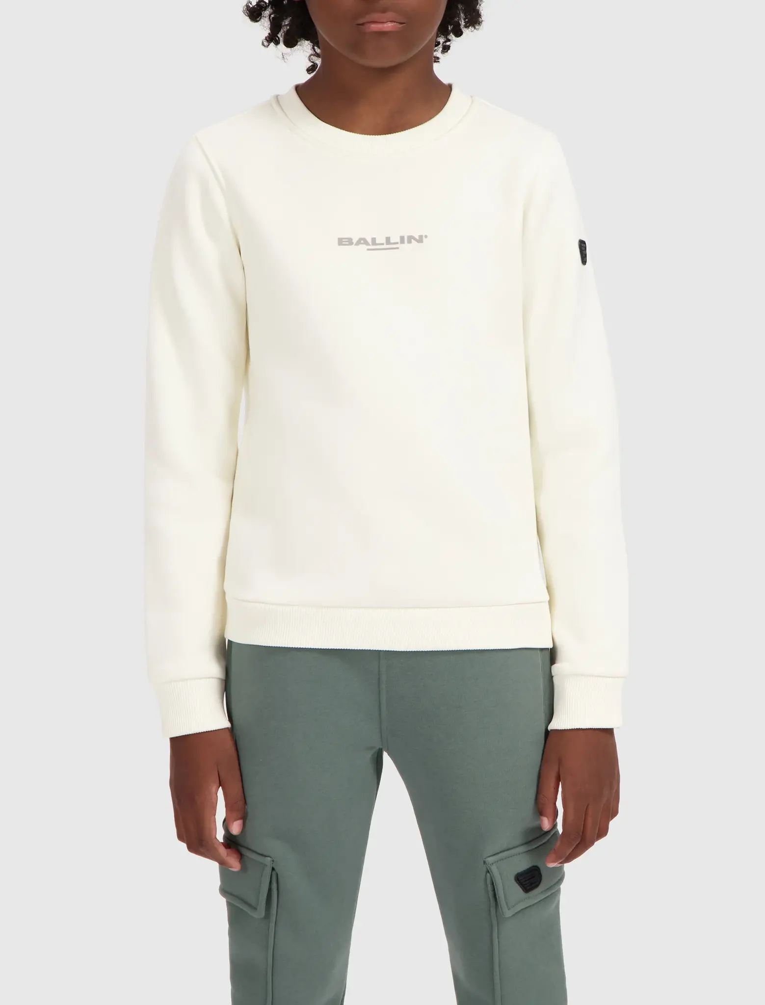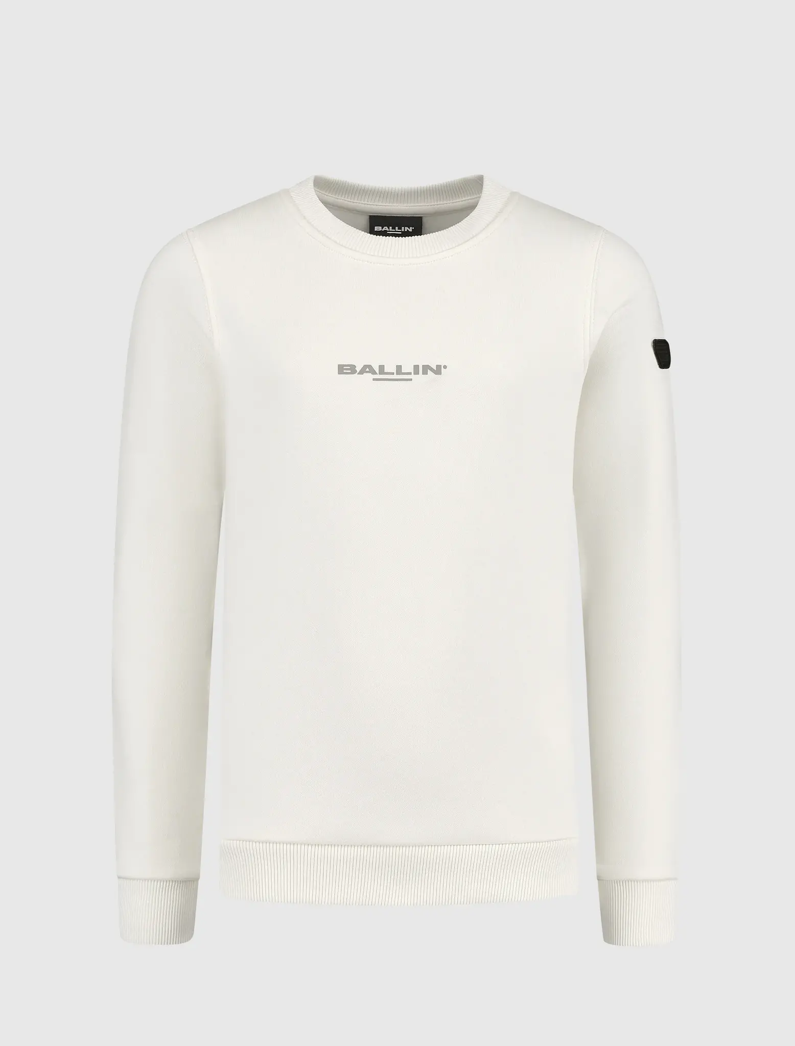 Deze super mooie trui van het gave merk Ballin Amsterdam. De kleur van de sweater is off white en heeft een opvallende pigmentprint van het woordmerk logo op de borst en gave opdrukken van het logo op de achterzijde. De trui heeft een ronde hals en boorden aan de mouwen en onderzijde. Het merk embleem zit op de linkerarm. De trui is een slim fit en hoort aangesloten te vallen.