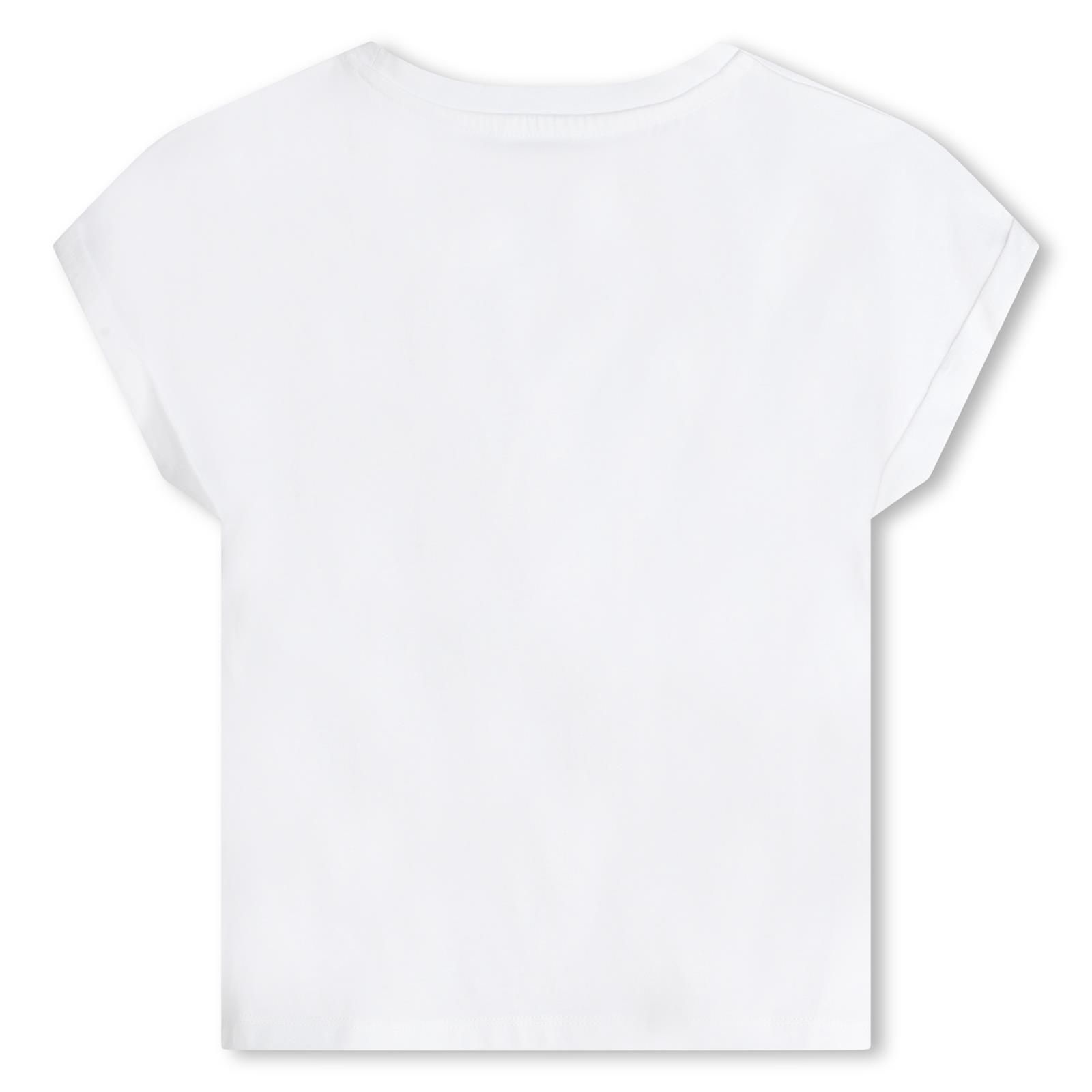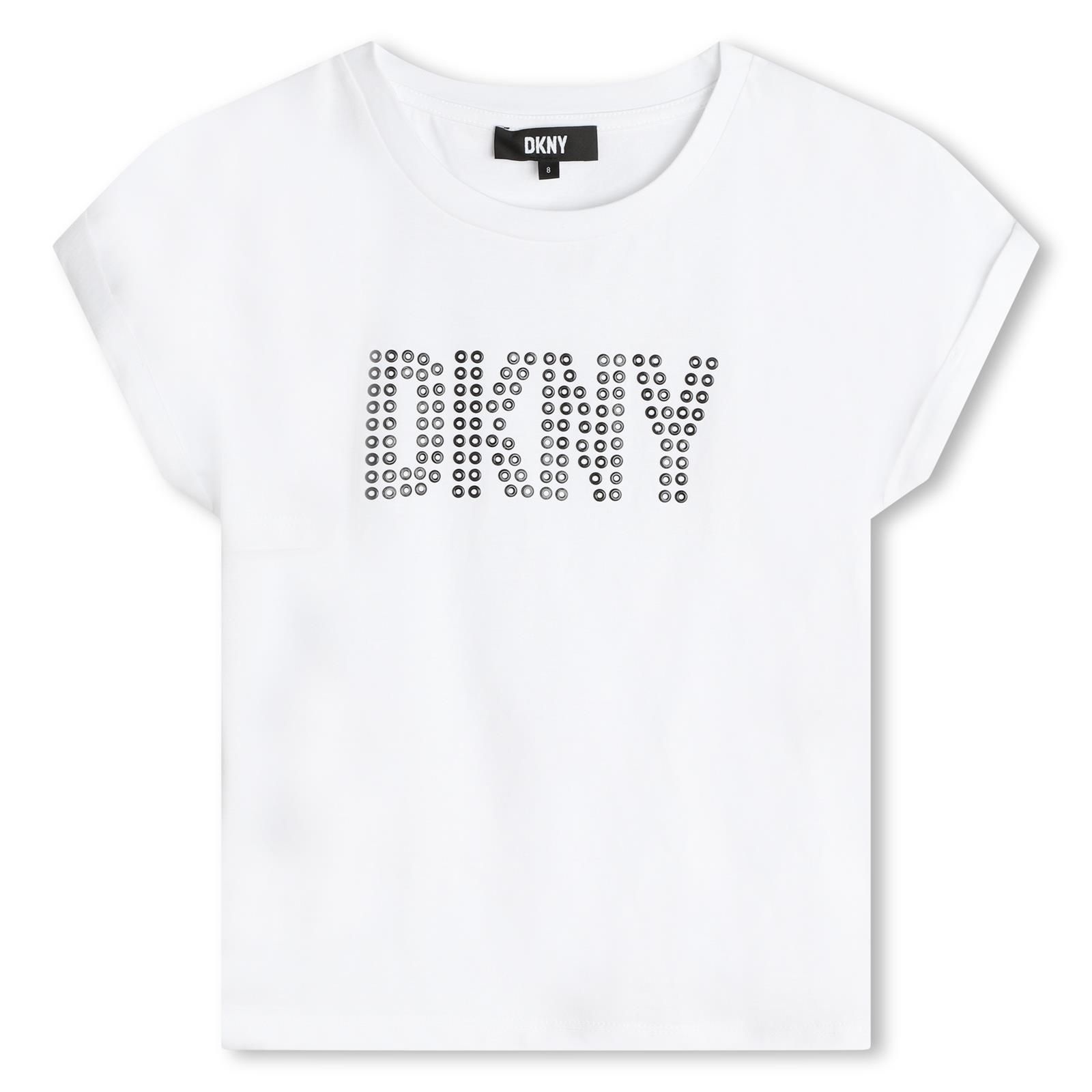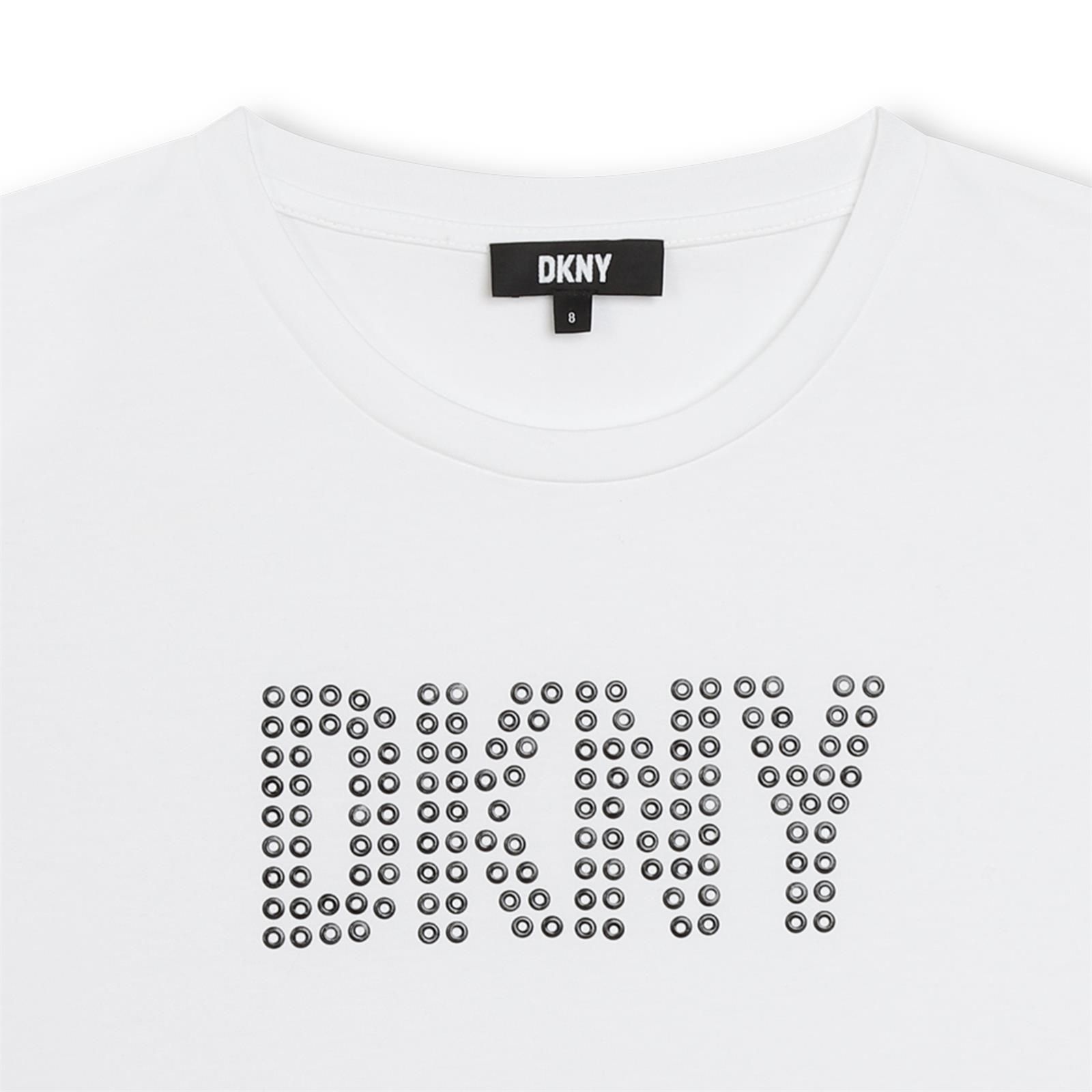 Heerlijk basic wit t-shirtje van DKNY voor de meiden is afgewerkt met het logo op de borst in zilveren rondjes.