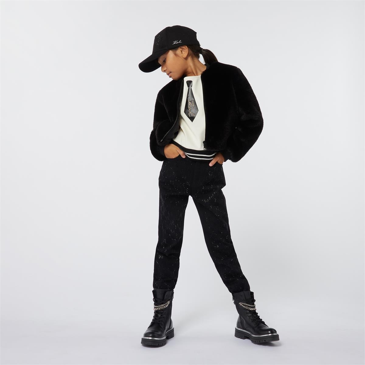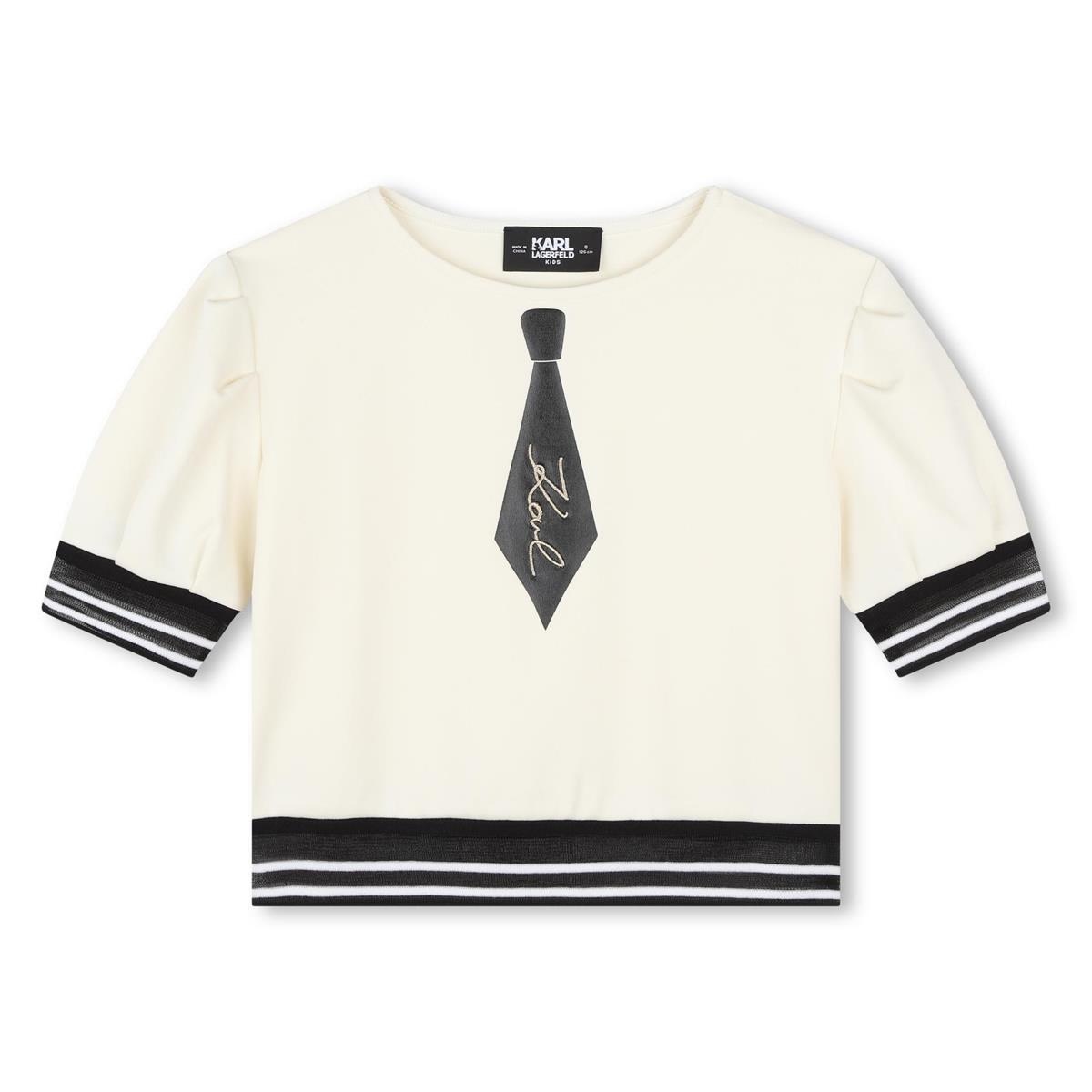 De signatuur van Karl Lagerfeld himself was natuurlijk zijn stropdas welke hij altijd droeg, dit kenmerk heeft het merk super mooi doorgevoerd in deze top. De top is ivoorkleurig met een zwarte band rondom de onderzijde en mouwen, De top heeft pofmouwen en als opdruk een zwarte stropdas waar Karl met goud garen op geborduurd is. Het t-shirt valt iets korter op de broekband en de band rondom de mouwen is iets doorschijnend. De top is van een mega rijke en dikke stof. Combineer de top op een grijze jeans of zwarte flair voor een casual look maar combineer de top op bijvoorbeeld de mooie luxe rok van dit merk is het de perfecte feest outfit.